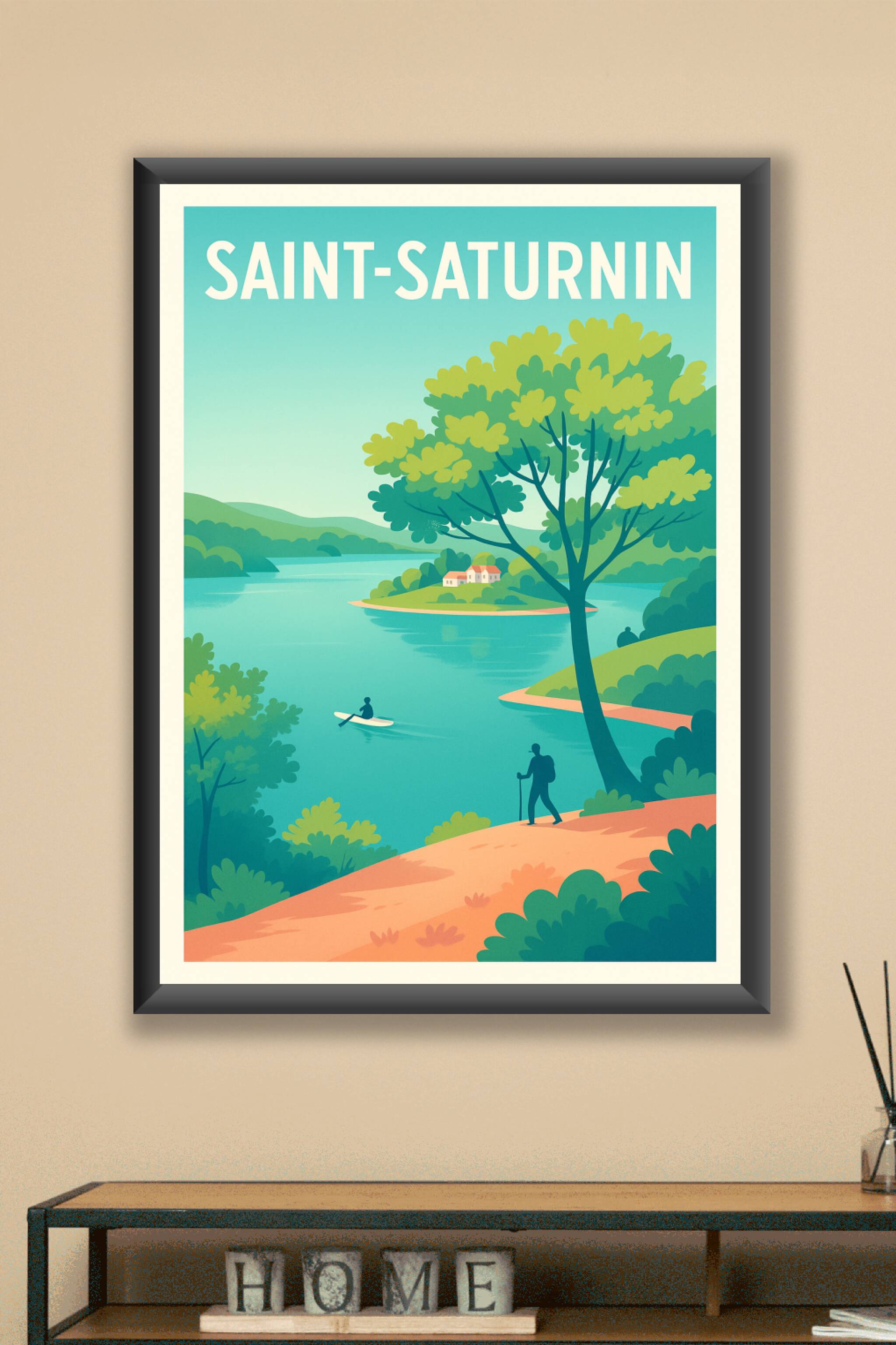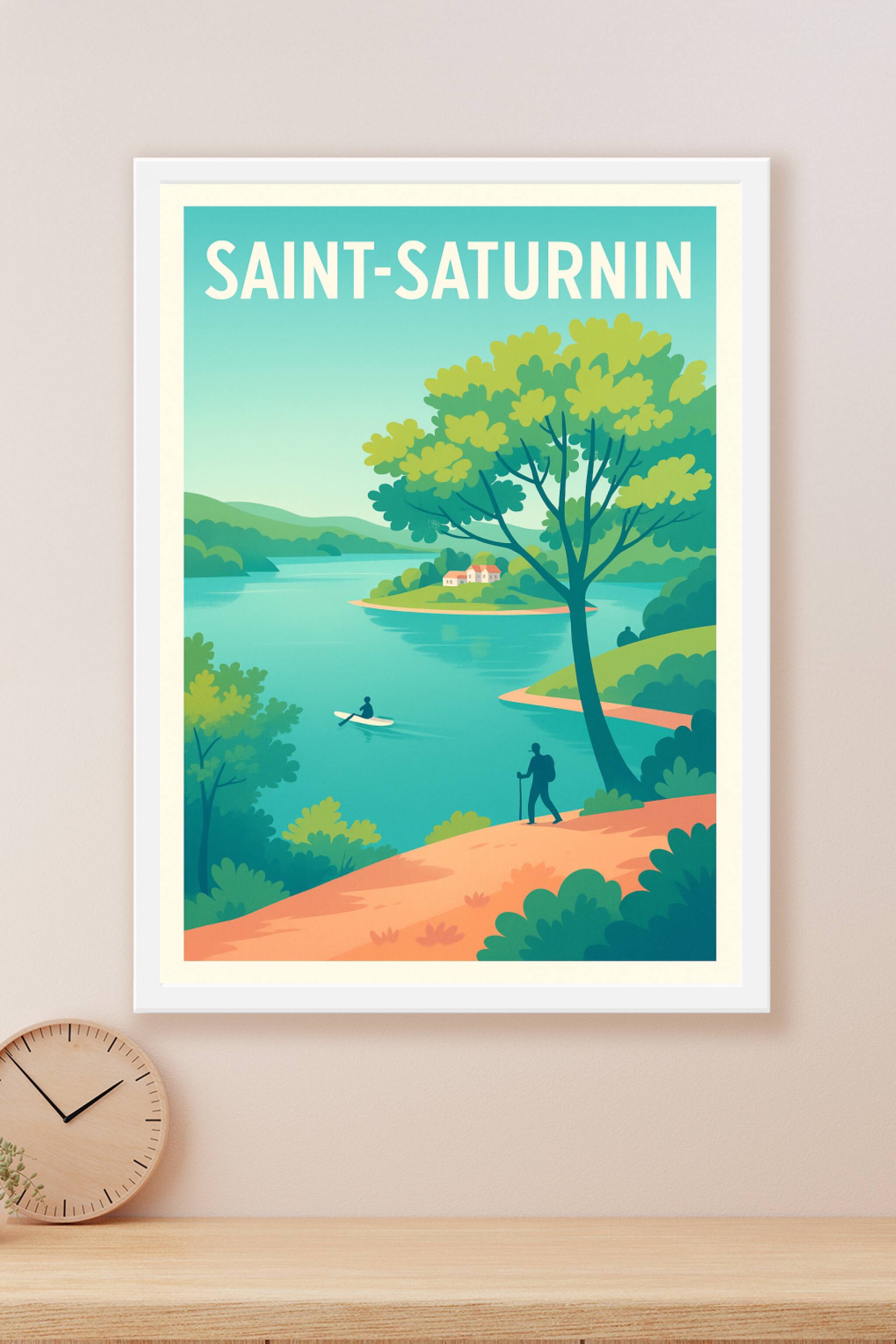 Découvrez la sérénité de Saint-Saturnin avec cette affiche au style épuré et coloré illustrant un paysage paisible au bord d'une rivière. L'affiche...
