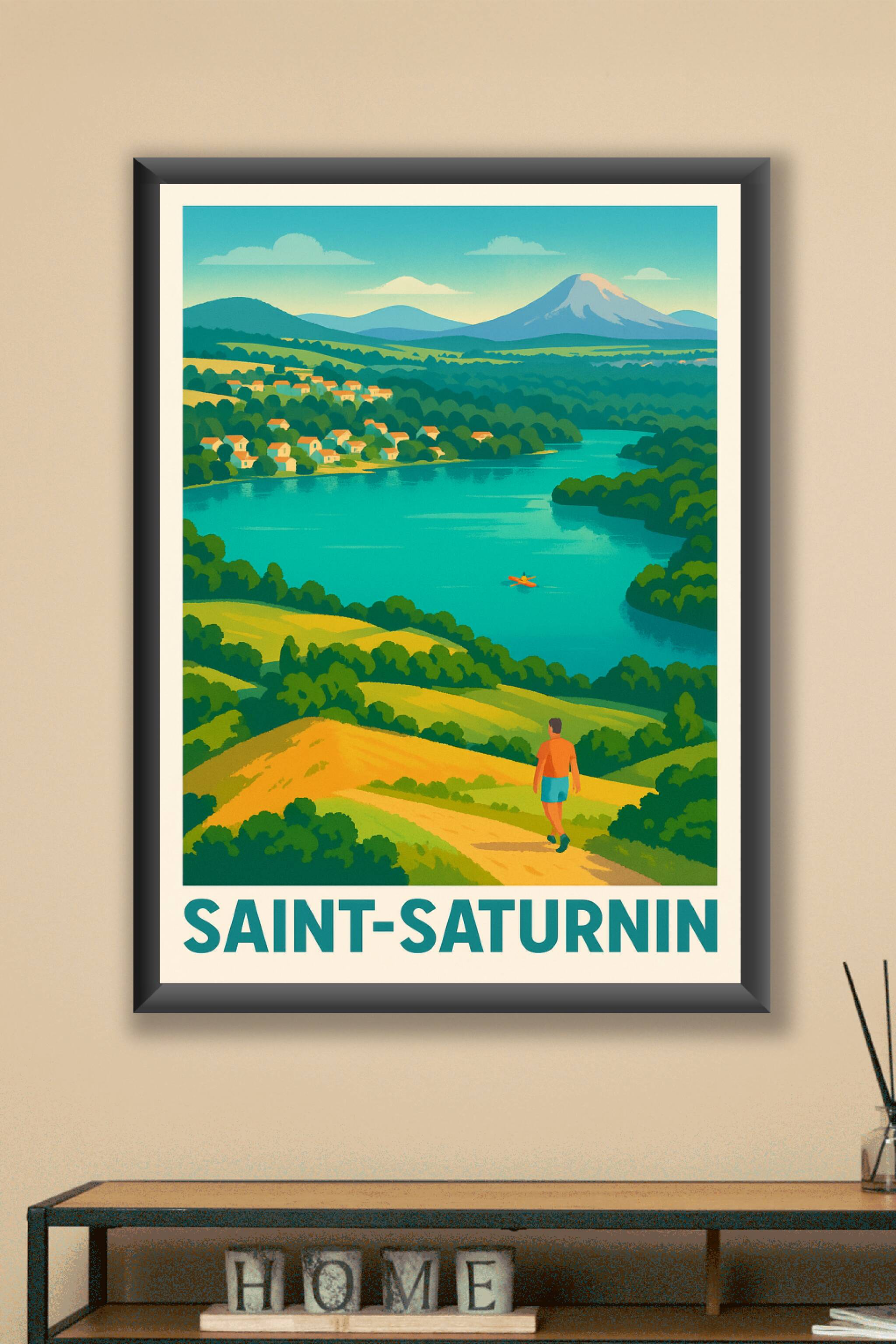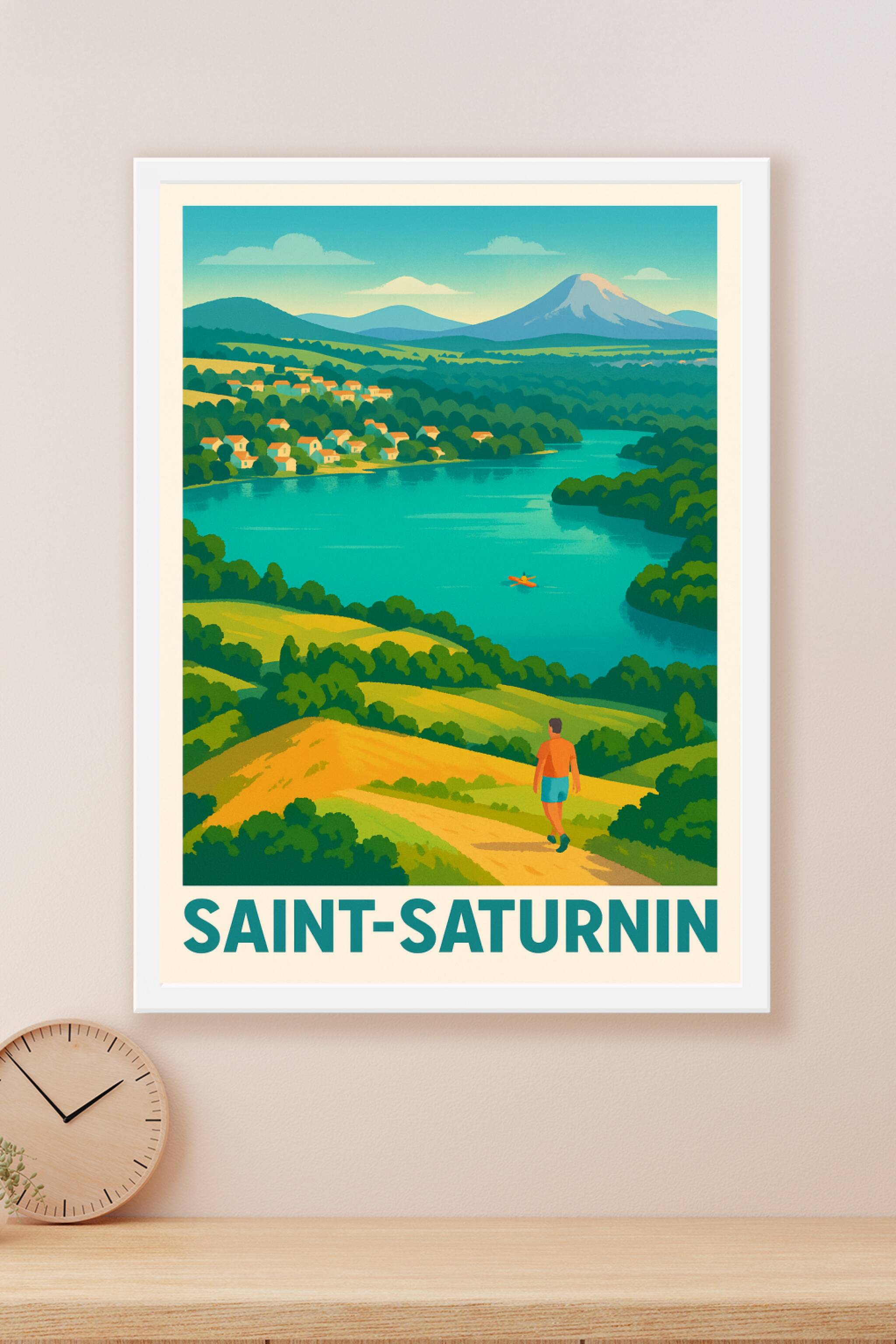 Découvrez la sérénité et la beauté naturelle de Saint-Saturnin avec cette affiche illustrée au style vintage et coloré. Admirez les collines verdoy...
