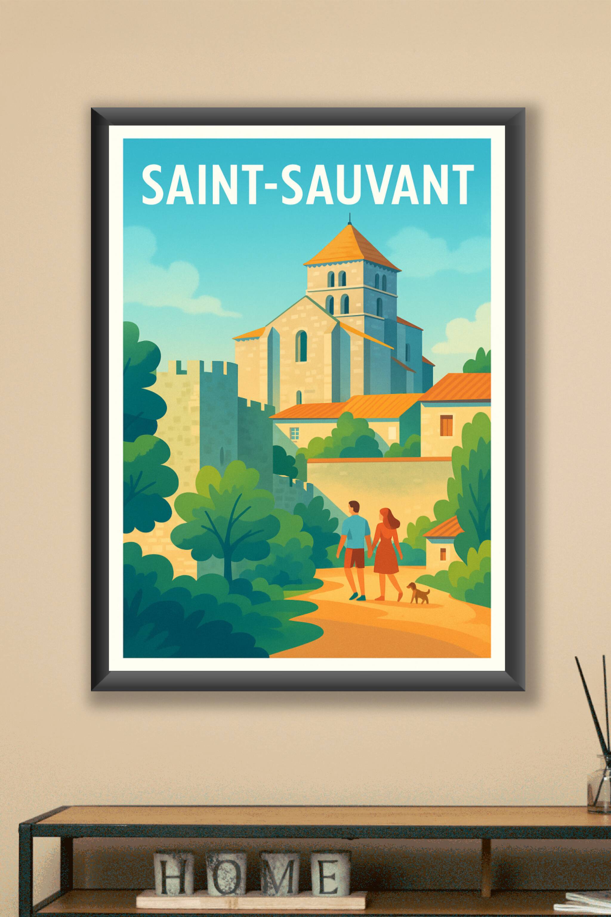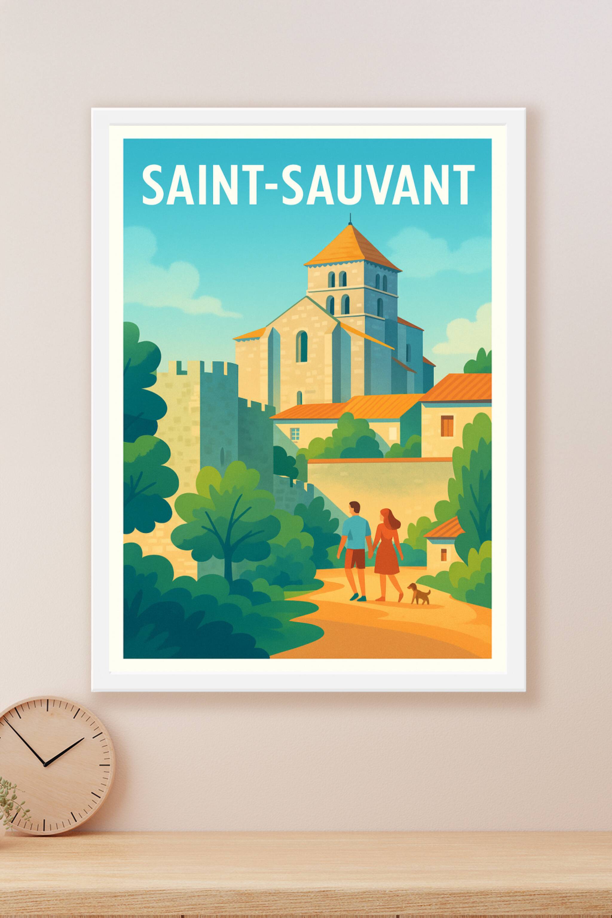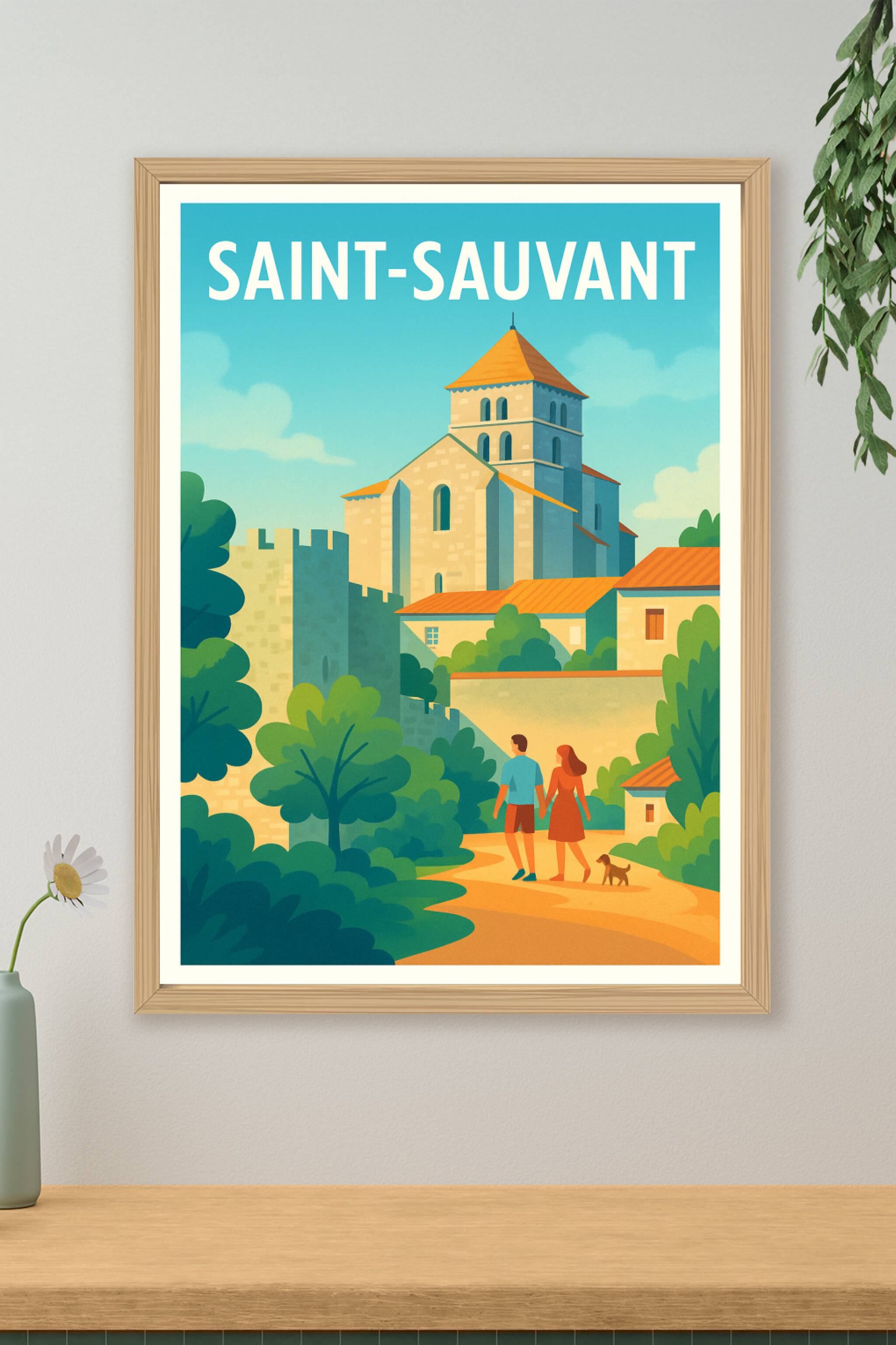 Découvrez l'élégance intemporelle de Saint-Sauvant avec cette affiche illustrée qui met en scène ses pierres anciennes et ses toits colorés baignés...