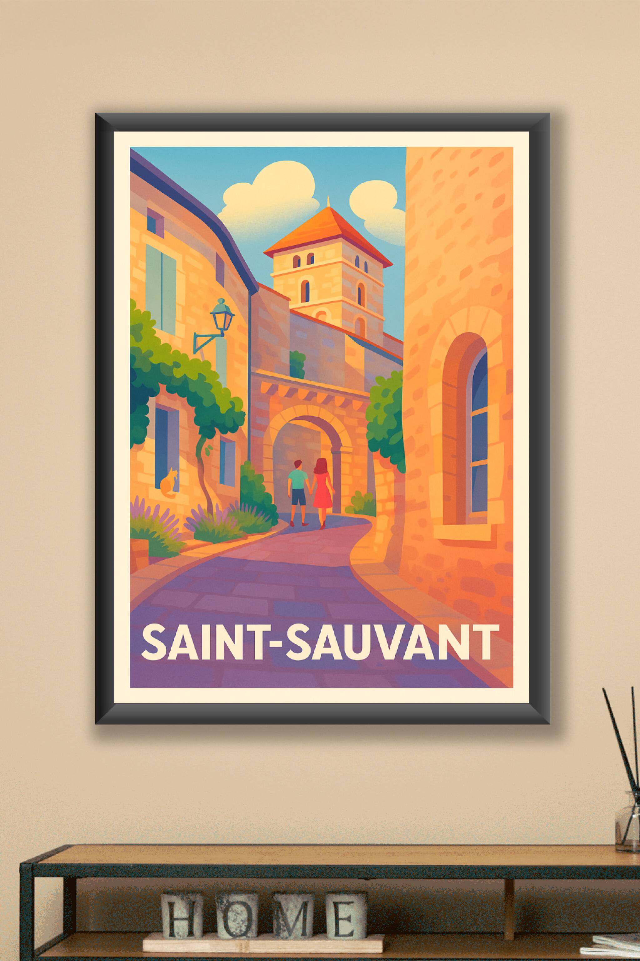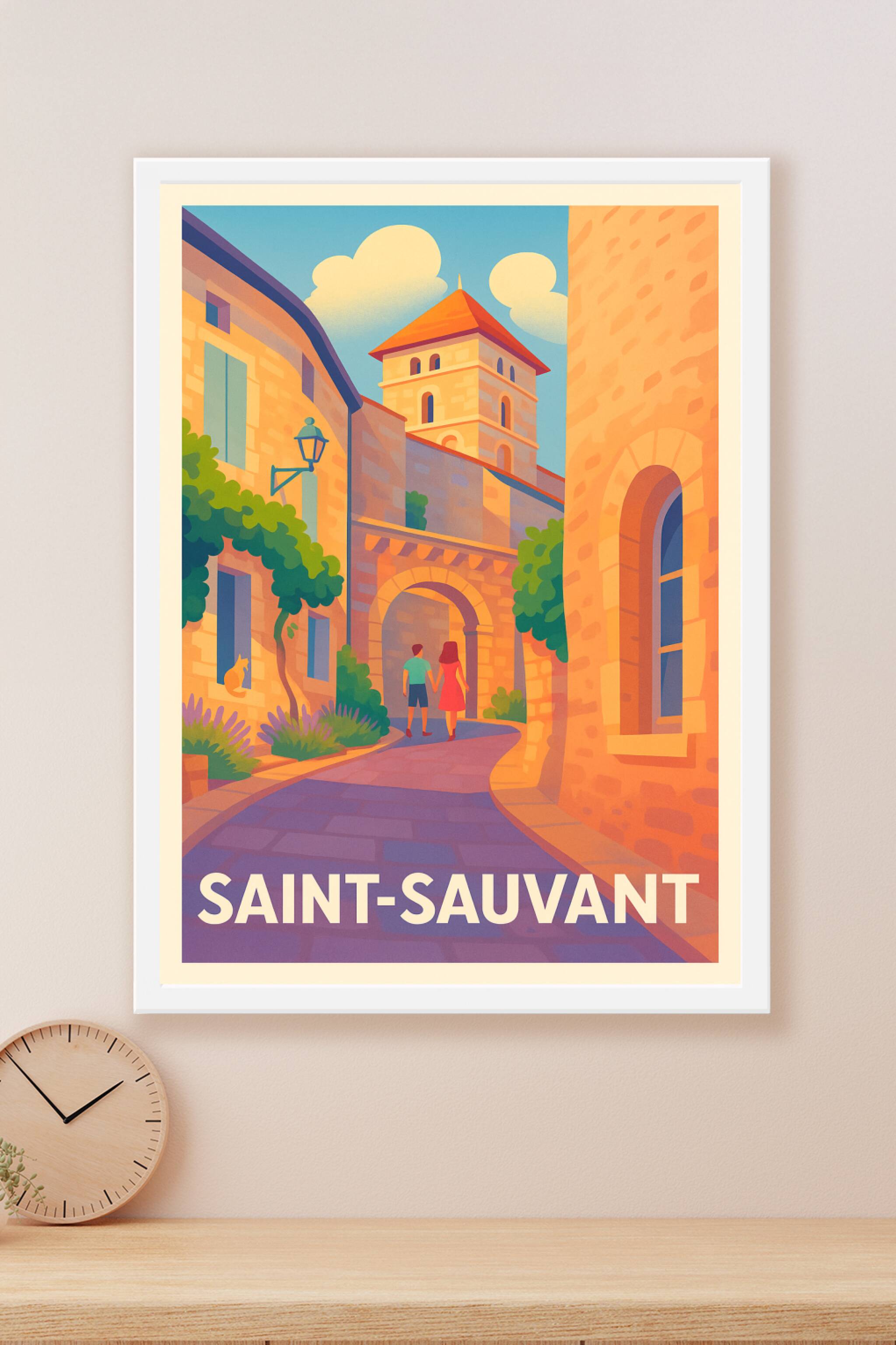 Découvrez le charme intemporel de Saint-Sauvant avec cette affiche artistique illustrant une ruelle typique baignée par une lumière douce et chaleu...