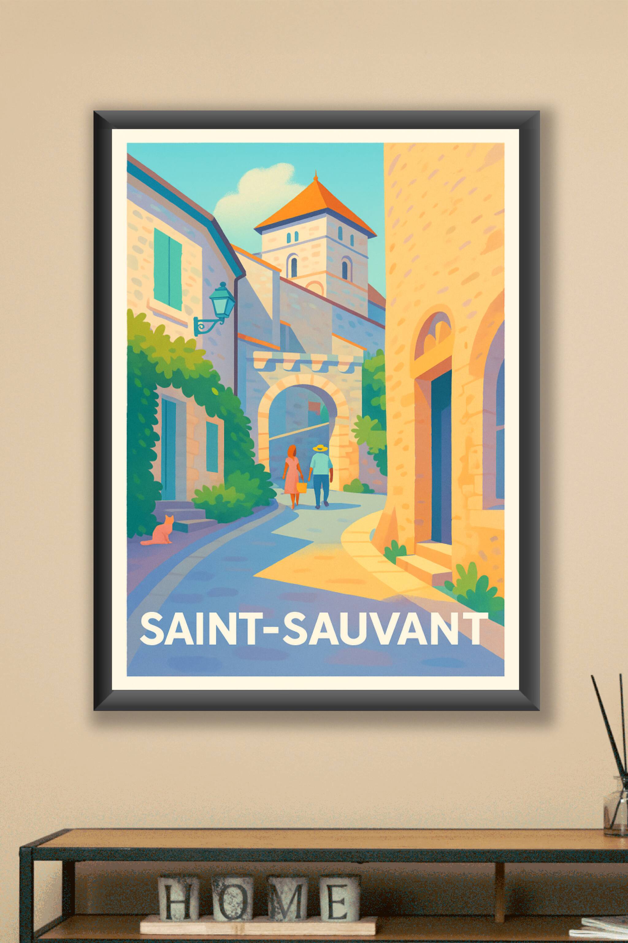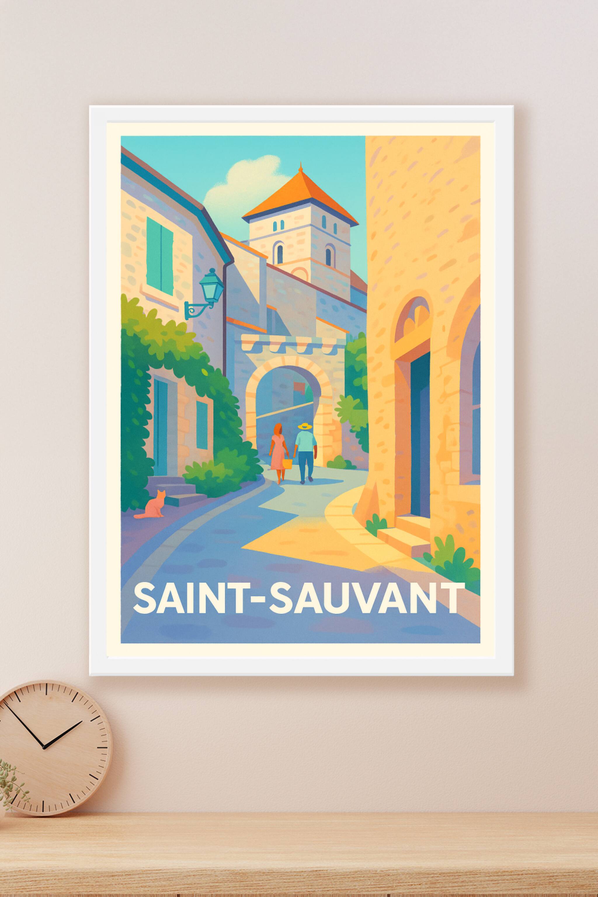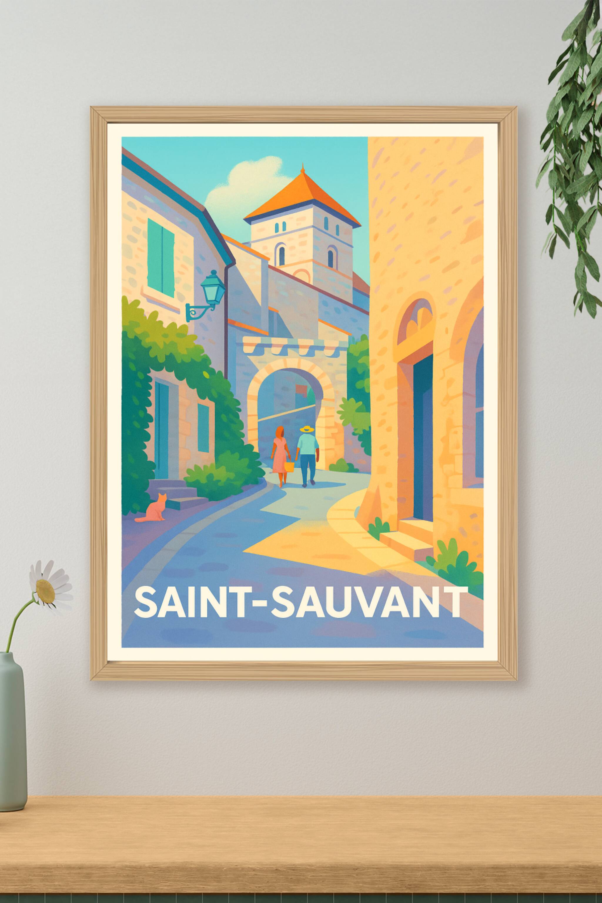 Découvrez l'atmosphère paisible et lumineuse de Saint-Sauvant avec cette affiche illustrée, qui met en lumière ses ruelles anciennes et son archite...