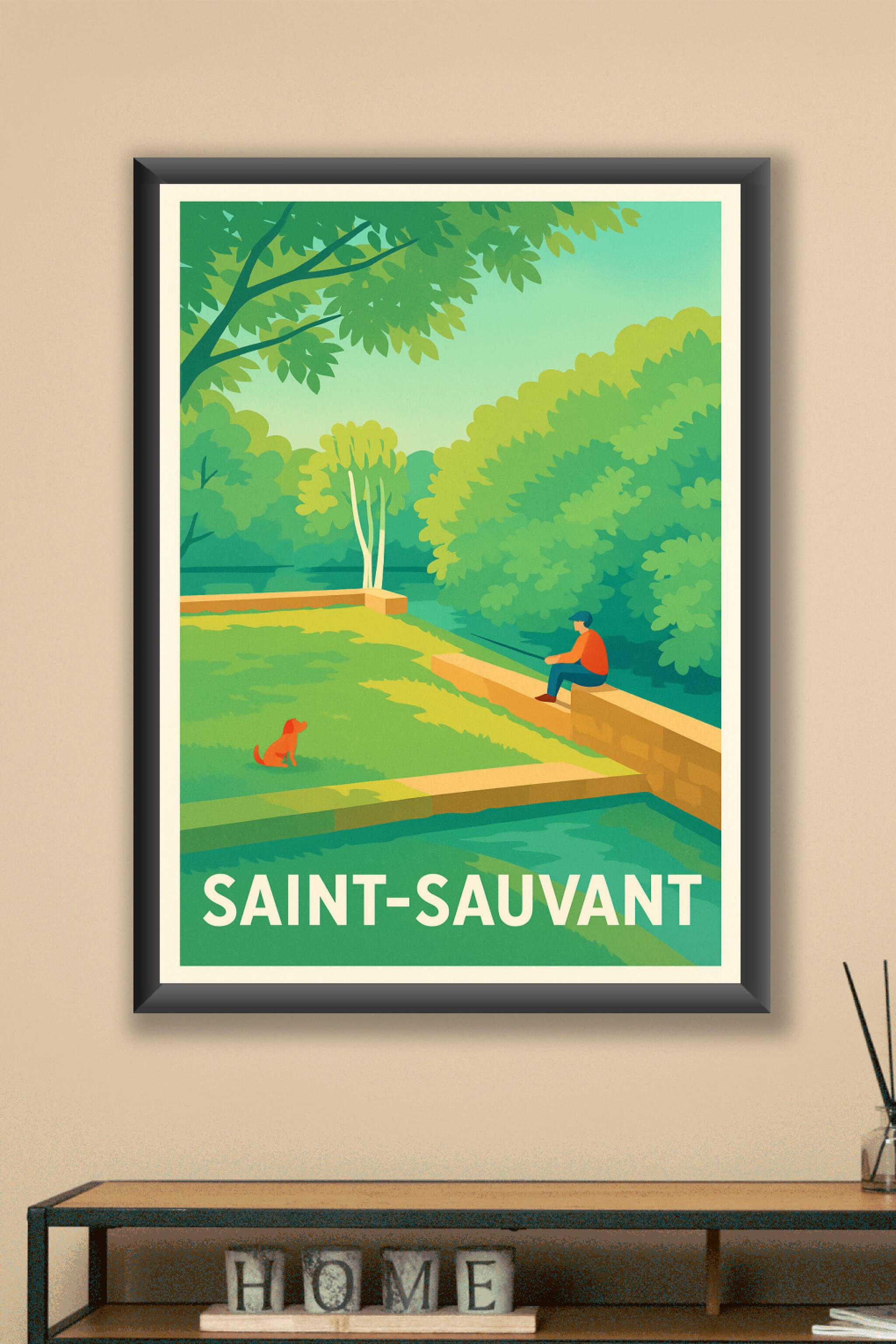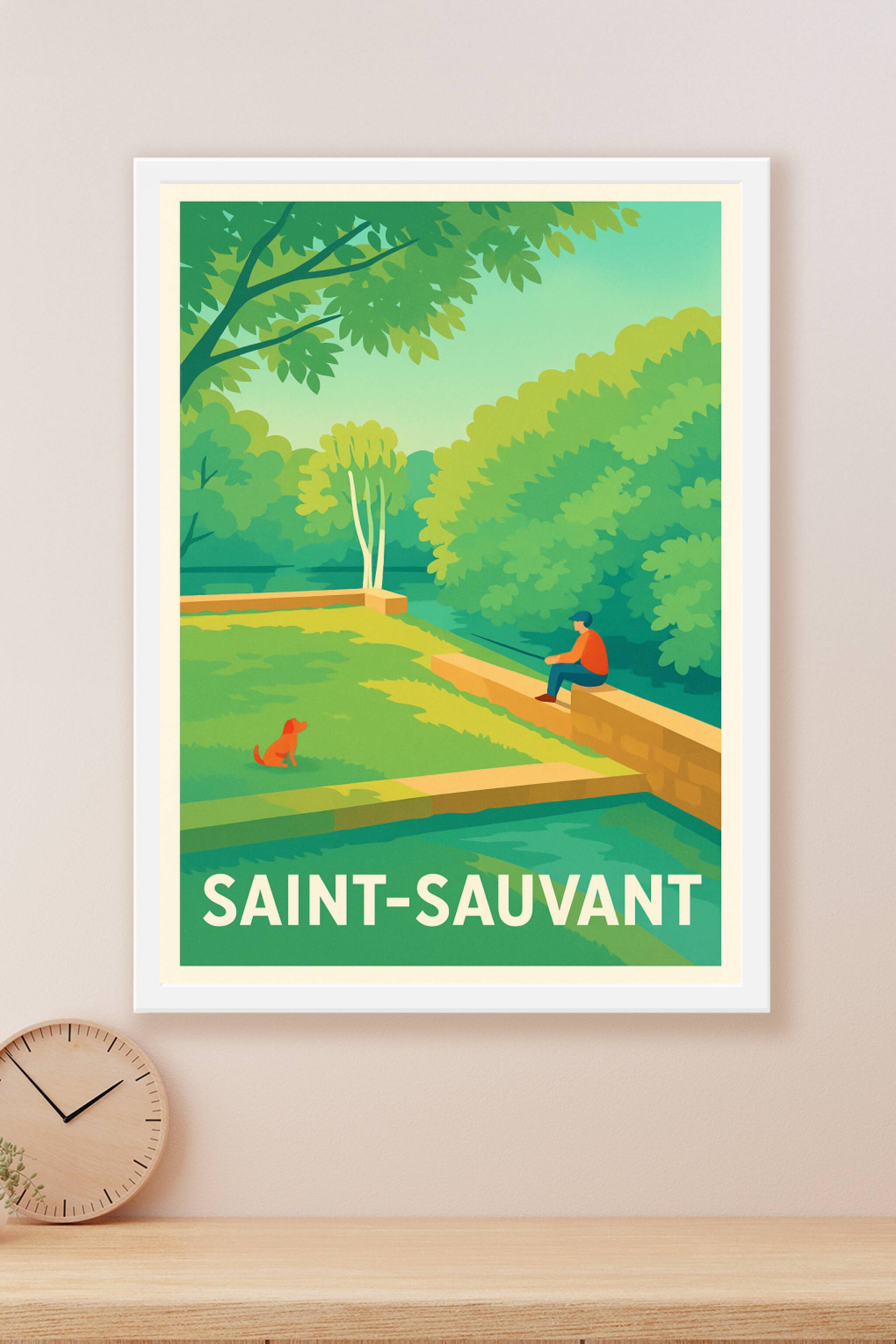 Découvrez la sérénité de Saint-Sauvant à travers cette affiche au style graphique épuré mettant en scène un moment de quiétude au bord de l'eau, en...