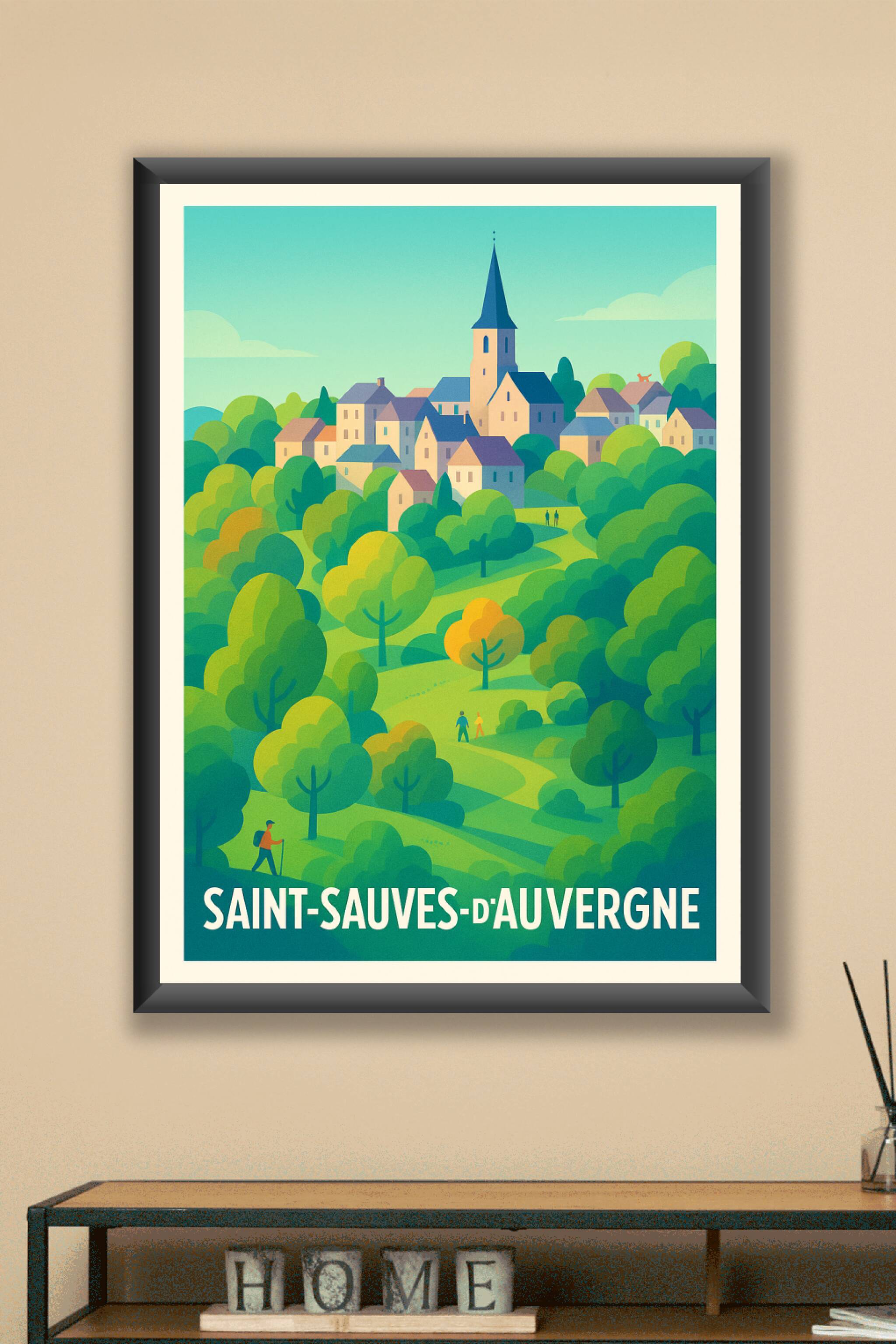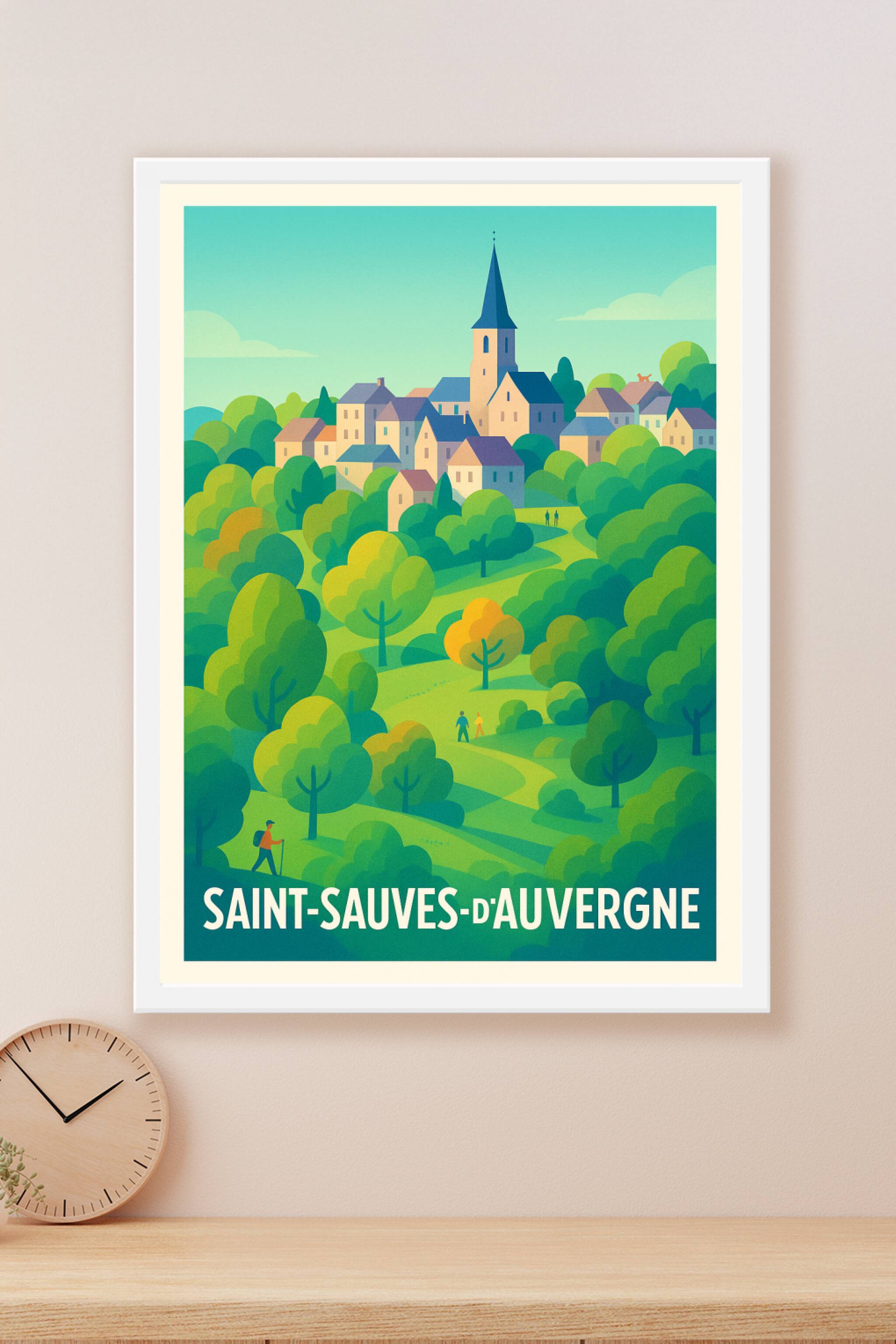 Succombez au charme authentique de Saint-Sauves-d'Auvergne avec cette affiche illustrée d'un village pittoresque niché au cœur d'une végétation lux...
