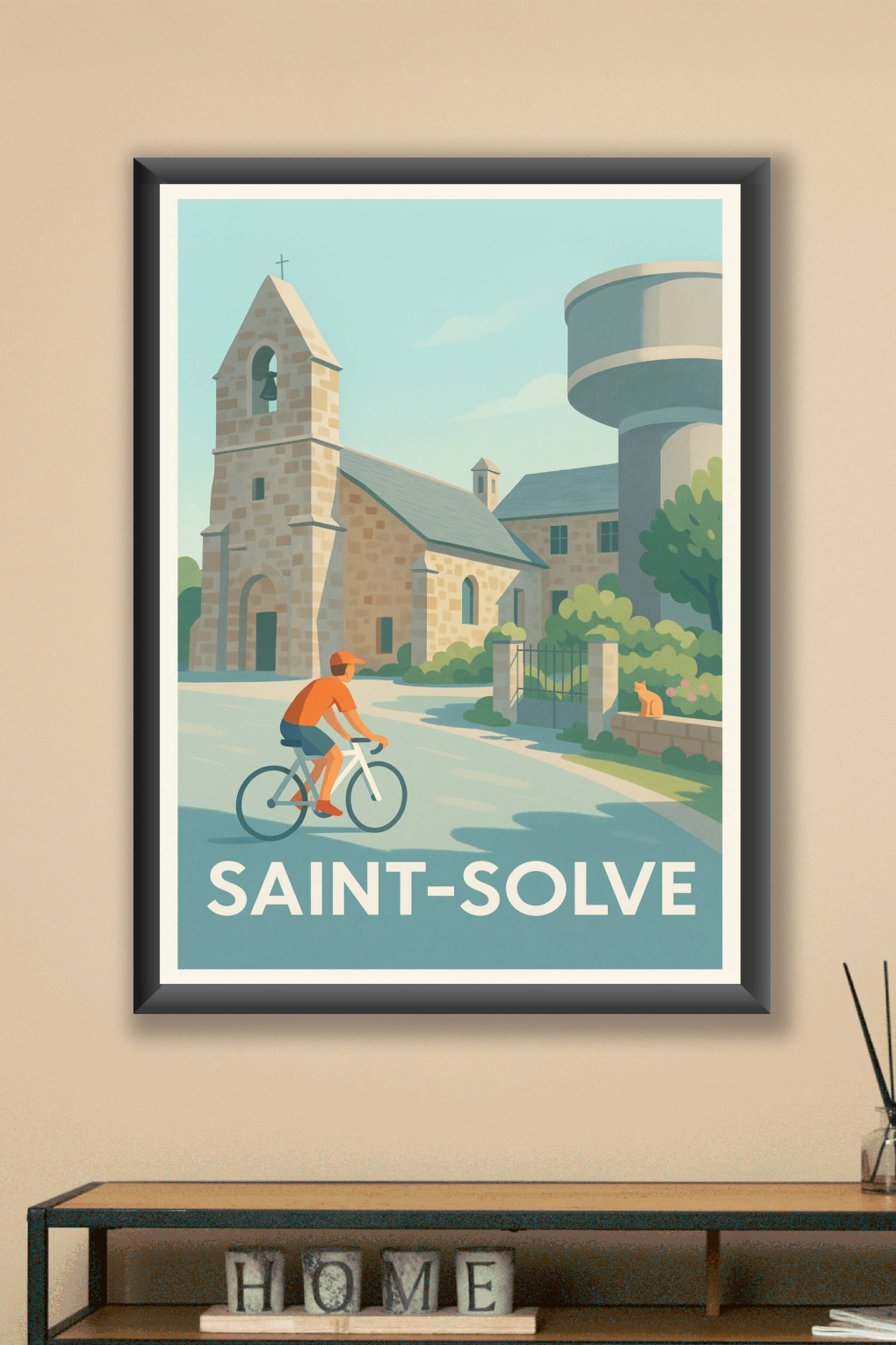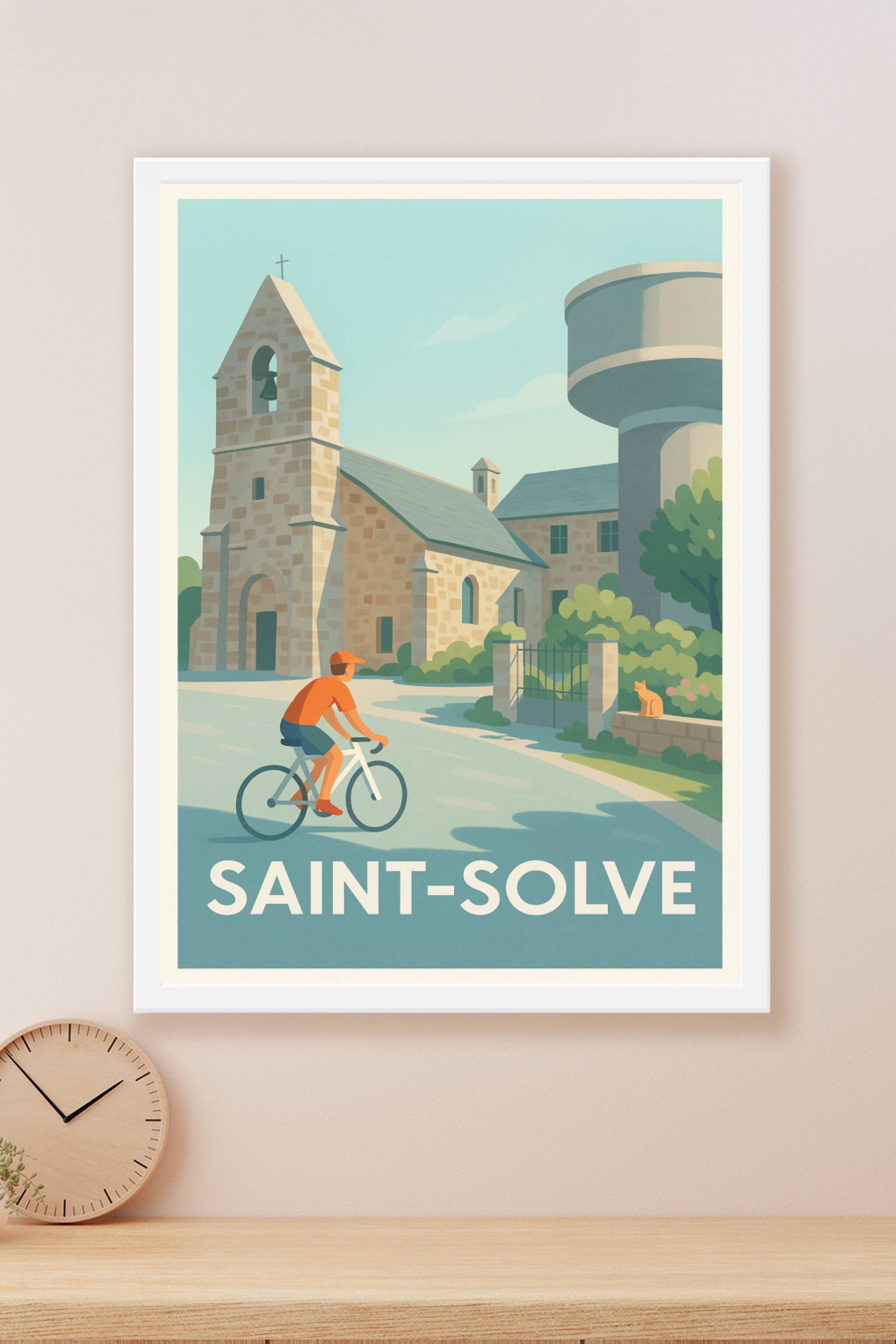 Découvrez le calme et la douceur de vivre de Saint-Solve avec cette affiche illustrée mêlant architecture traditionnelle et ambiance bucolique. Un cycliste passe paisiblement devant une église en pierre, sous un ciel bleu clair, tandis qu'un chat observe la scène, capturant l'essence tranquille de ce village typique.Ce poster est imprimé en tirage "Fine Art" sur papier 305g coton, garantissant des couleurs éclatantes et une qualité d'impression exceptionnelle. Disponible en formats A1 à A4, avec ou sans cadre, cette affiche apportera une touche de charme intemporel et d'authenticité à votre décoration intérieure. Profitez d'une fabrication 100% française pour embellir votre intérieur ou offrir un cadeau unique aux amateurs de paysages ruraux.