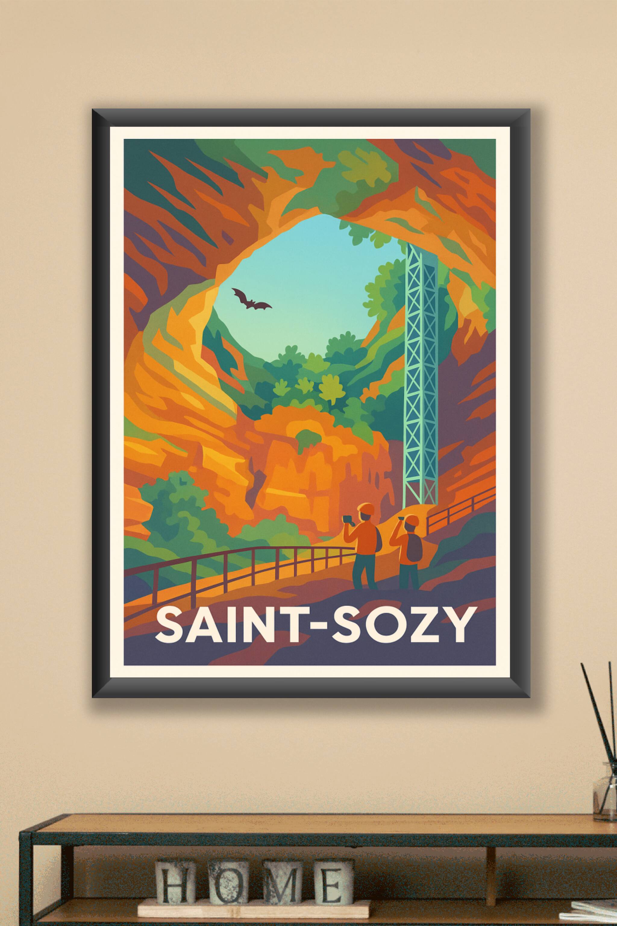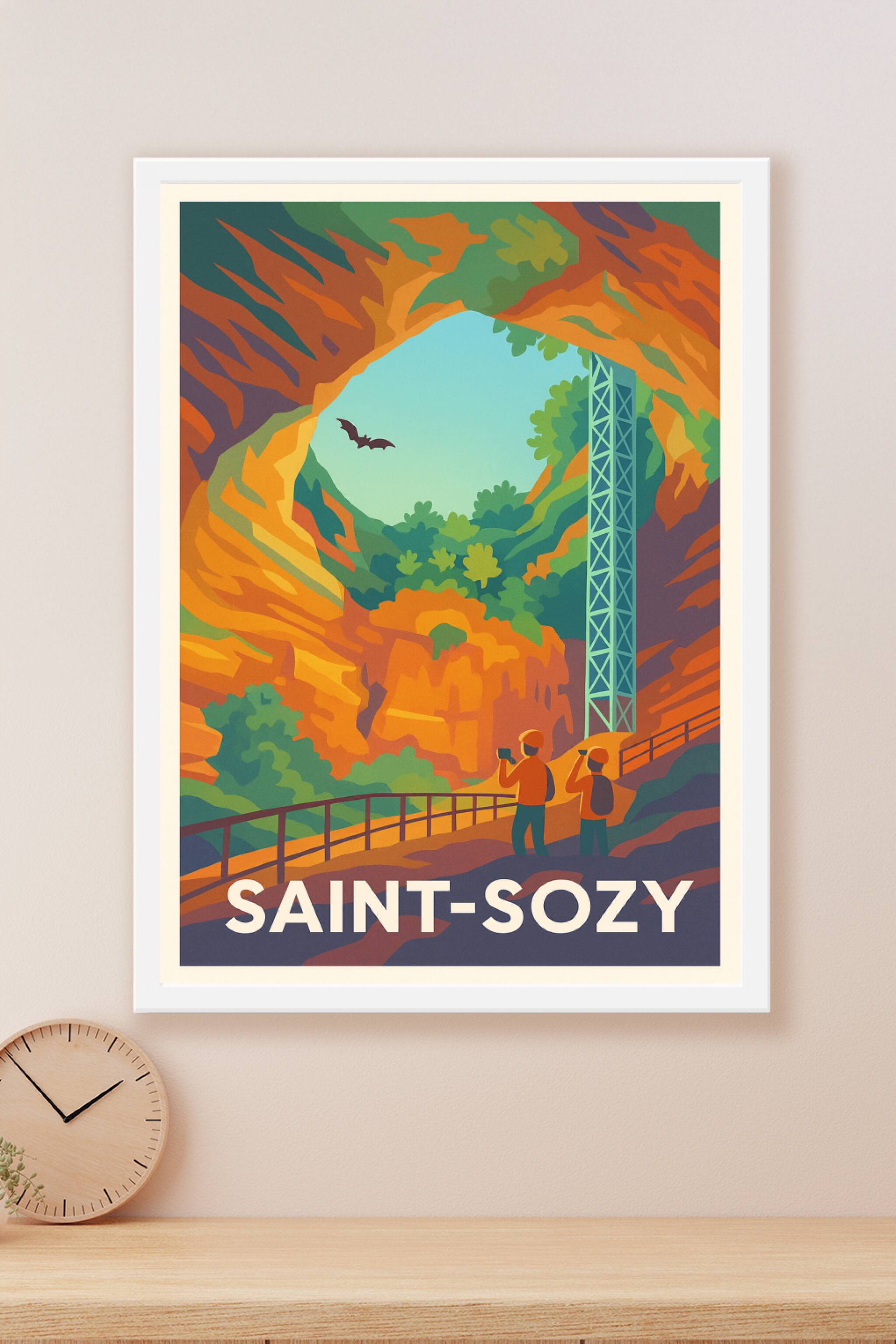Plongez au cœur des impressionnantes grottes de Saint-Sozy avec cette affiche au style rétro et coloré. Ce poster illustre une scène fascinante où ...