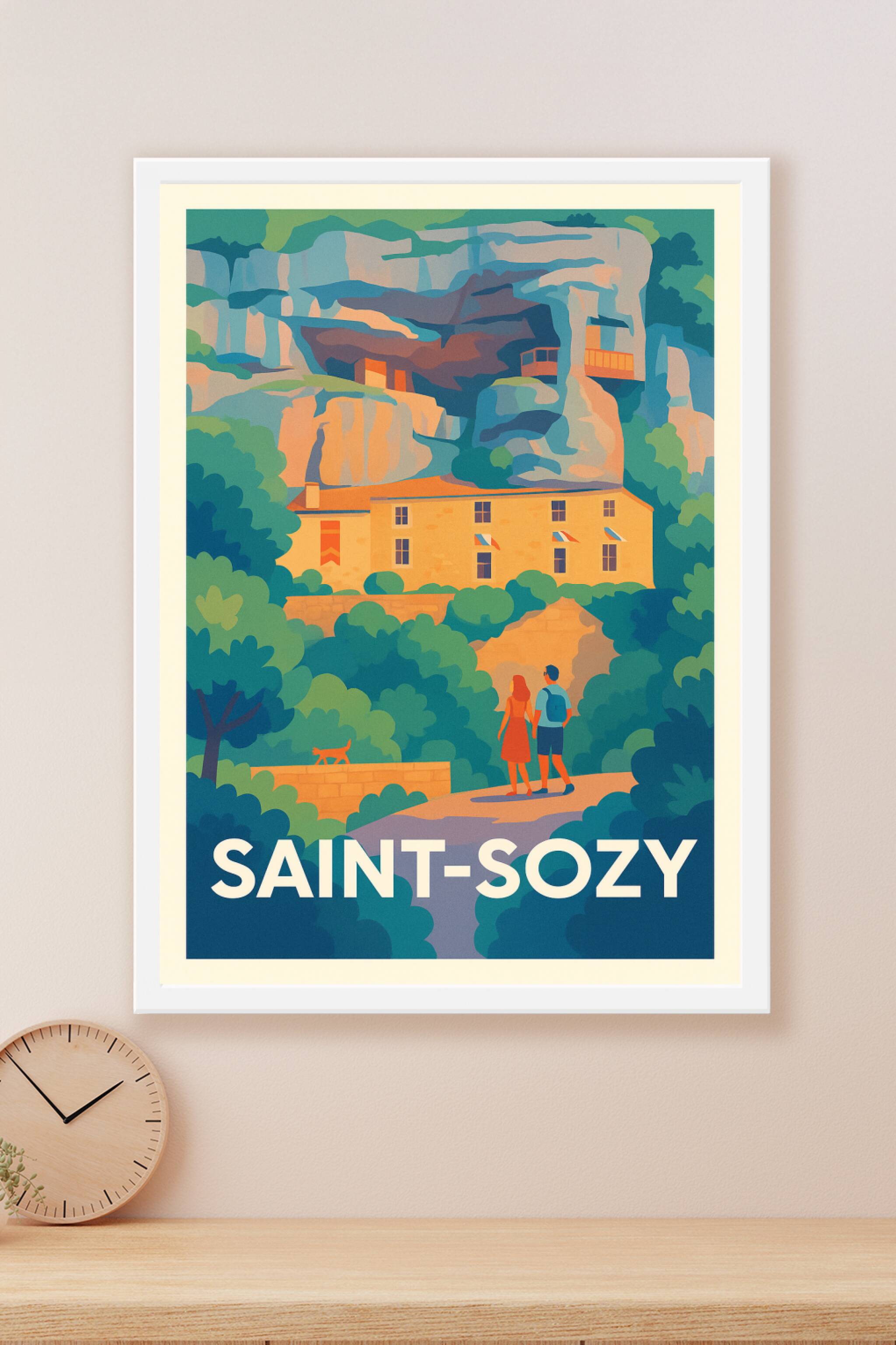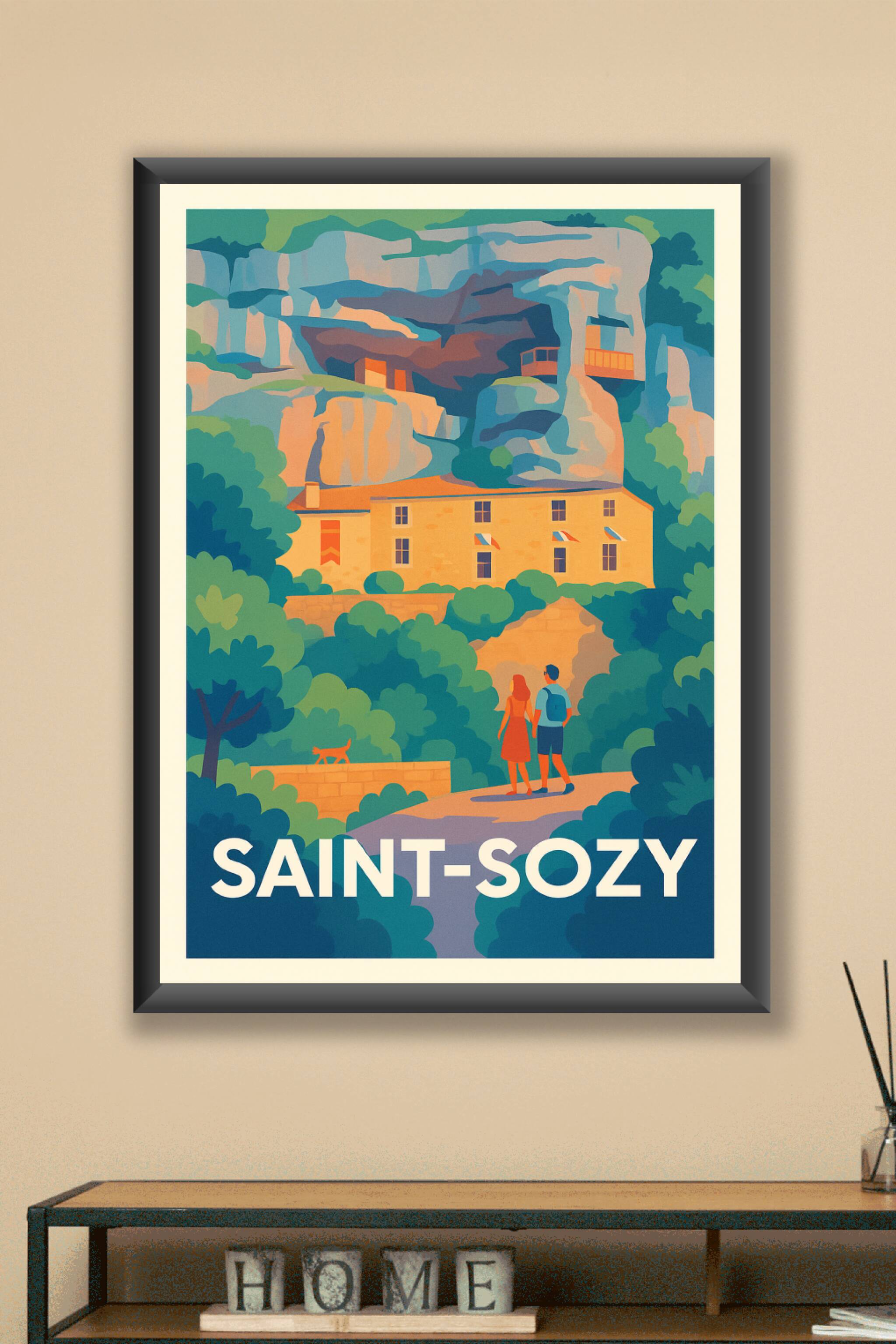 Découvrez Saint-Sozy à travers cette affiche au style vintage, mêlant nature luxuriante et architecture troglodytique unique. Cette scène paisible ...