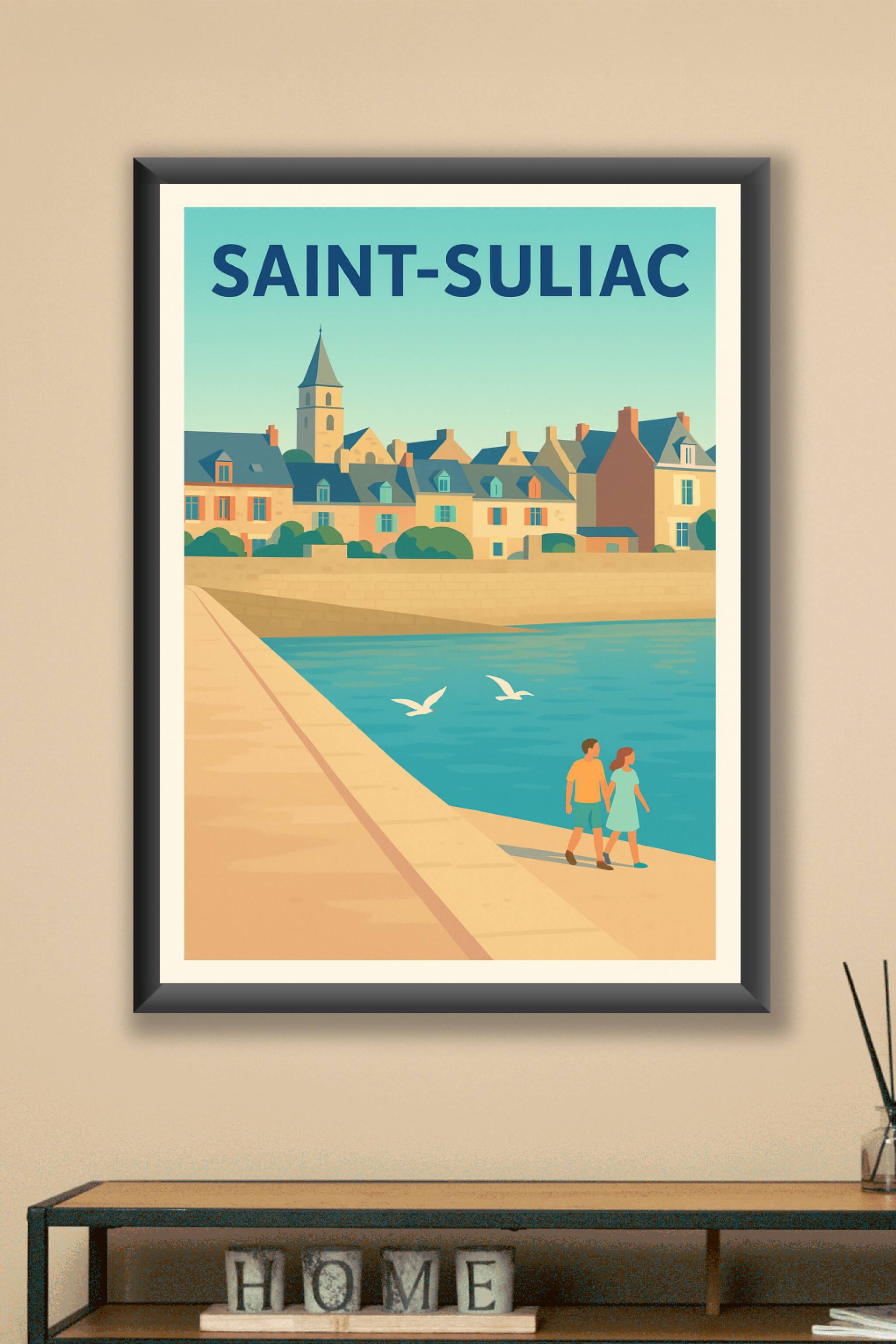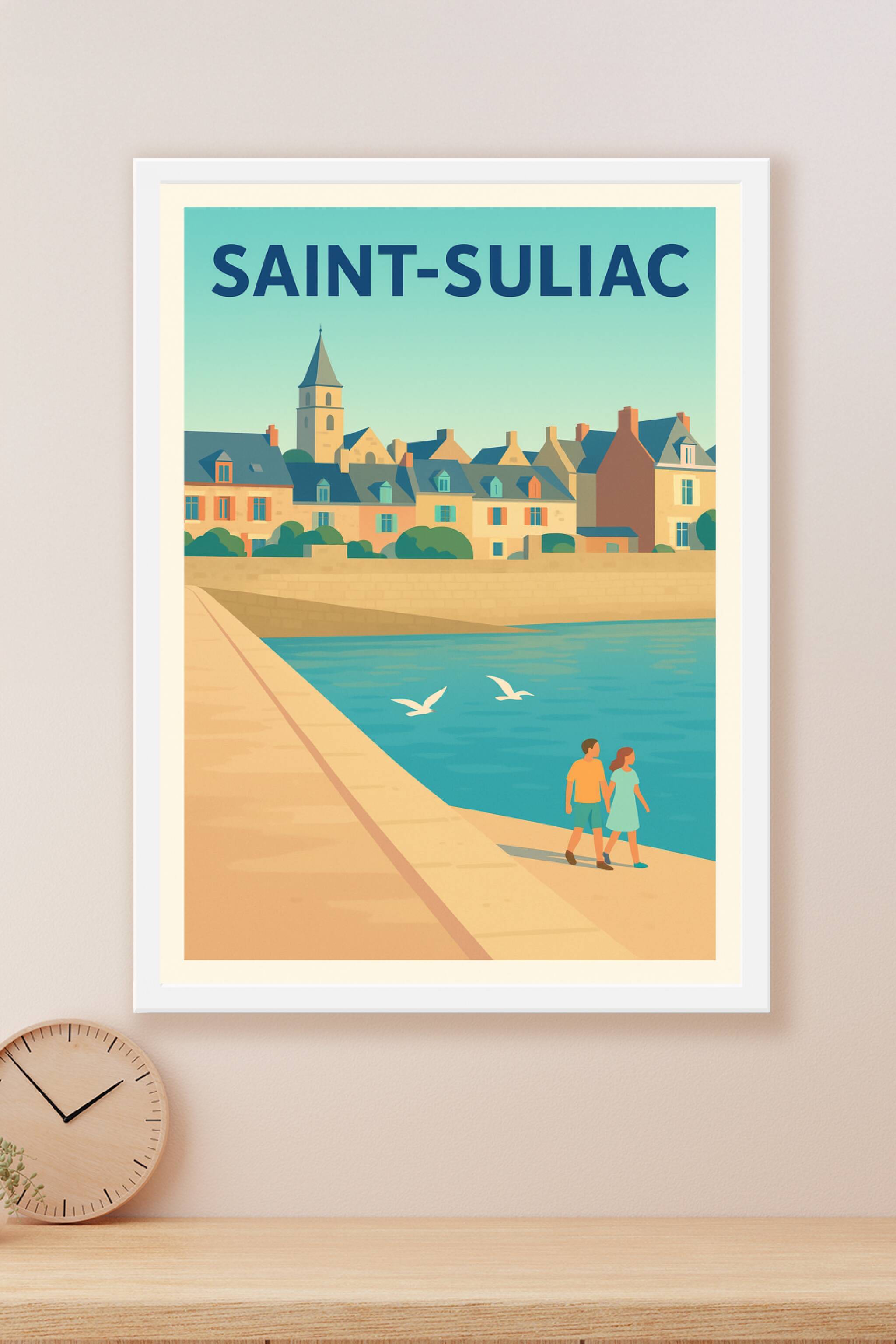 Découvrez la quiétude et l'authenticité de Saint-Suliac avec cette affiche au design épuré et aux couleurs douces, représentant une promenade au bo...