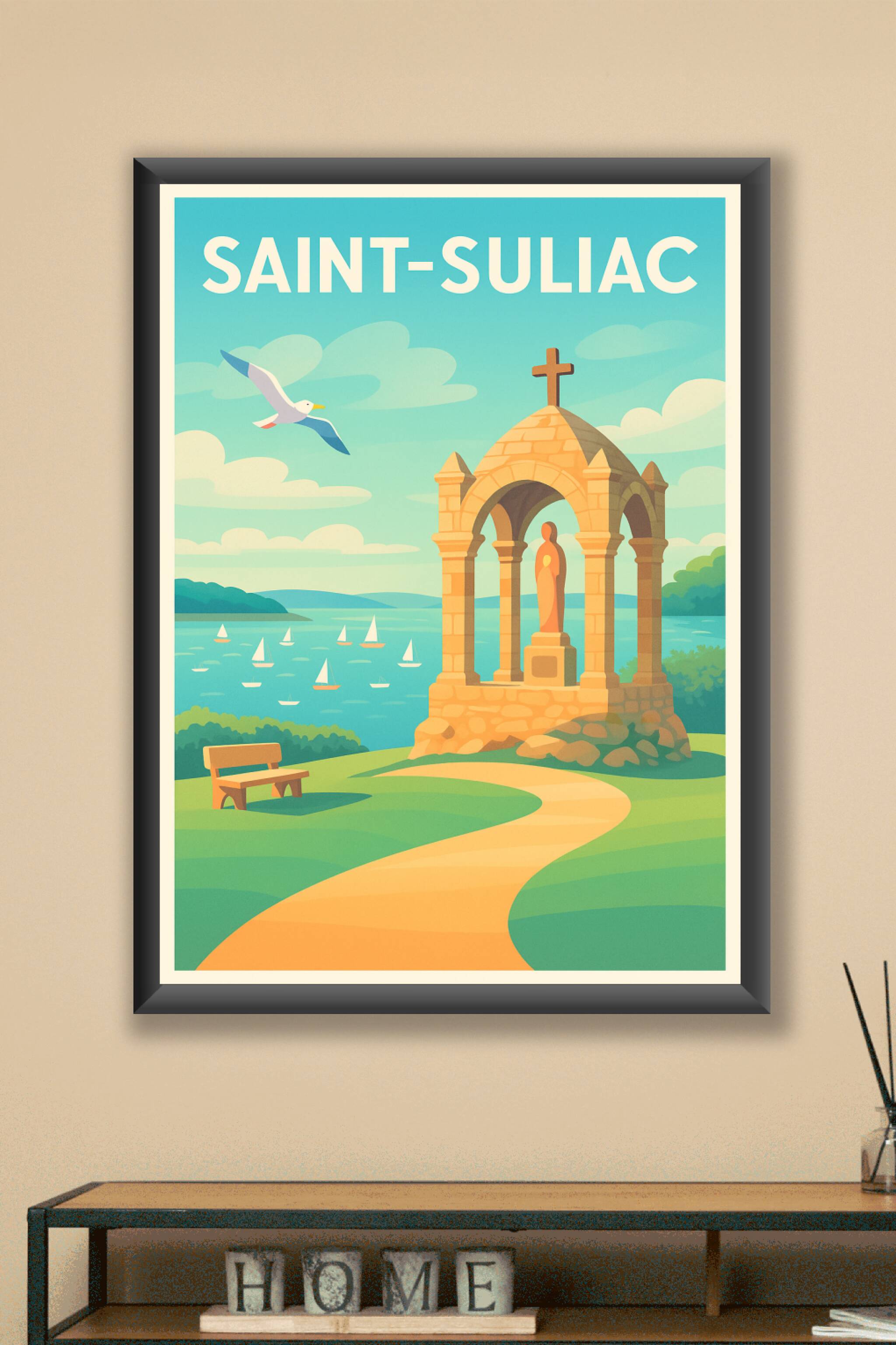 Apportez une touche de sérénité et de charme breton à votre intérieur avec cette affiche illustrée de Saint-Suliac, un joyau de la côte d'Émeraude....