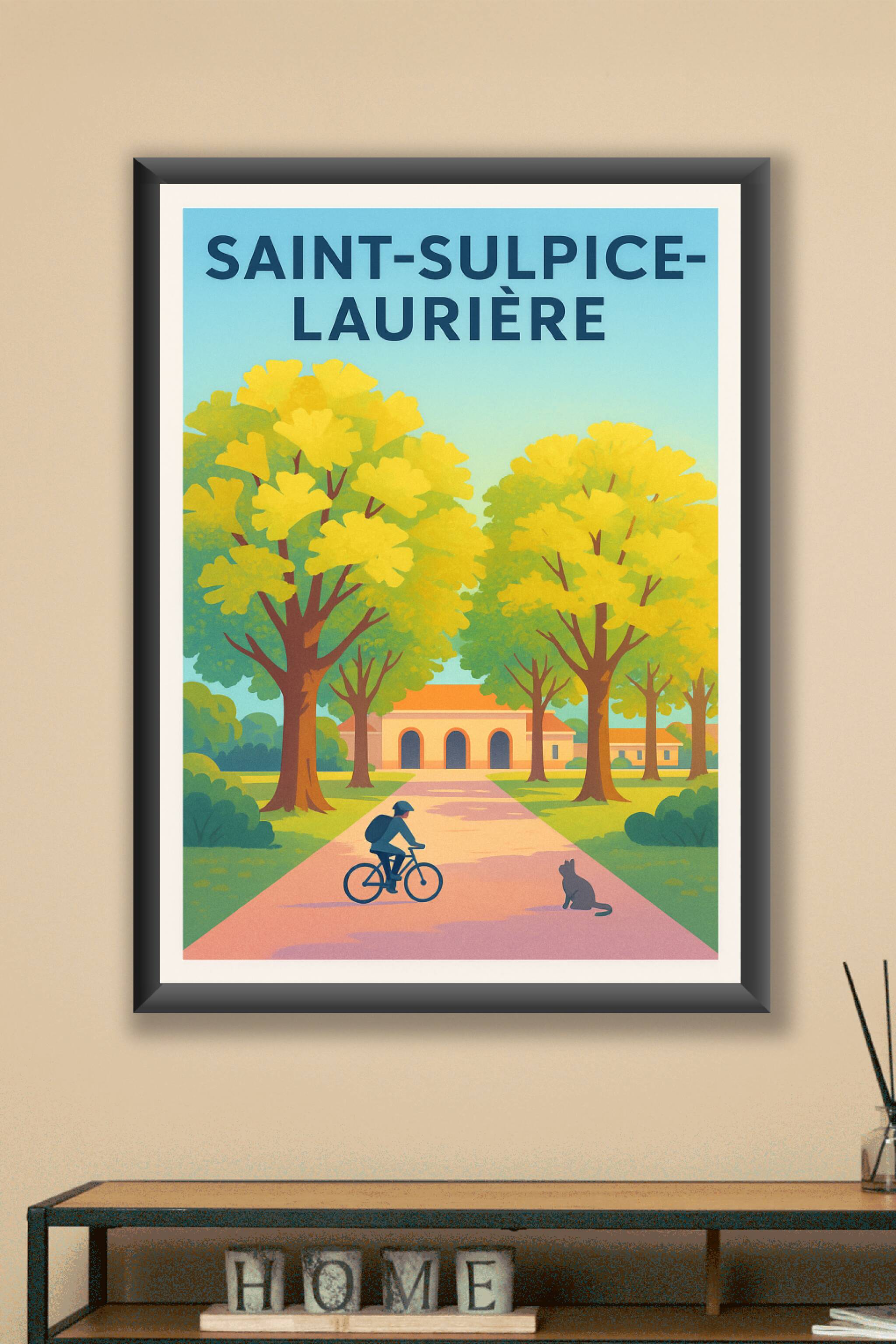 Découvrez la douceur de vivre à Saint-Sulpice-Laurière avec cette affiche illustrée mêlant nature et simplicité. Le poster met en scène une allée bordée d'arbres aux feuillages dorés, où un cycliste croise la pause tranquille d'un chat, devant une bâtisse typique du village. Imprimée en tirage "Fine Art" sur papier coton 305g pour une netteté et des couleurs éclatantes, cette affiche est disponible en formats A1 à A4, avec ou sans cadre. Parfaite pour apporter une touche d'authenticité et de calme à votre décoration intérieure, elle est fabriquée avec soin en France pour une qualité d'impression premium durable.