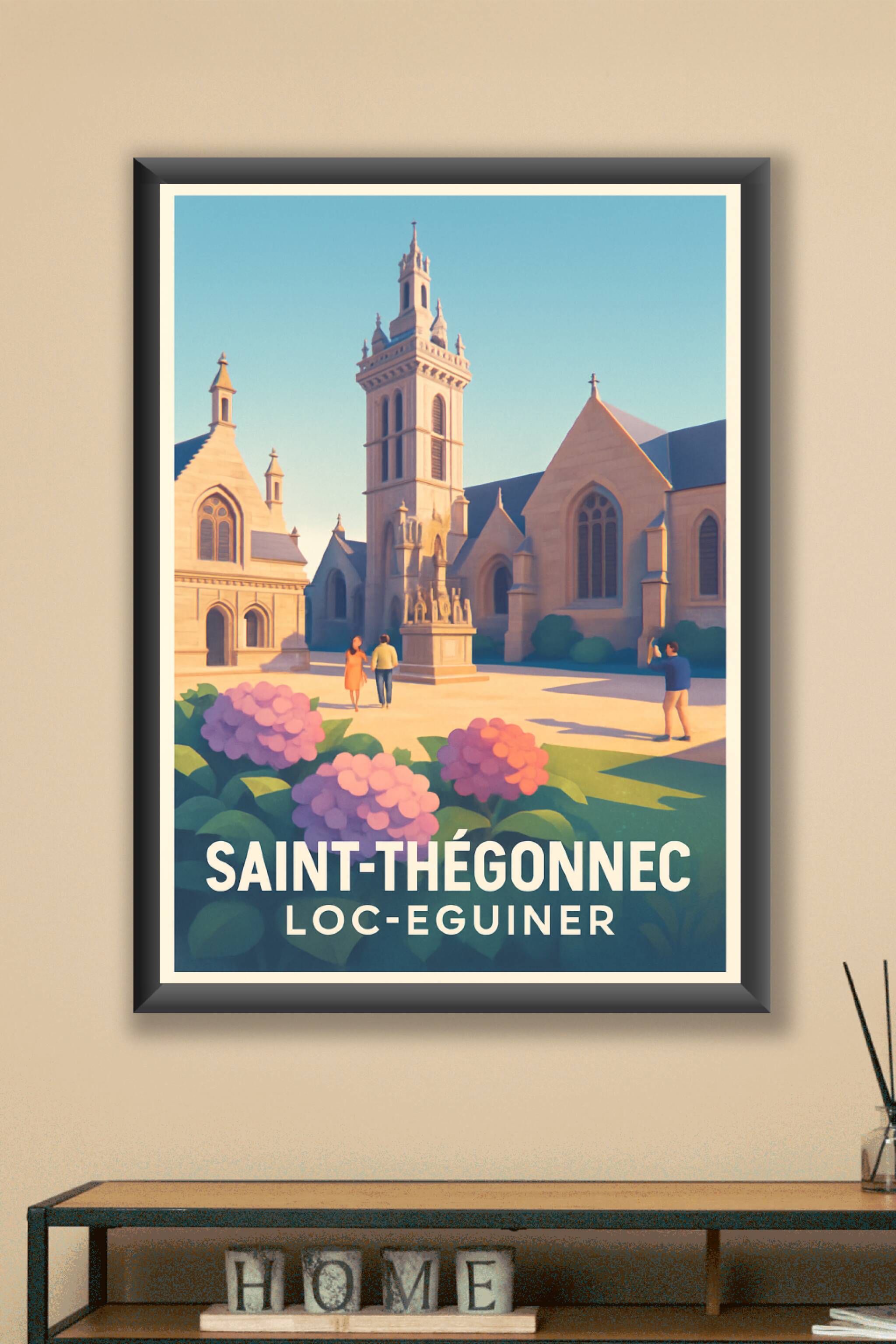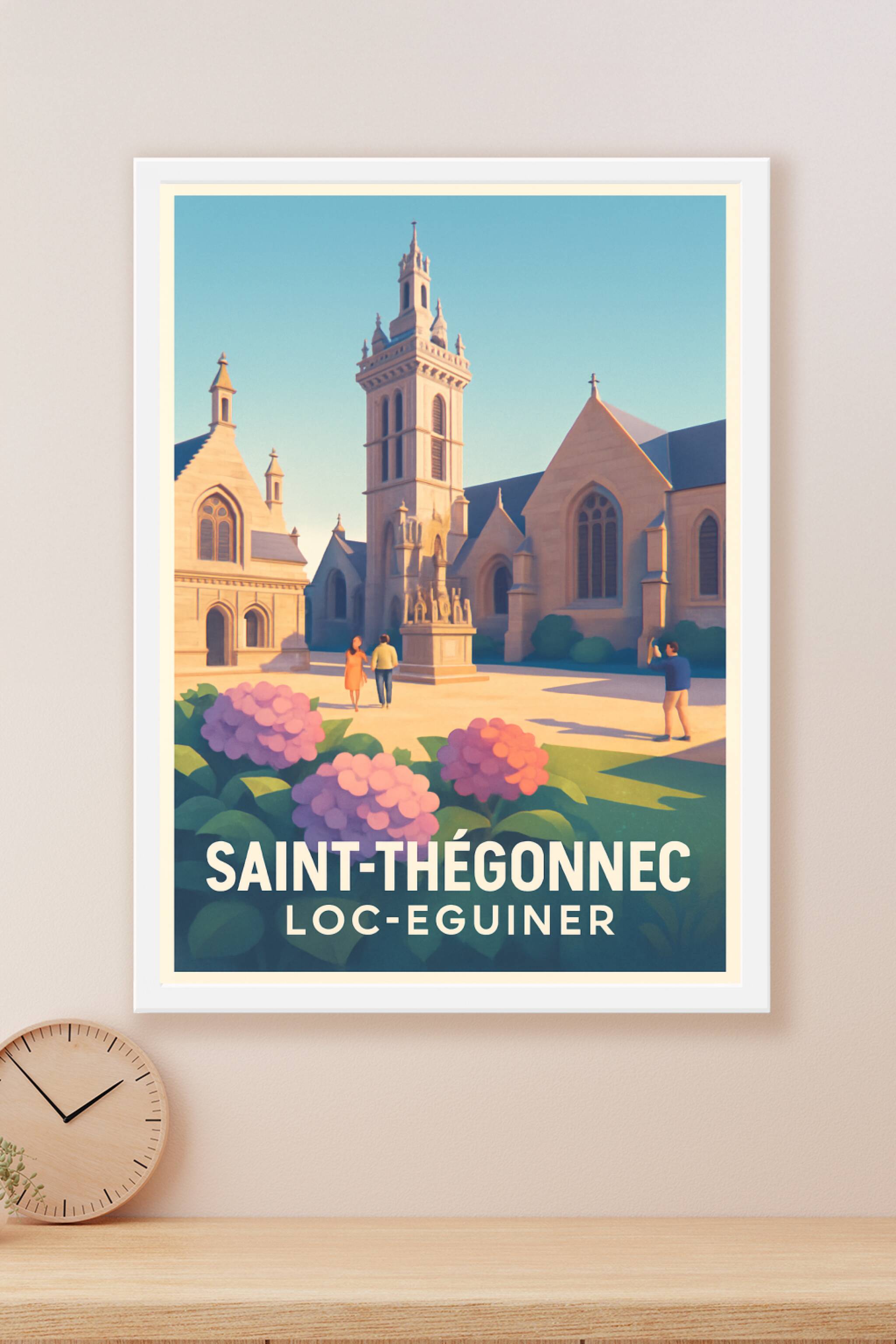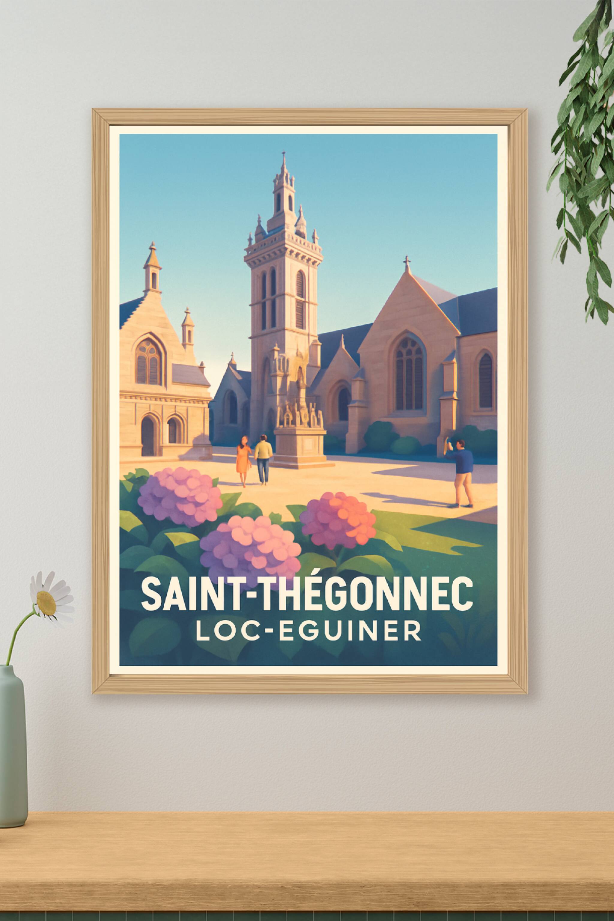 Découvrez le charme unique de Saint-Thégonnec Loc-Eguiner à travers cette affiché illustrée qui met en valeur l'architecture remarquable de ses bât...