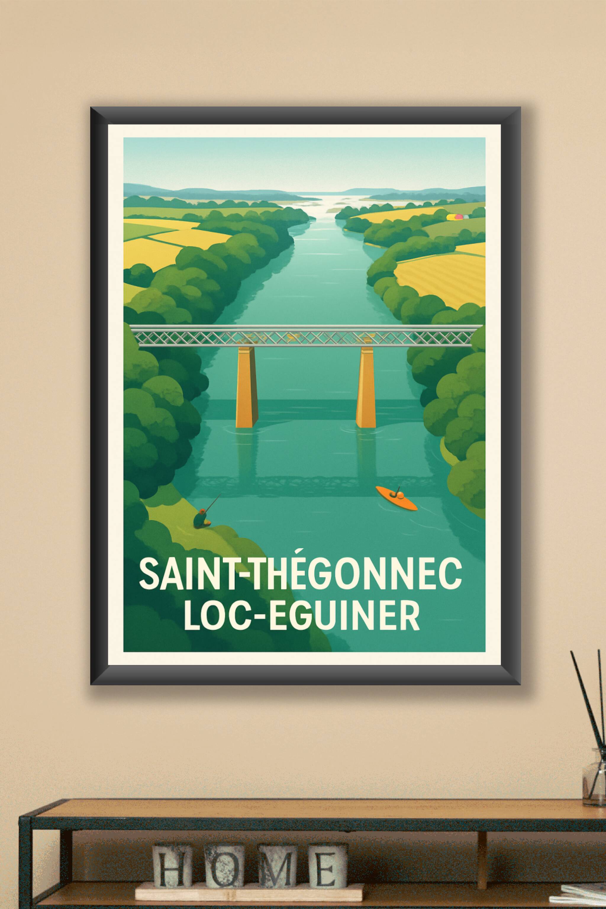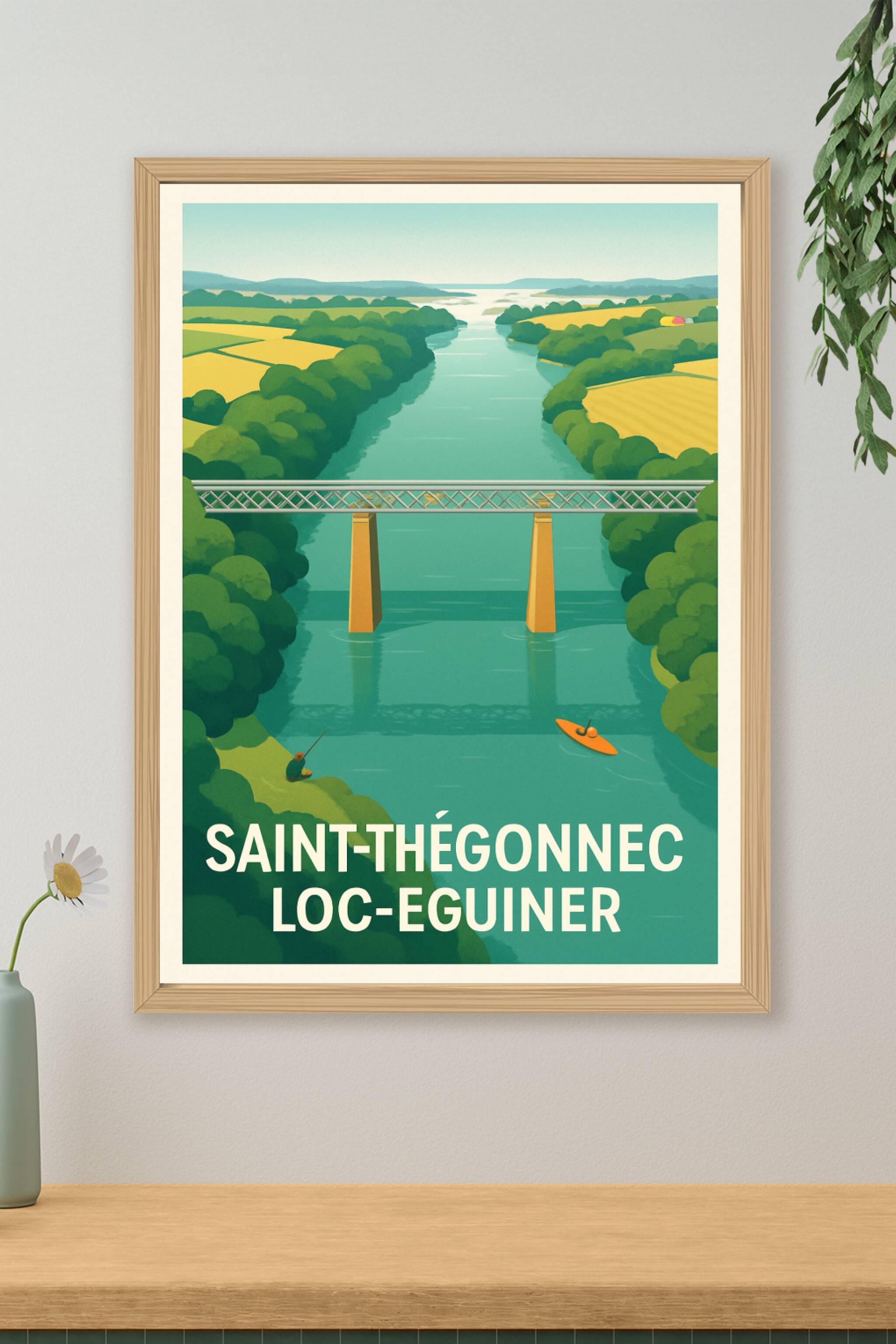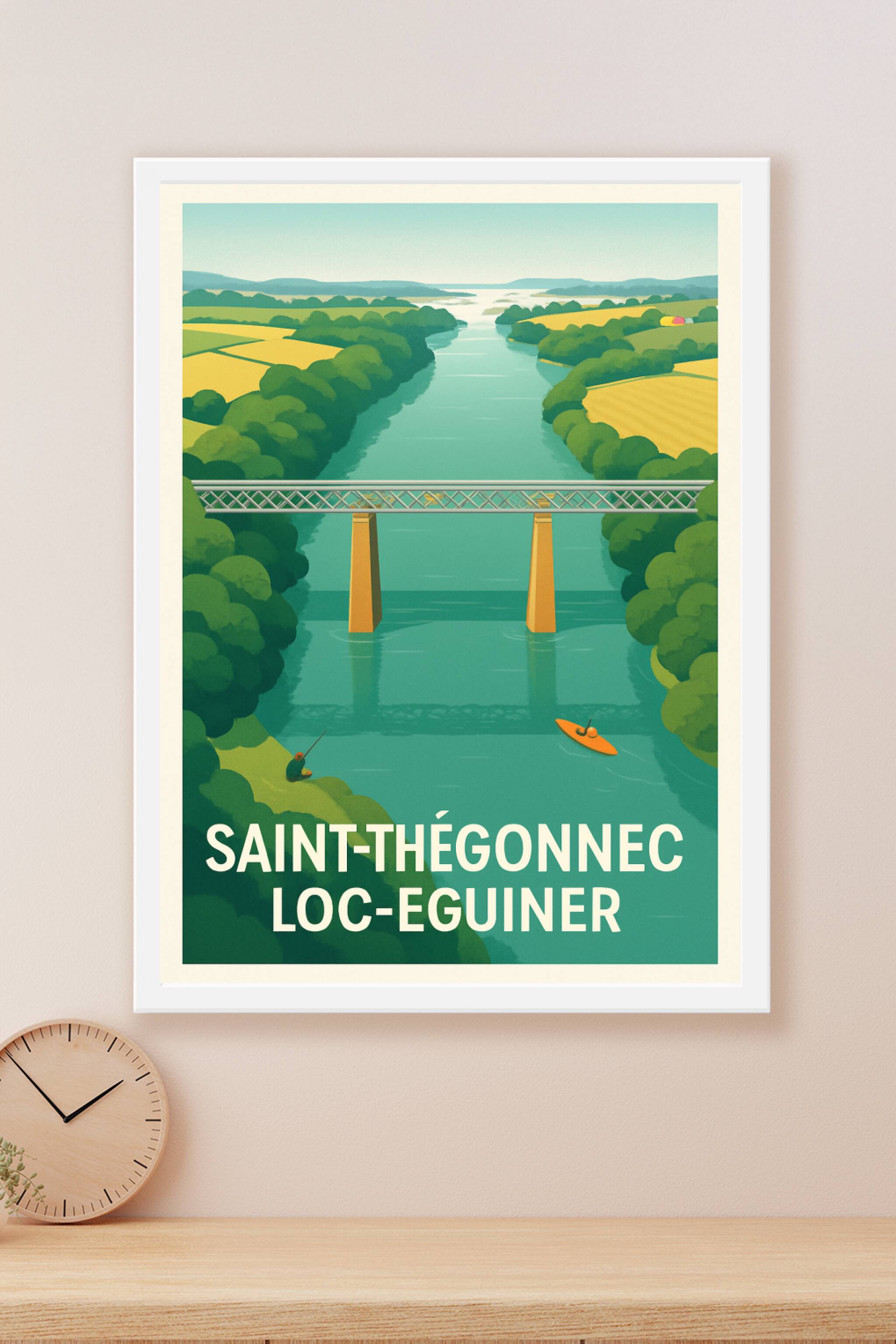 Découvrez la sérénité et la beauté naturelle de Saint-Thégonnec Loc-Eguiner à travers cette affiche artistique. L’illustration met en scène un pont...