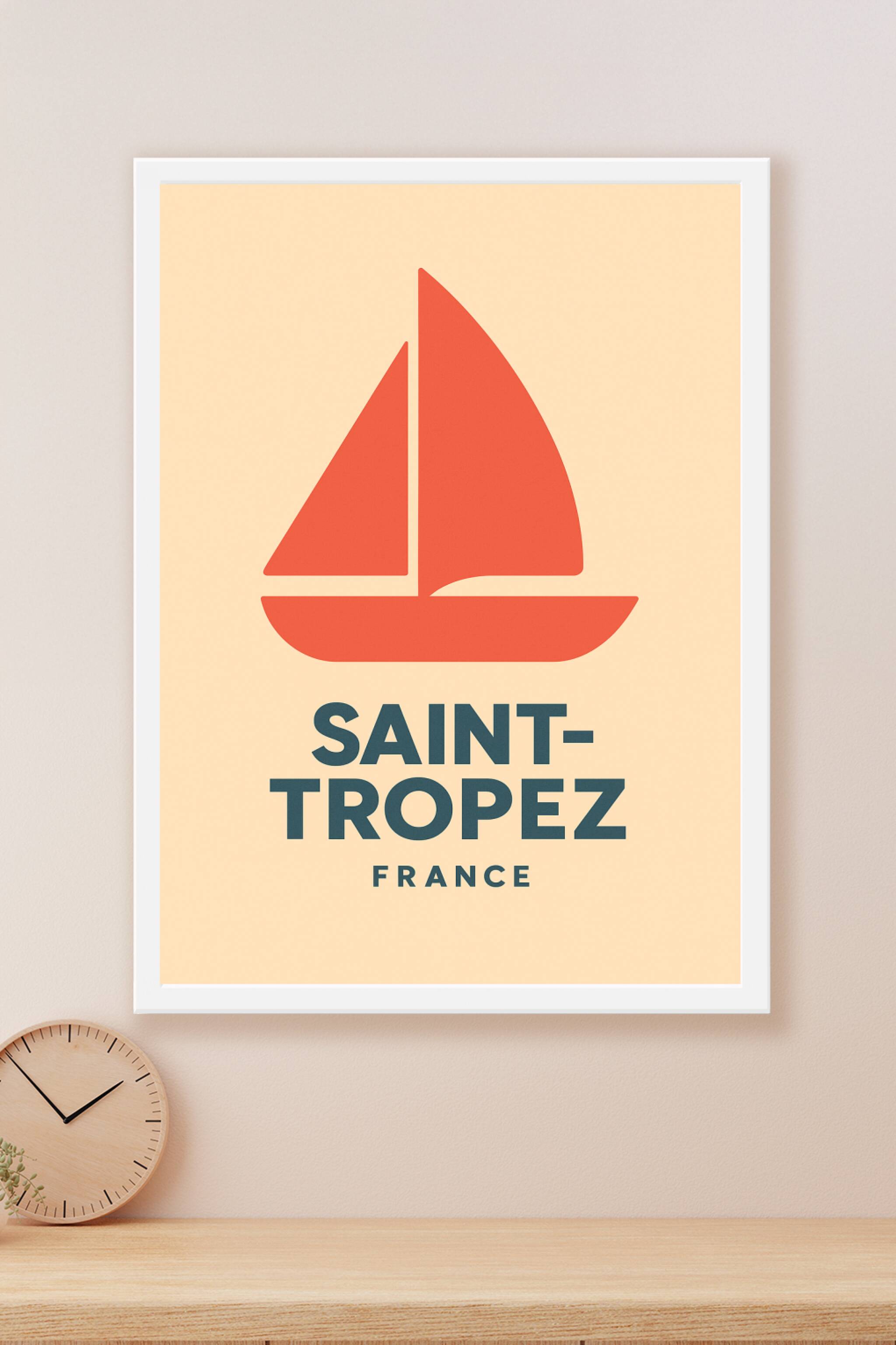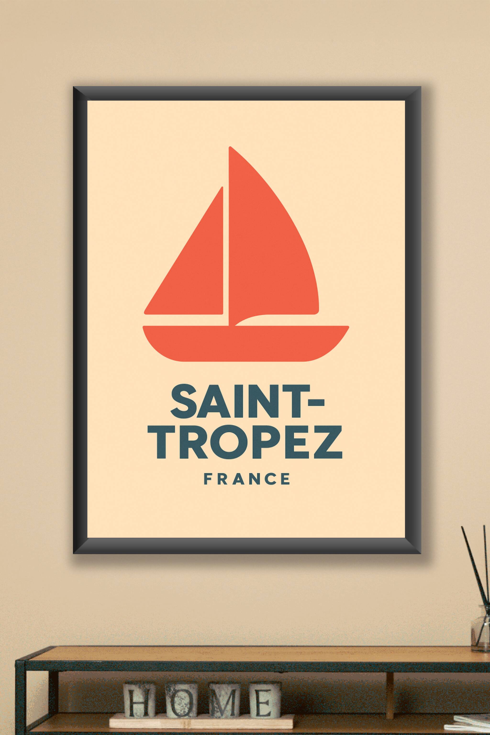 Apportez une touche de la Méditerranée à votre décoration avec cette affiche épurée représentant un voilier stylisé, symbole emblématique de Saint-...
