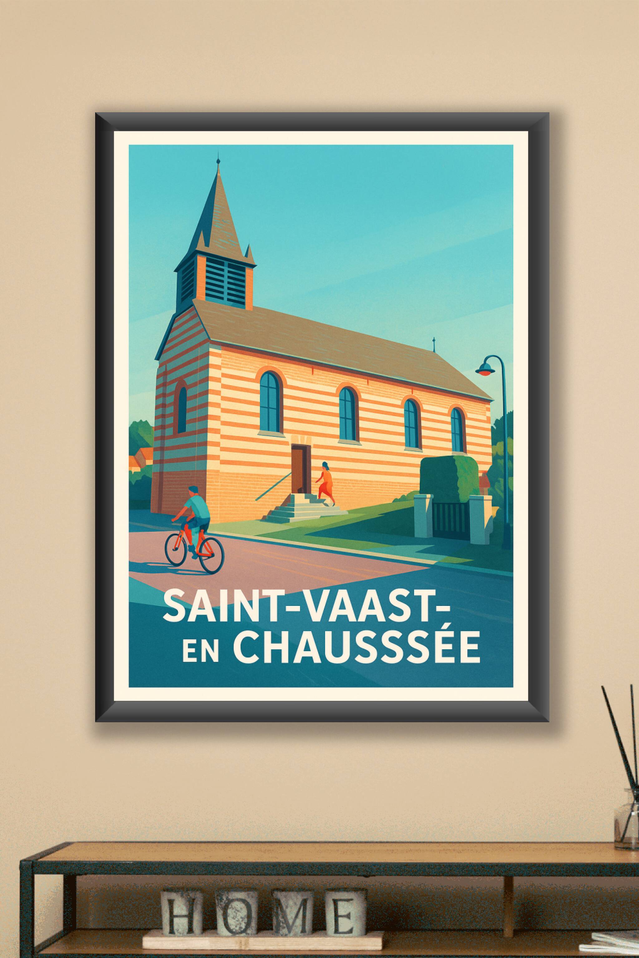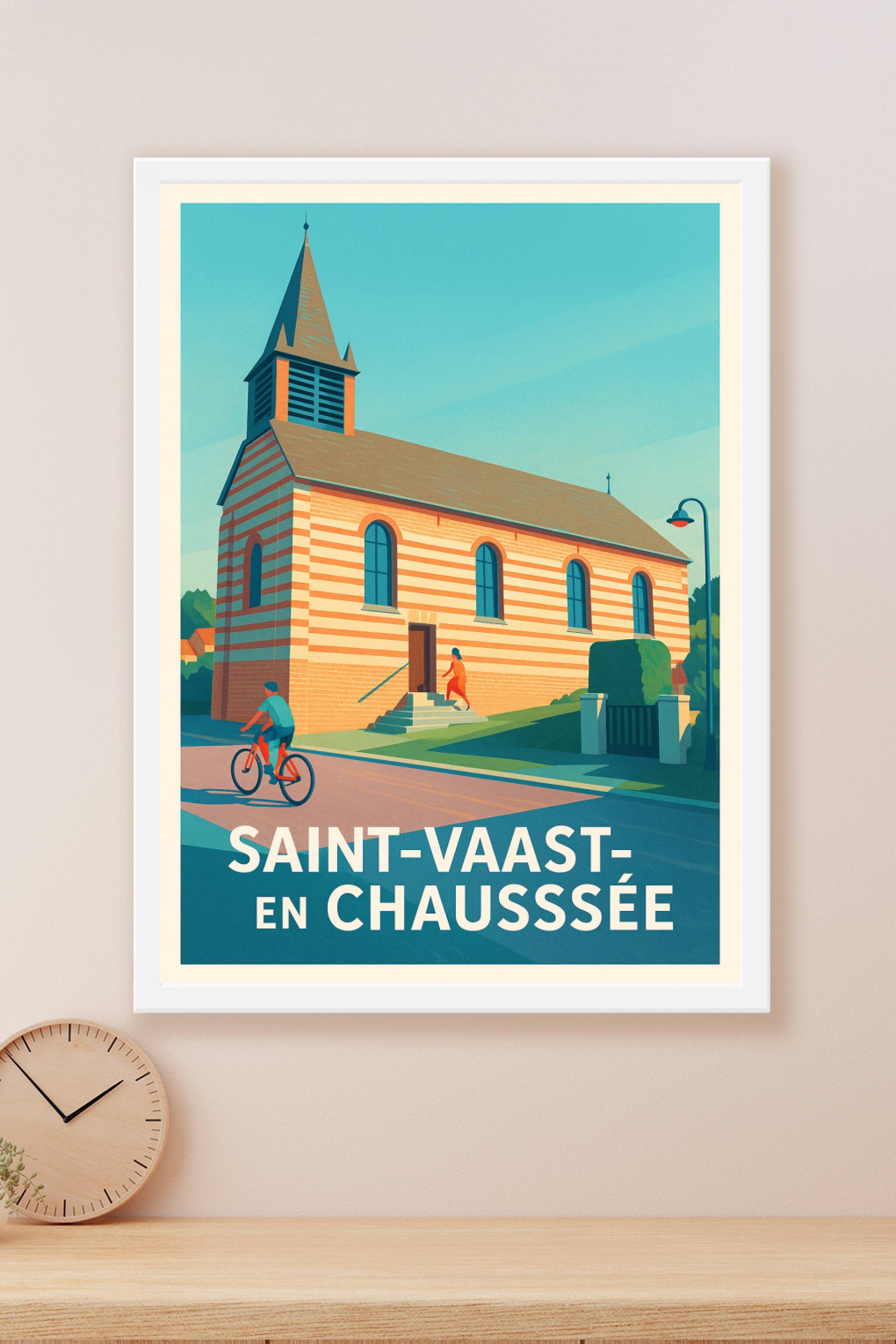 Découvrez le charme paisible de Saint-Vaast-en-Chaussée avec cette affiche illustrée mettant en avant une église typique aux rayures chaleureuses, ...
