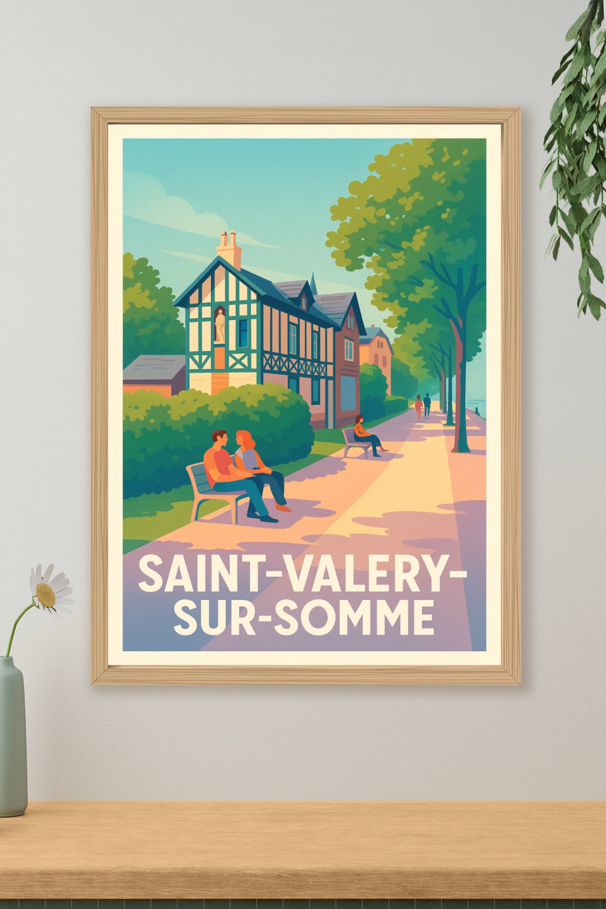 Découvrez la douceur de vivre à Saint-Valery-sur-Somme avec cette magnifique affiche illustrée, représentant une promenade bordée d'arbres ombragés...