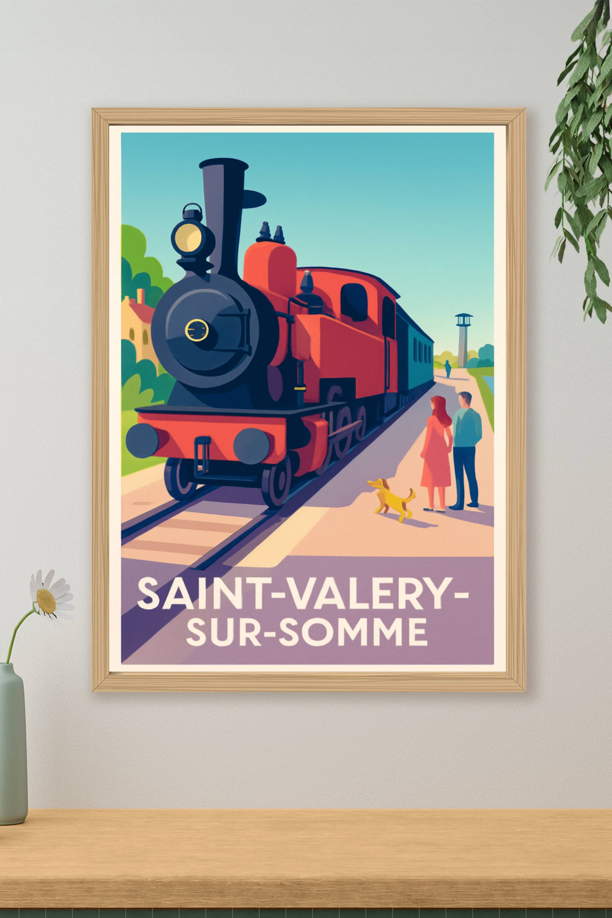 Découvrez l'élégance nostalgique de Saint-Valery-sur-Somme avec cette affiche vintage représentant une locomotive mythique sur les rails de la char...