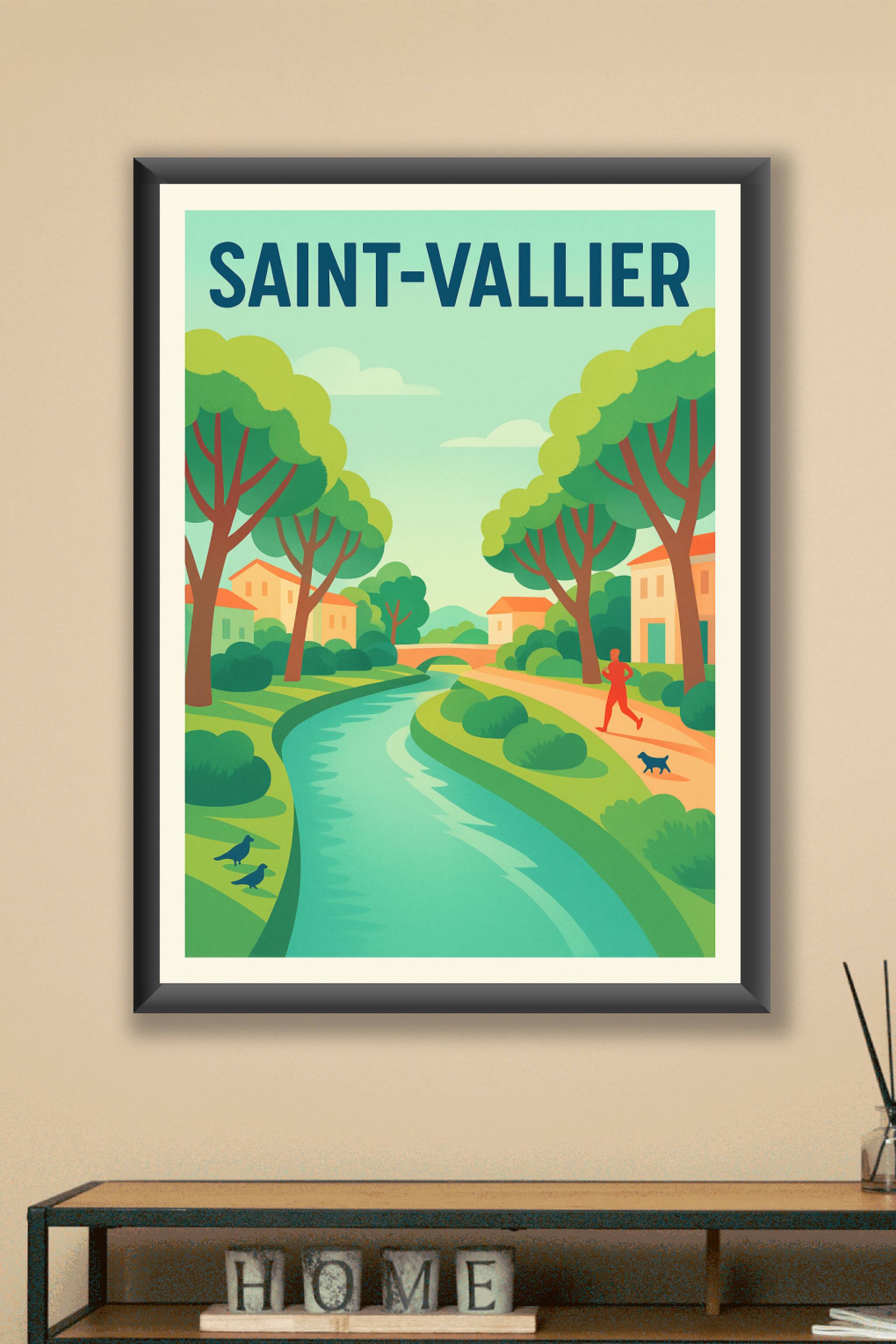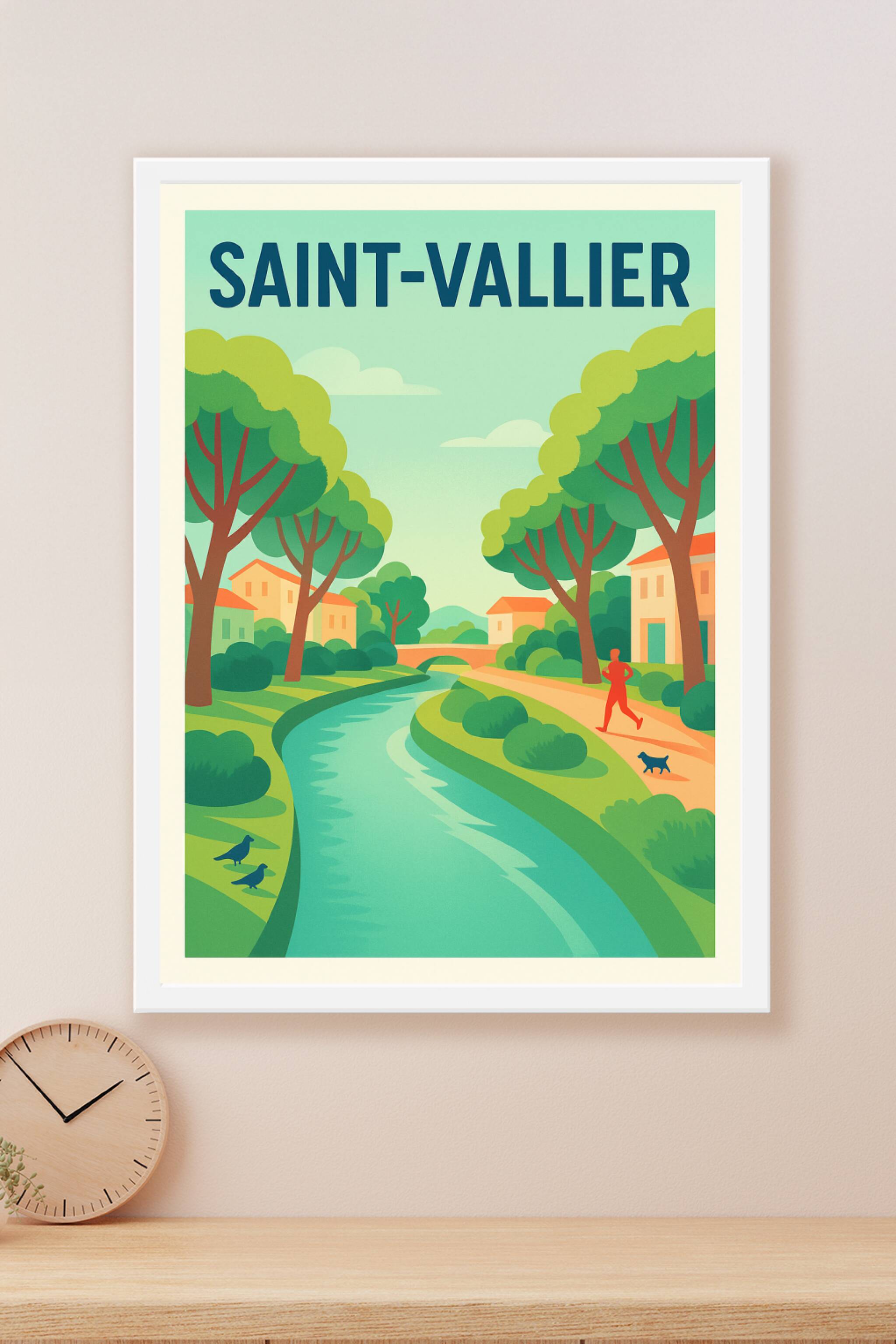 Découvrez la sérénité de Saint-Vallier avec cette affiche au design épuré et coloré, mettant en scène un paisible paysage urbain bordé par la rivière et ses arbres majestueux. Ce poster invite à la détente et à l'évasion, parfait pour apporter une touche de nature et de calme à votre intérieur.Cette affiche est imprimée en tirage "Fine Art" sur un papier de qualité 305g coton, garantissant des couleurs vives et durables. Disponible en formats A1 à A4, avec ou sans cadre, elle s'adapte à tous les espaces de vie. Profitez d'une impression premium 100 % fabriquée en France pour embellir votre décoration ou offrir un souvenir unique aux amoureux de Saint-Vallier.