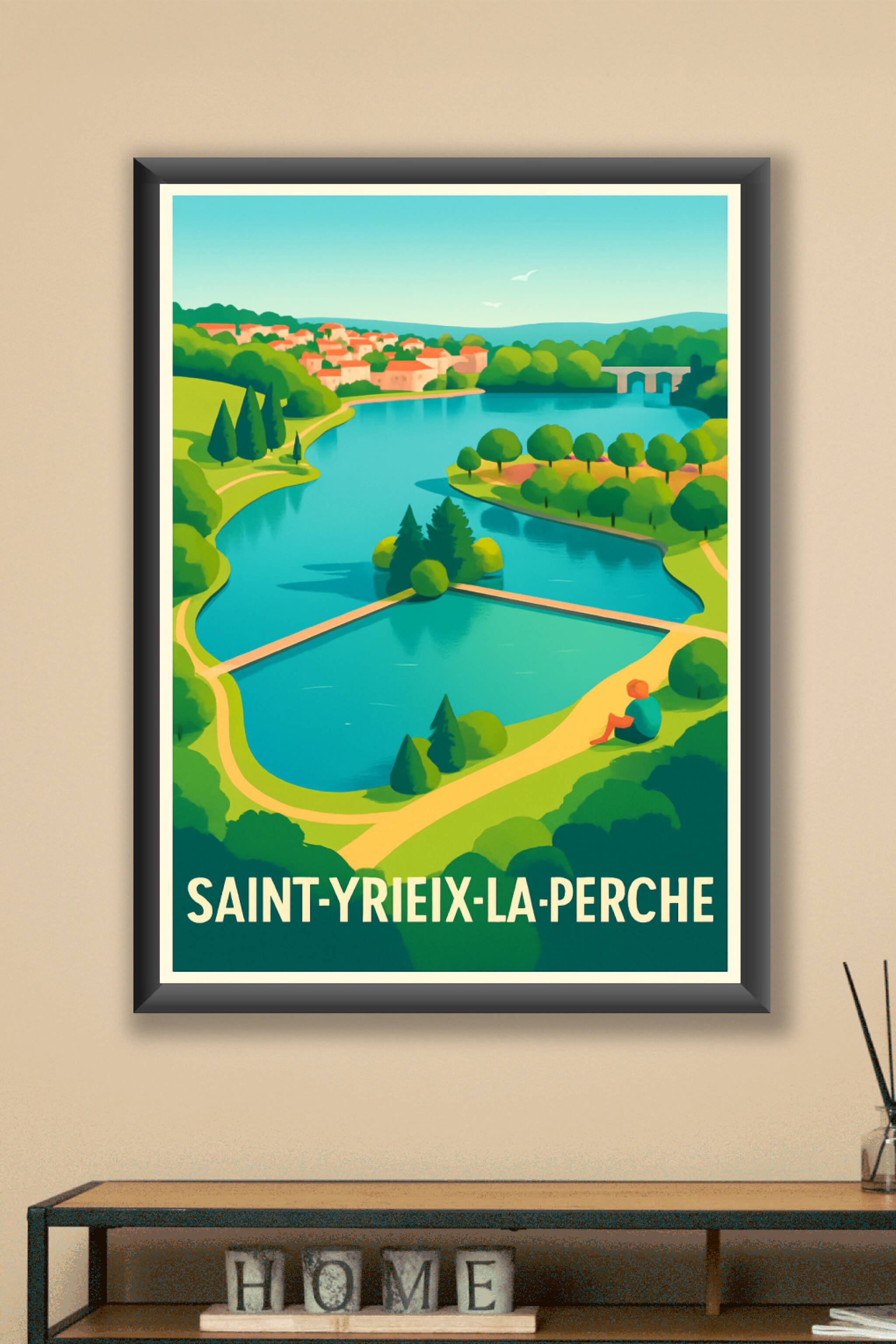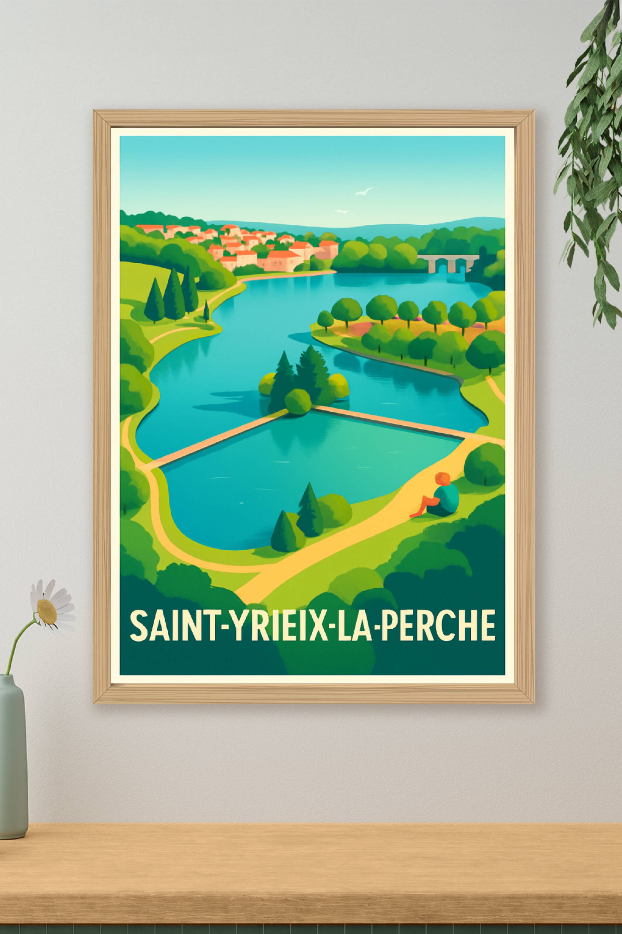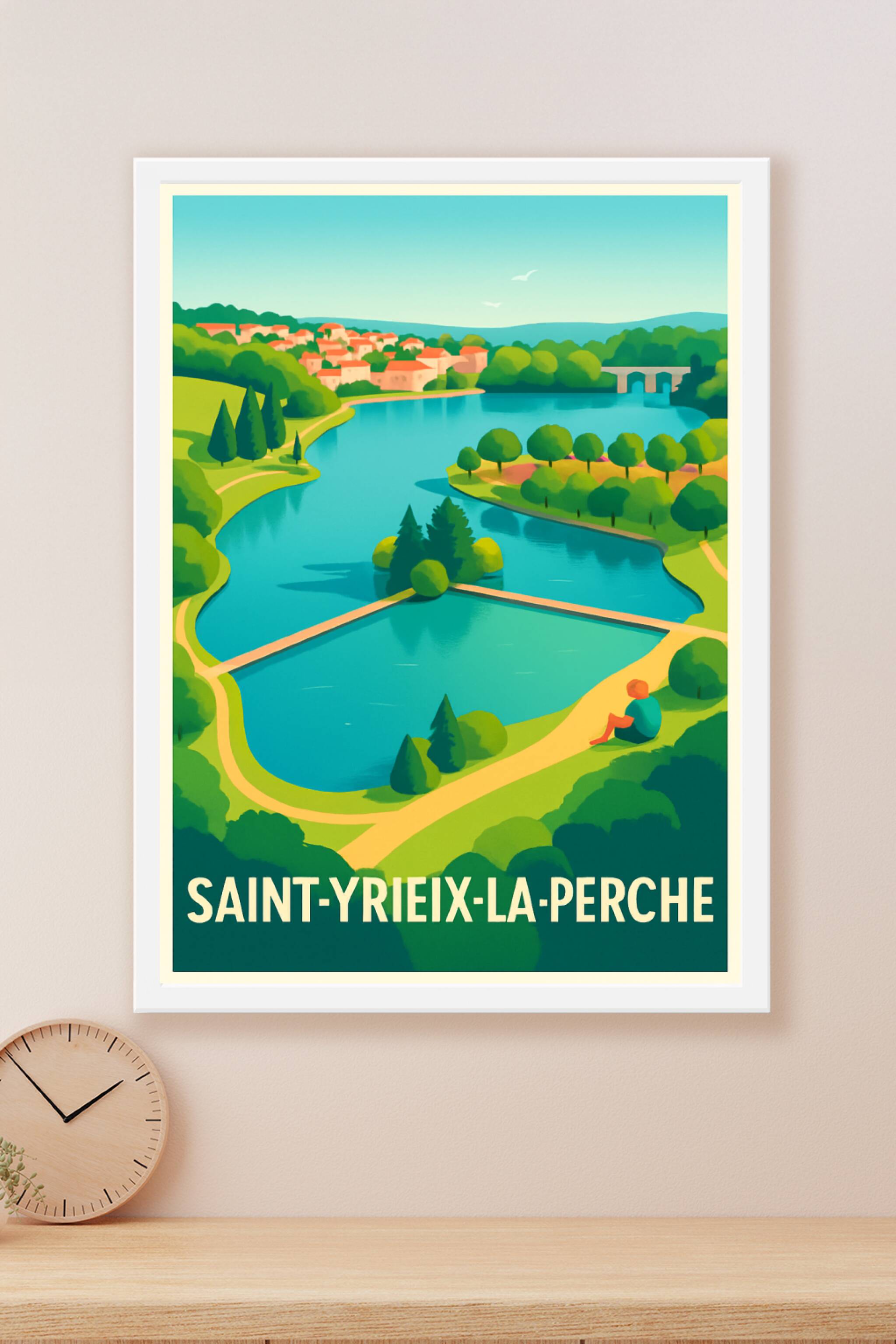 Découvrez la sérénité de Saint-Yrieix-la-Perche à travers cette magnifique affiche illustrée mettant en scène ses paysages verdoyants et ses eaux c...
