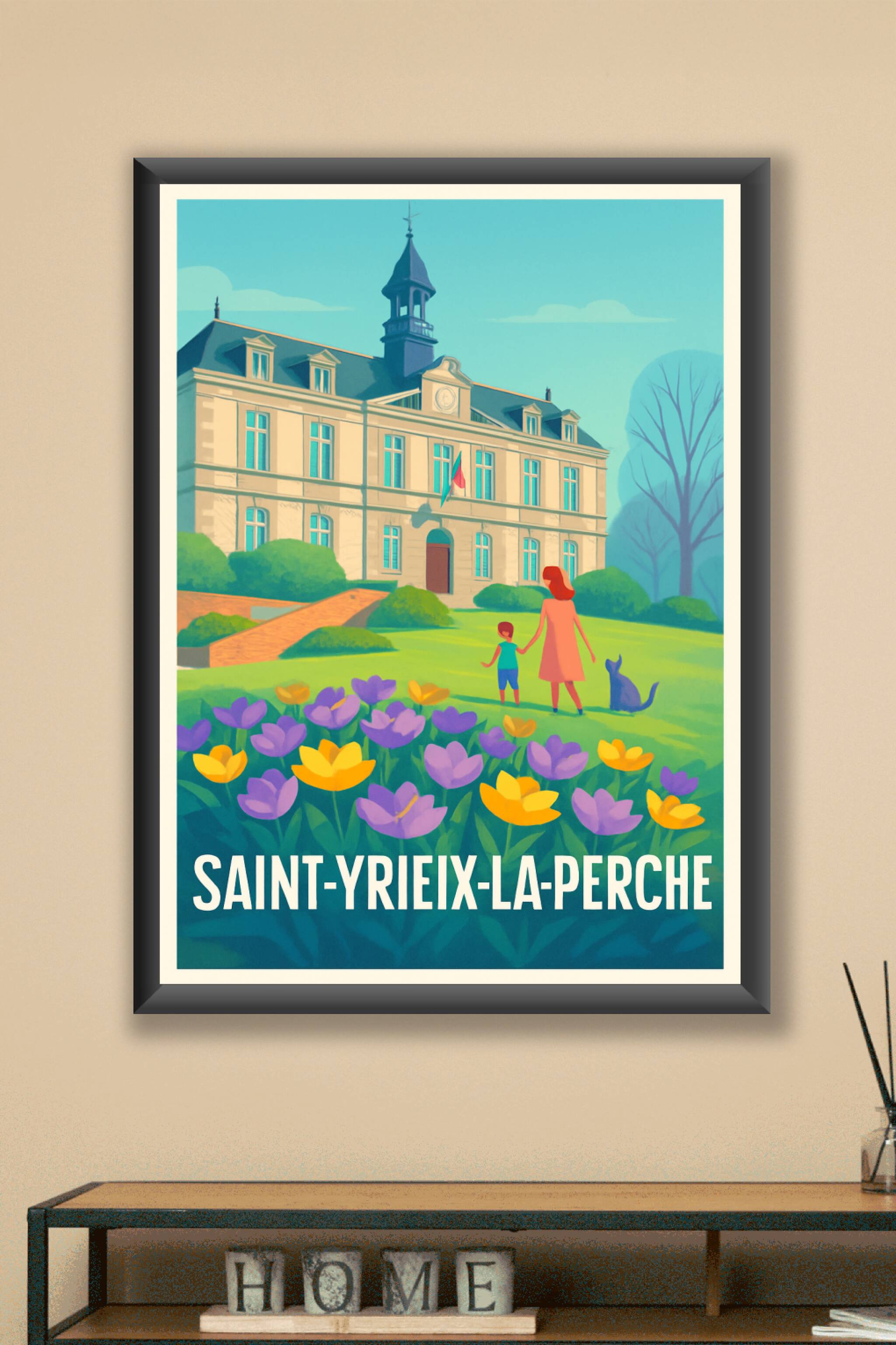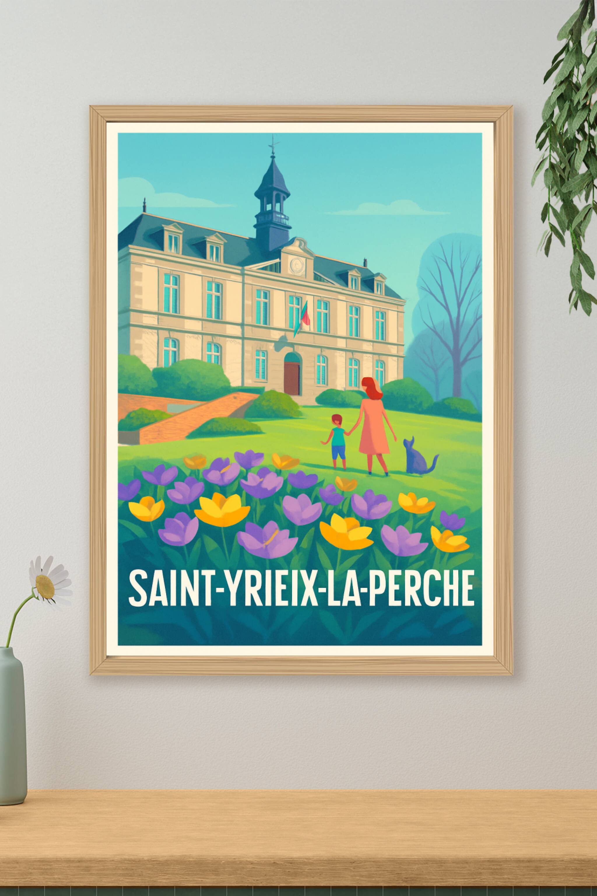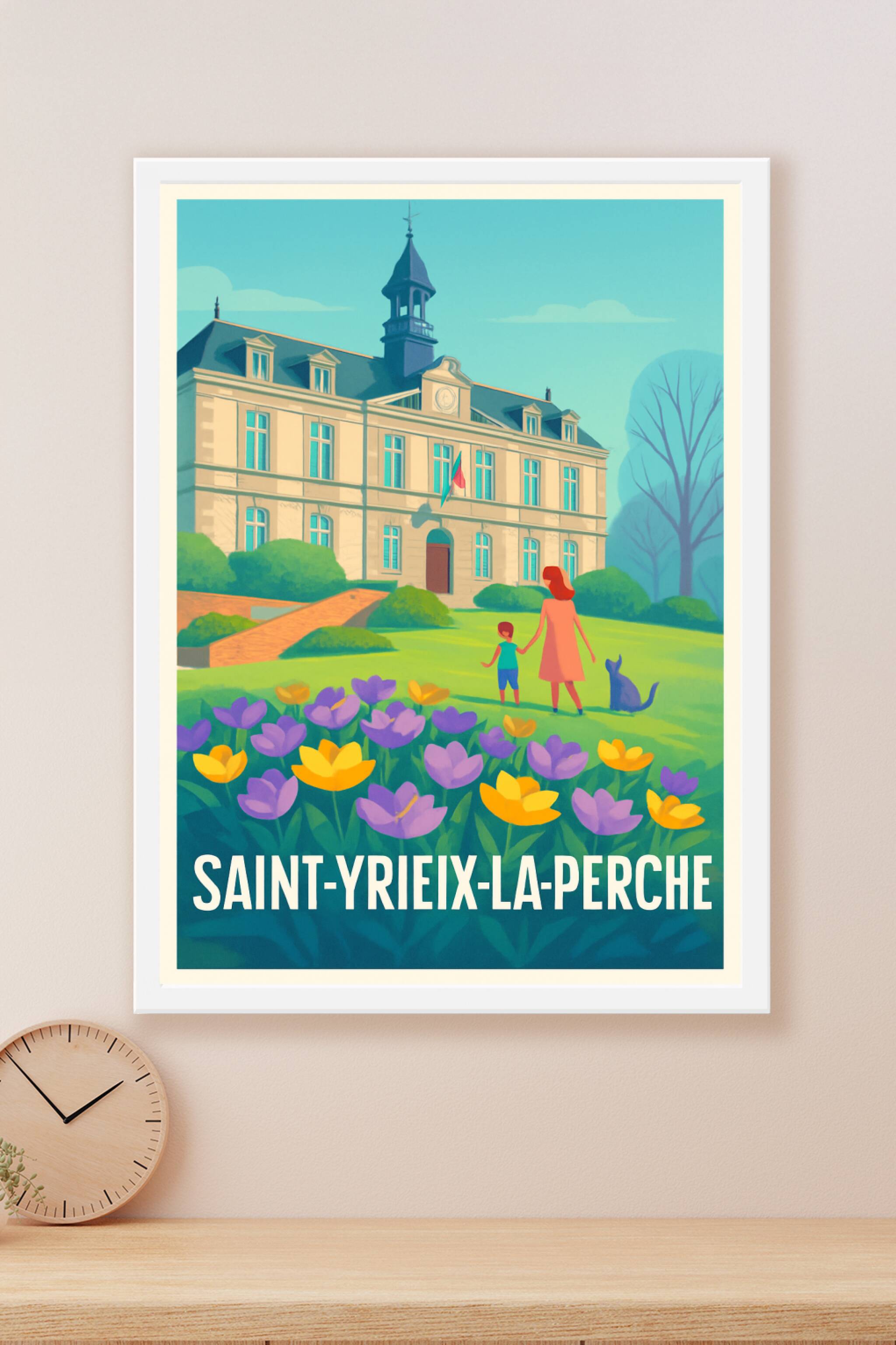 Découvrez la douceur de vivre à Saint-Yrieix-la-Perche avec cette affiche illustrée mettant en scène un bâtiment emblématique entouré de fleurs écl...