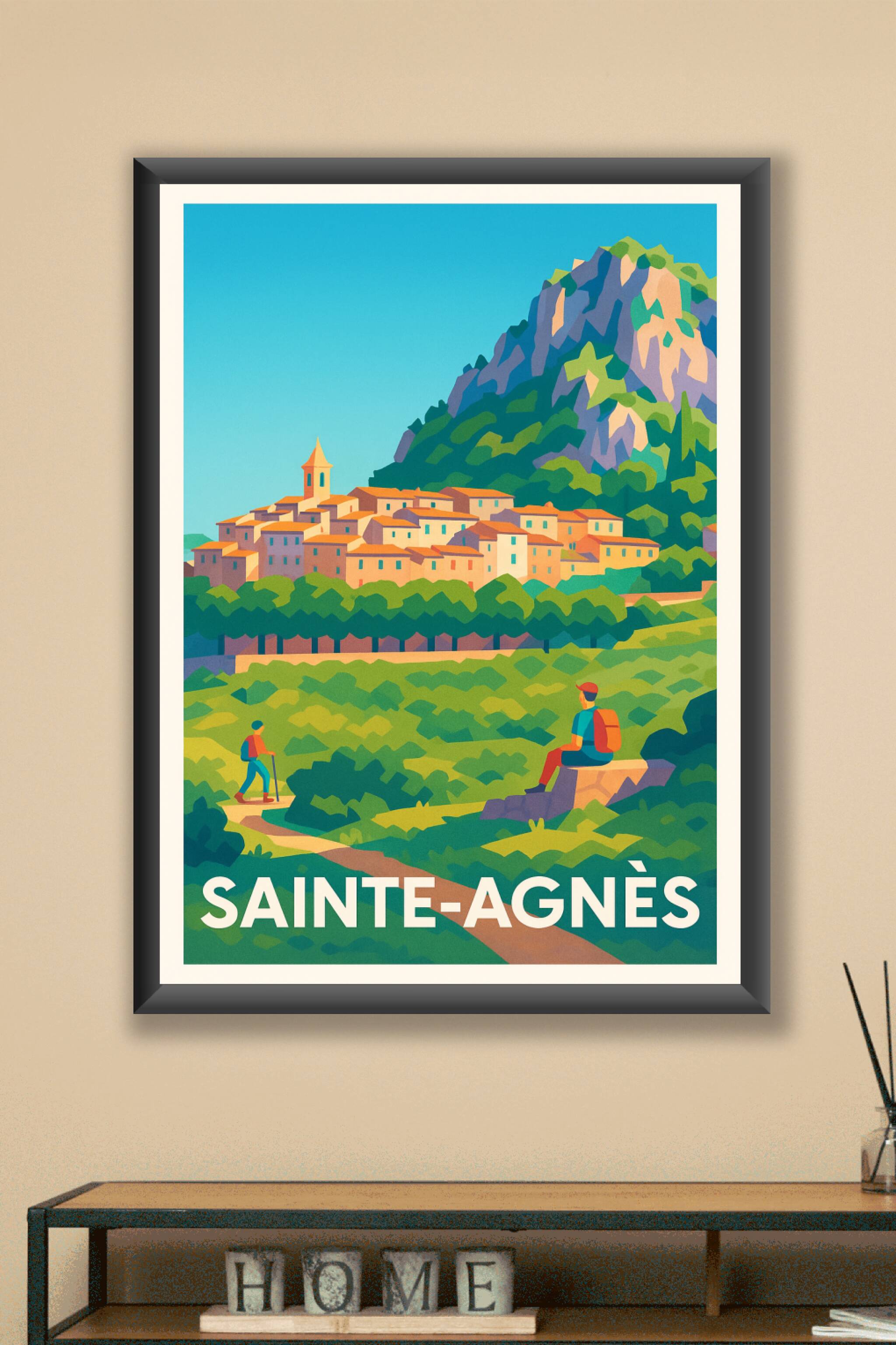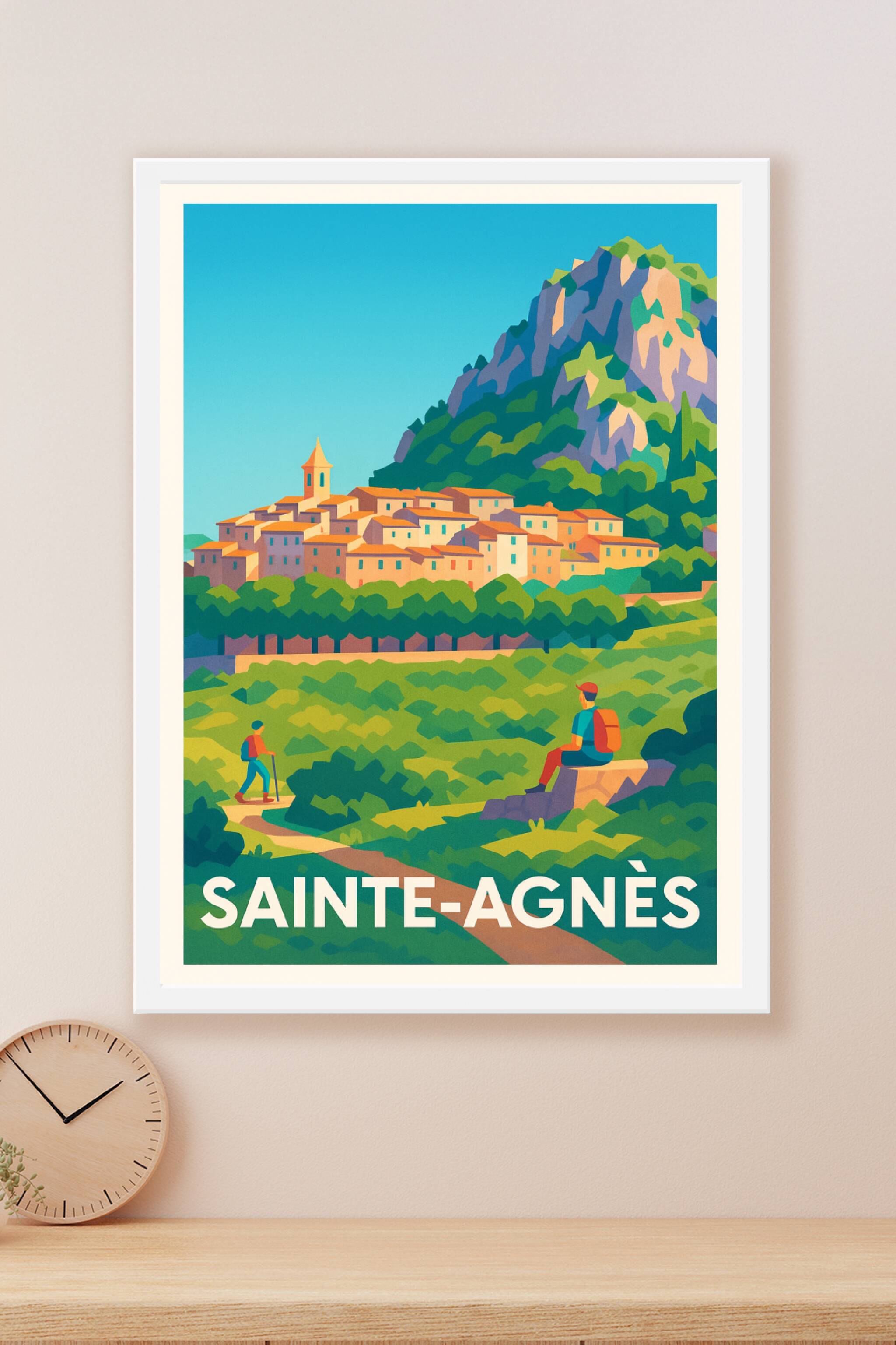 Découvrez la beauté paisible de Sainte-Agnès à travers cette affiche au style vintage coloré, mettant en scène le village perché au pied des montag...