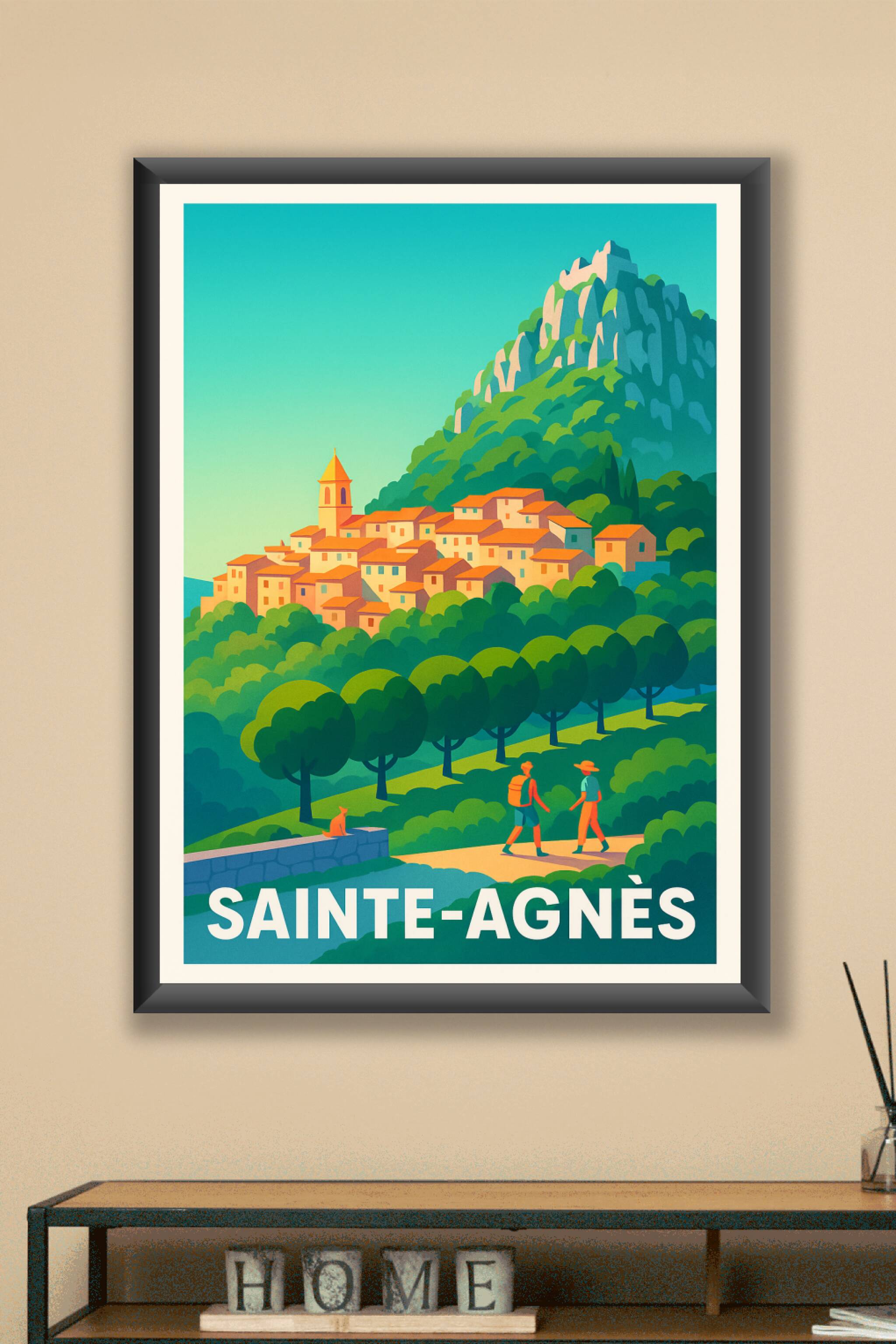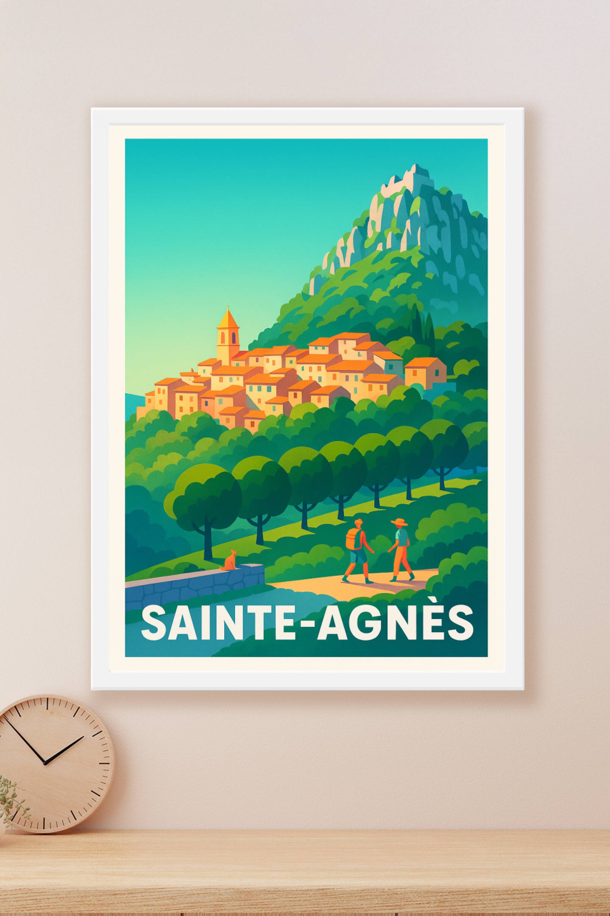 Découvrez le charme unique du village perché de Sainte-Agnès avec cette affiche illustrée aux couleurs vives et contrastées qui capturent la séréni...