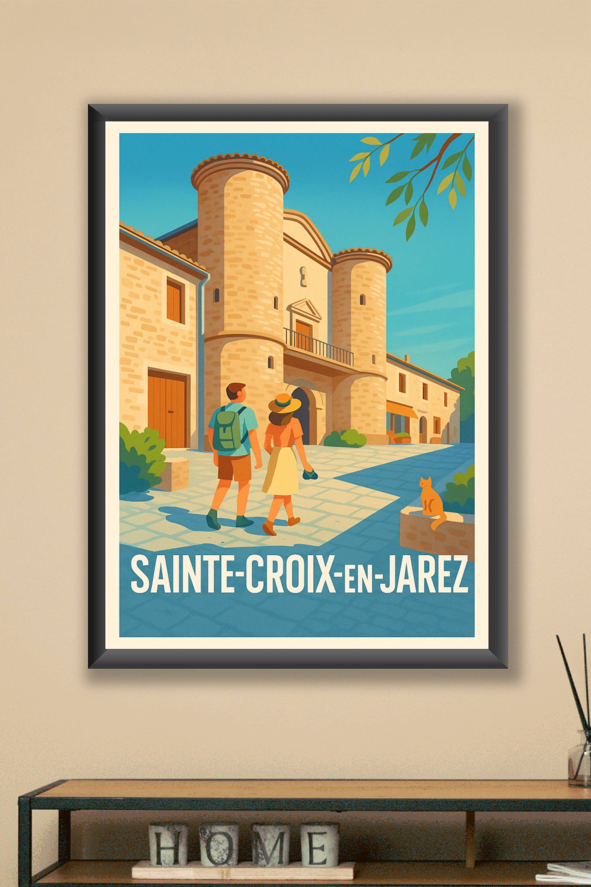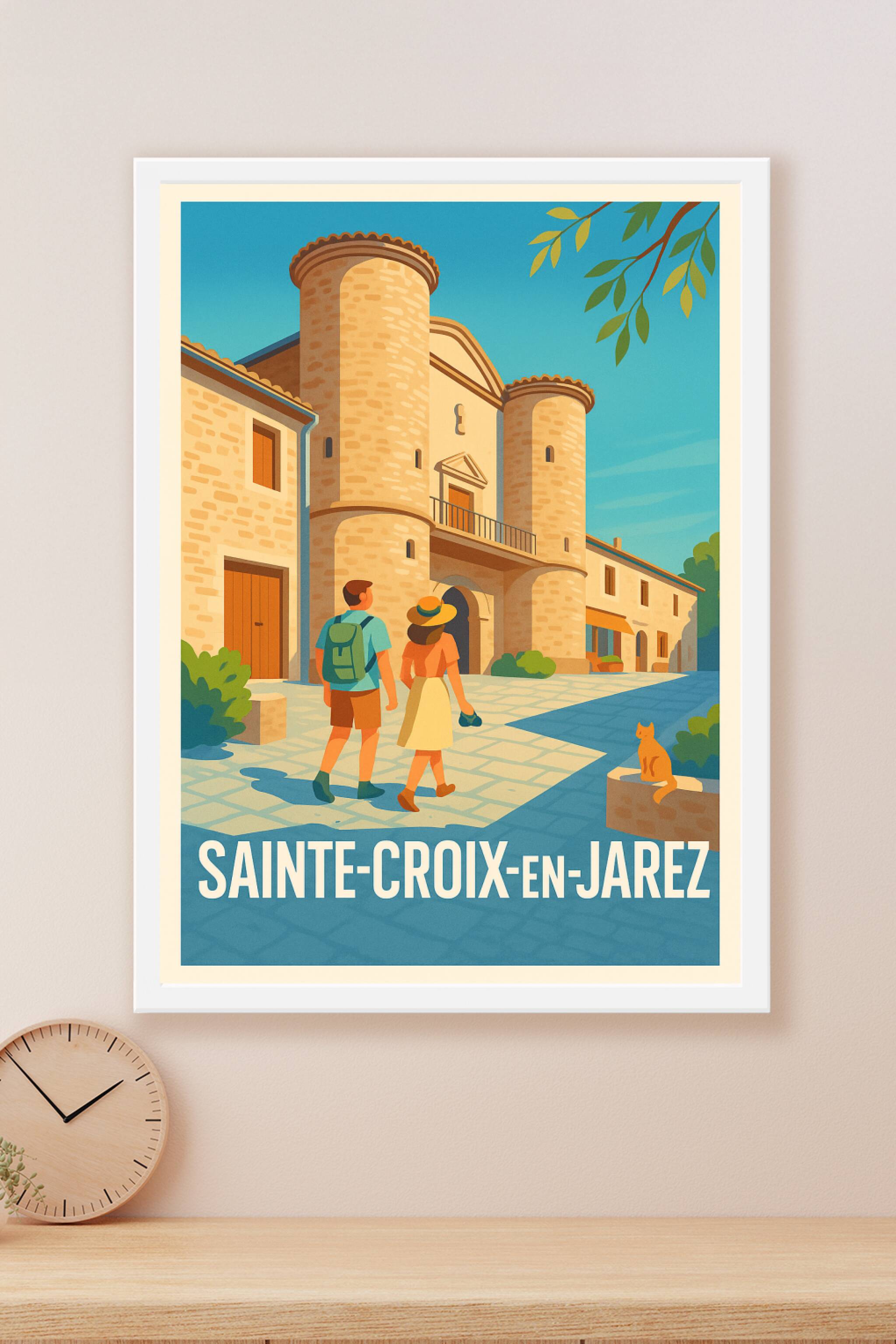Découvrez la beauté authentique de Sainte-Croix-en-Jarez avec cette affiche illustrée mettant en scène son architecture médiévale unique sous un ci...