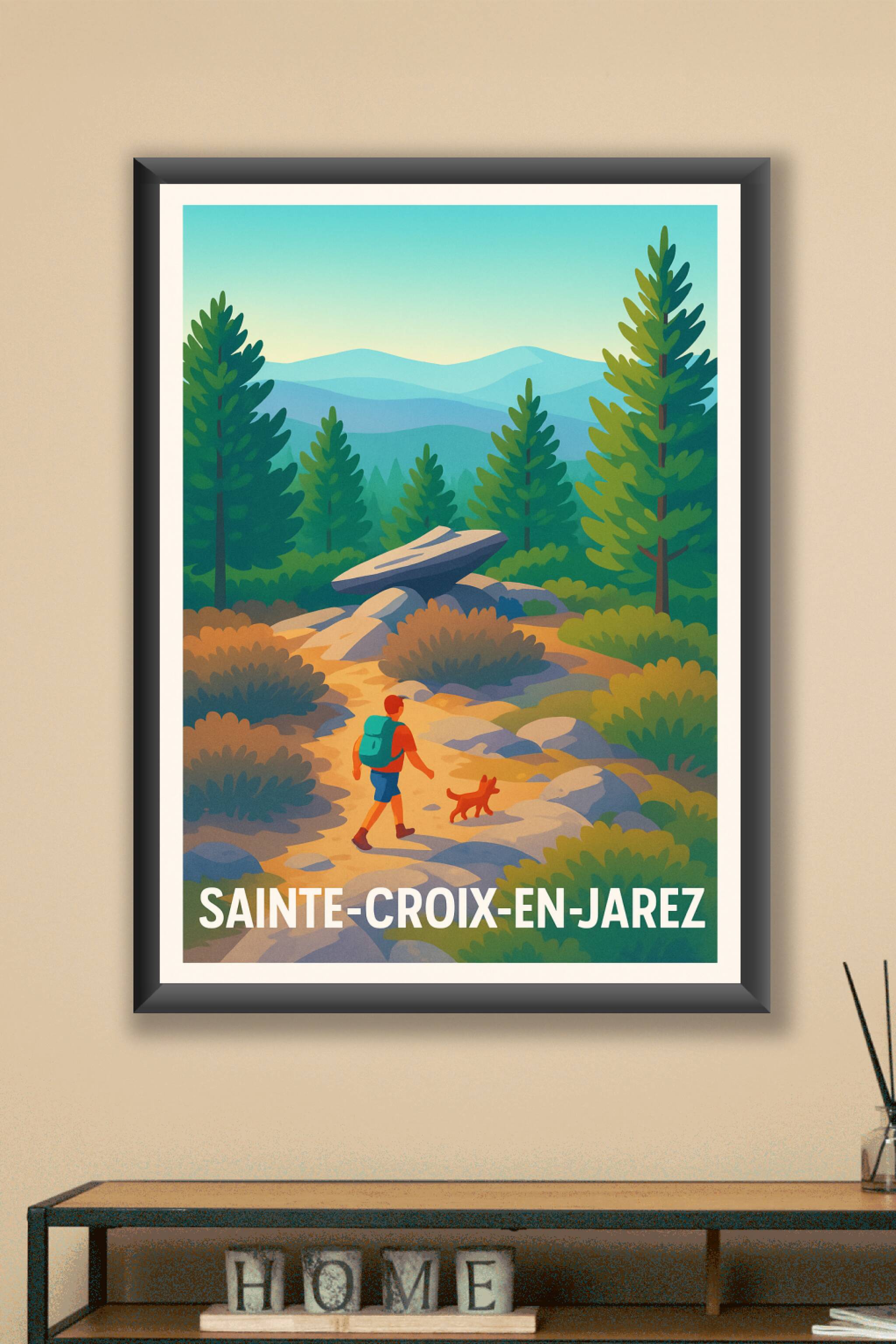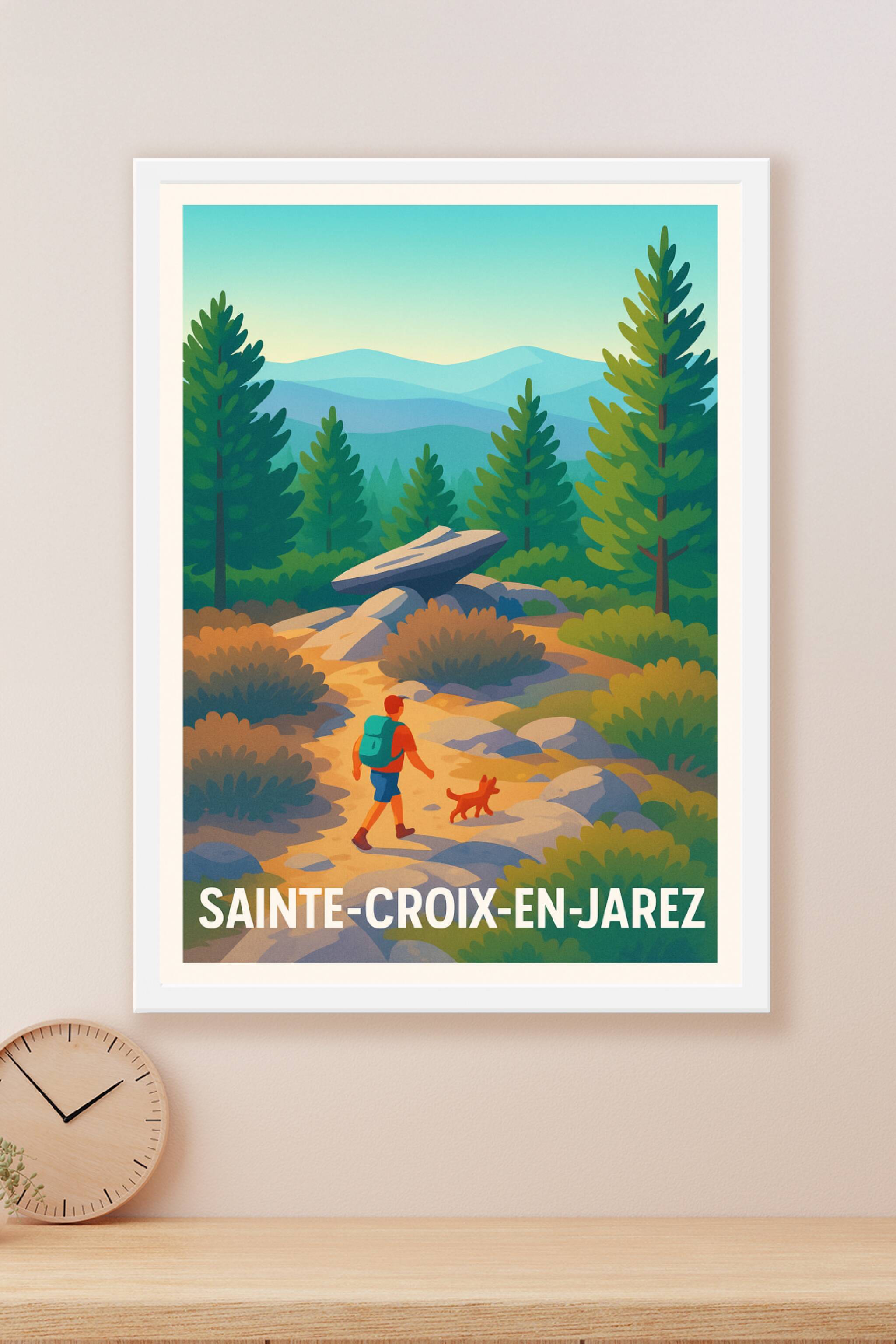 Découvrez la beauté sereine des paysages de Sainte-Croix-en-Jarez avec cette affiche illustrant une promenade en pleine nature, entre sentiers cail...