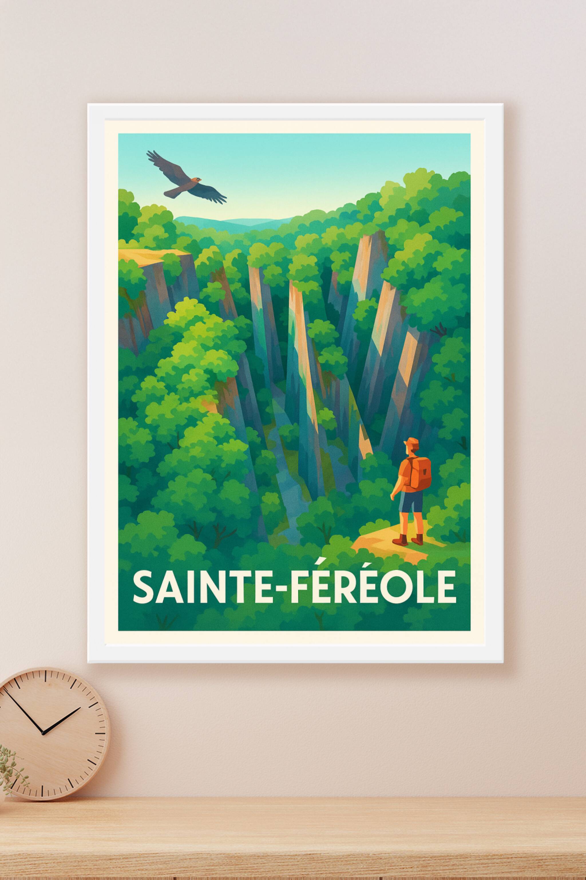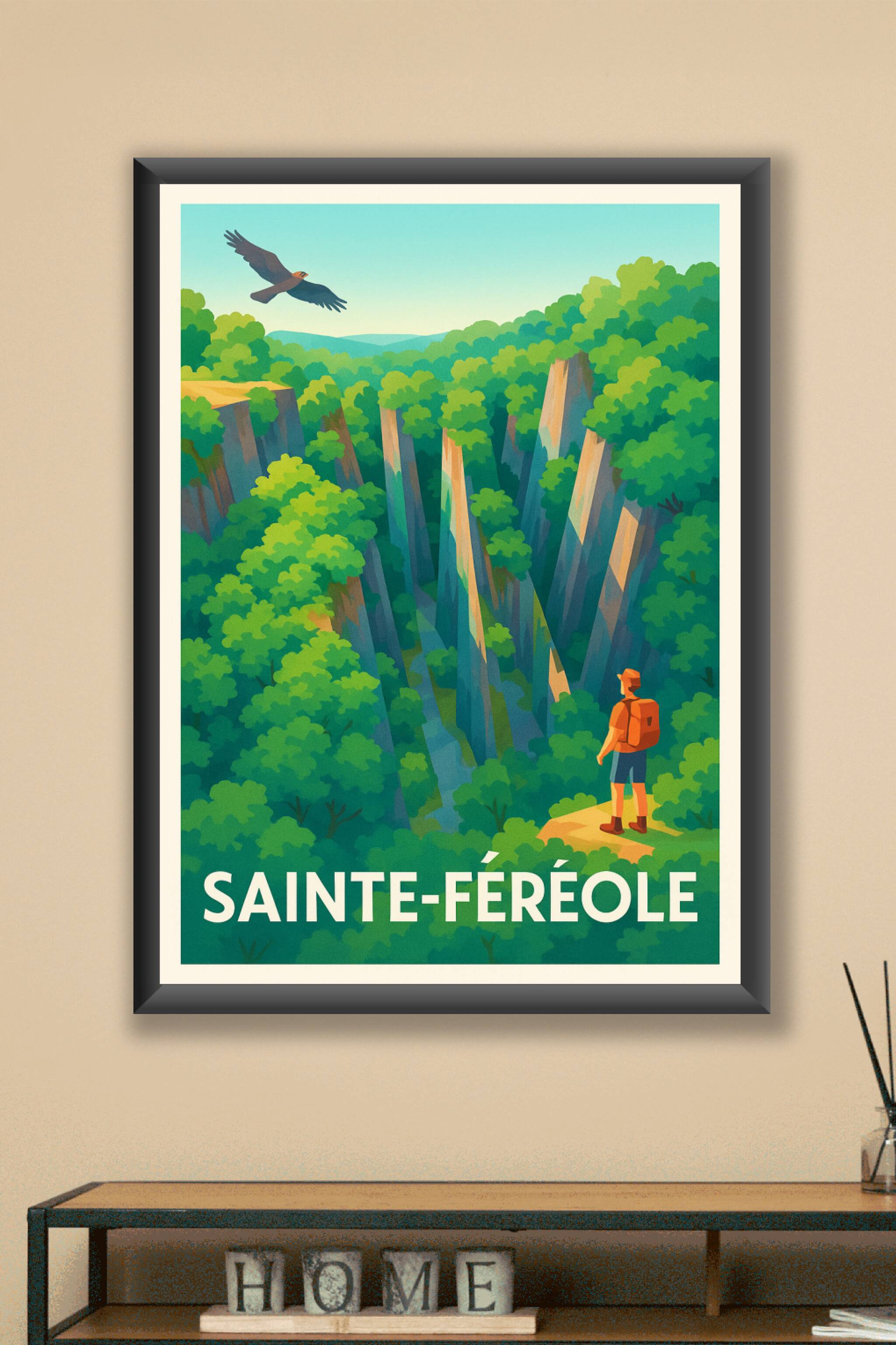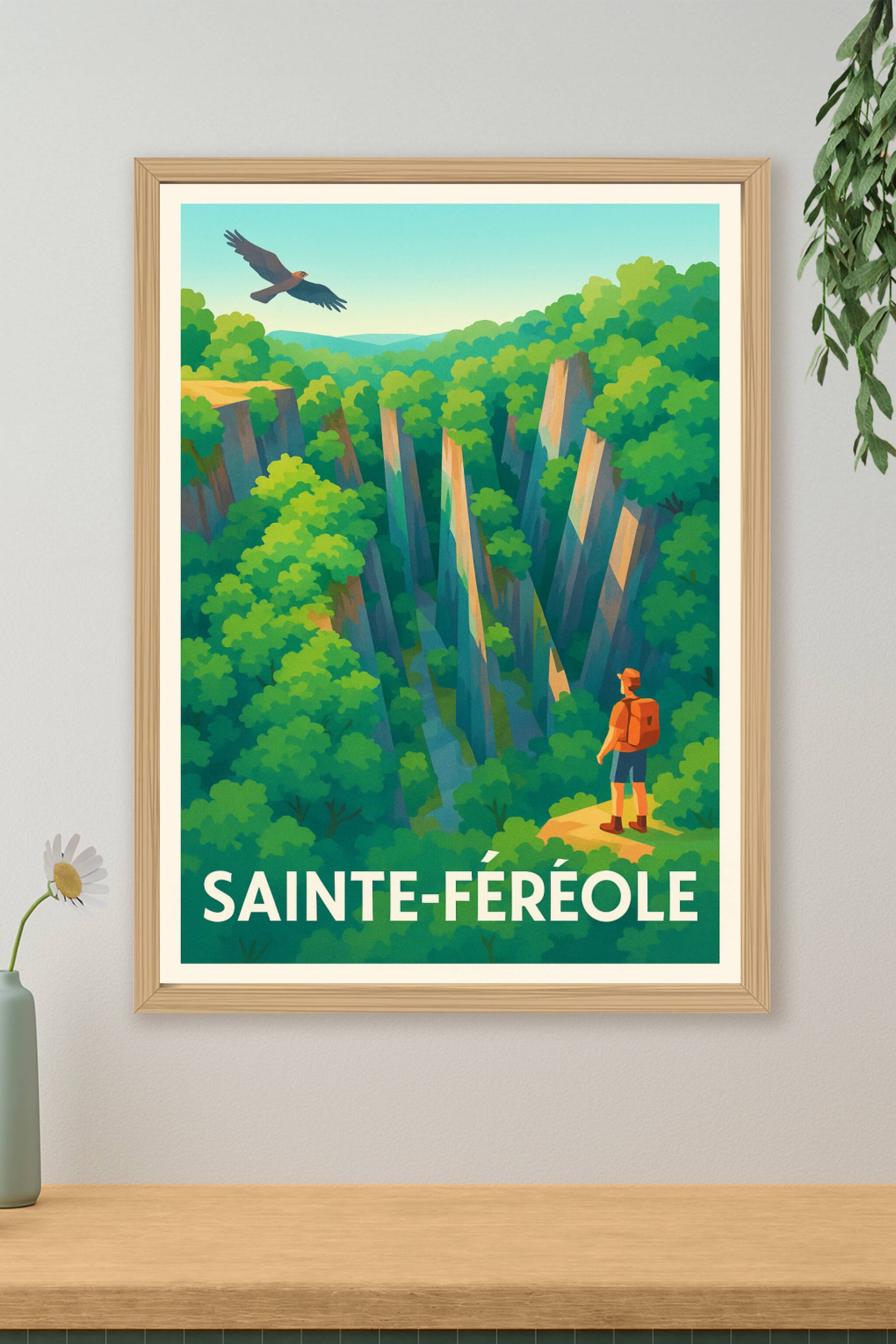 Découvrez la beauté sauvage et apaisante de Sainte-Féréole avec cette affiche illustrée, représentant un aventurier contemplant une gorge majestueu...