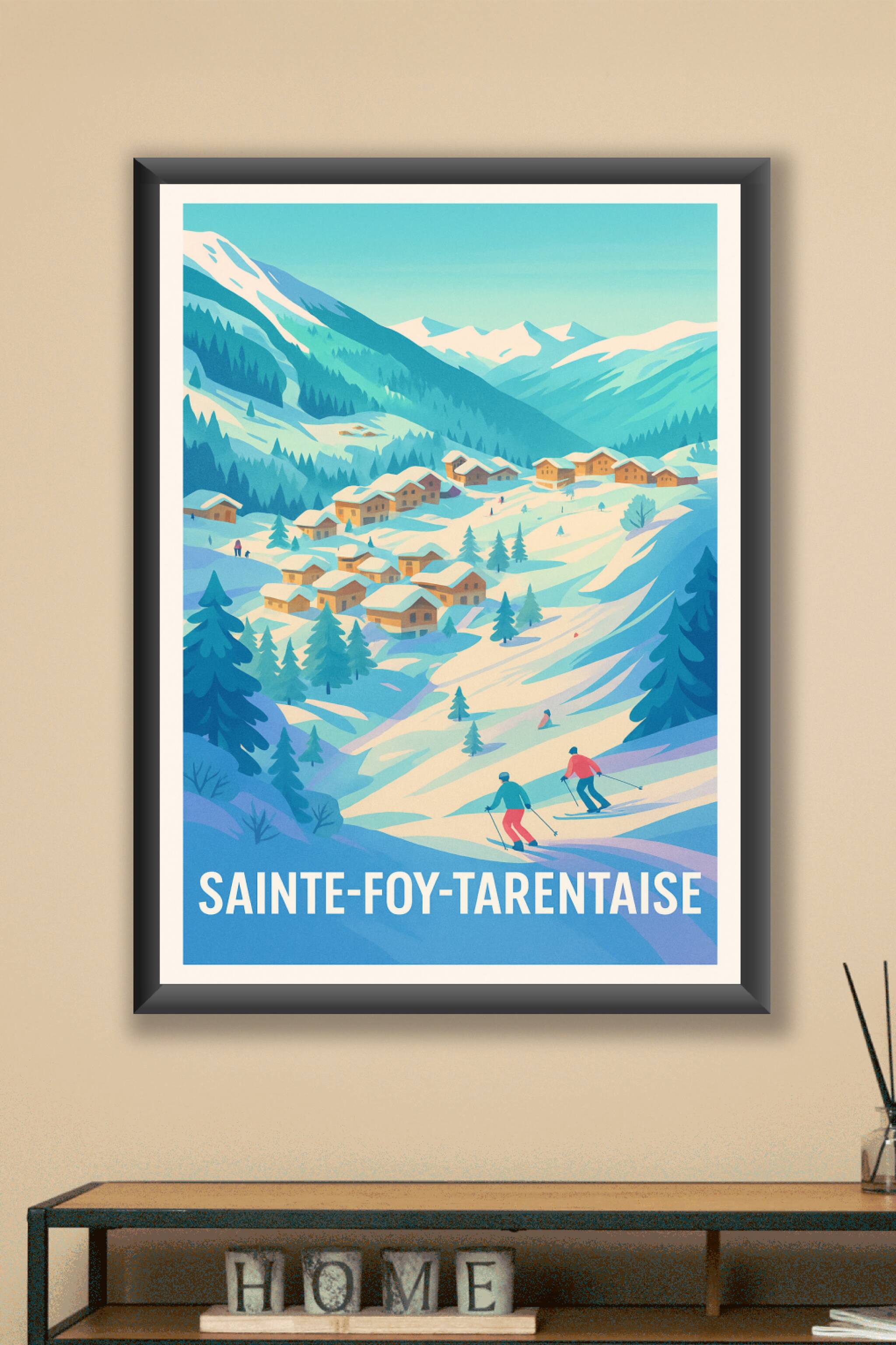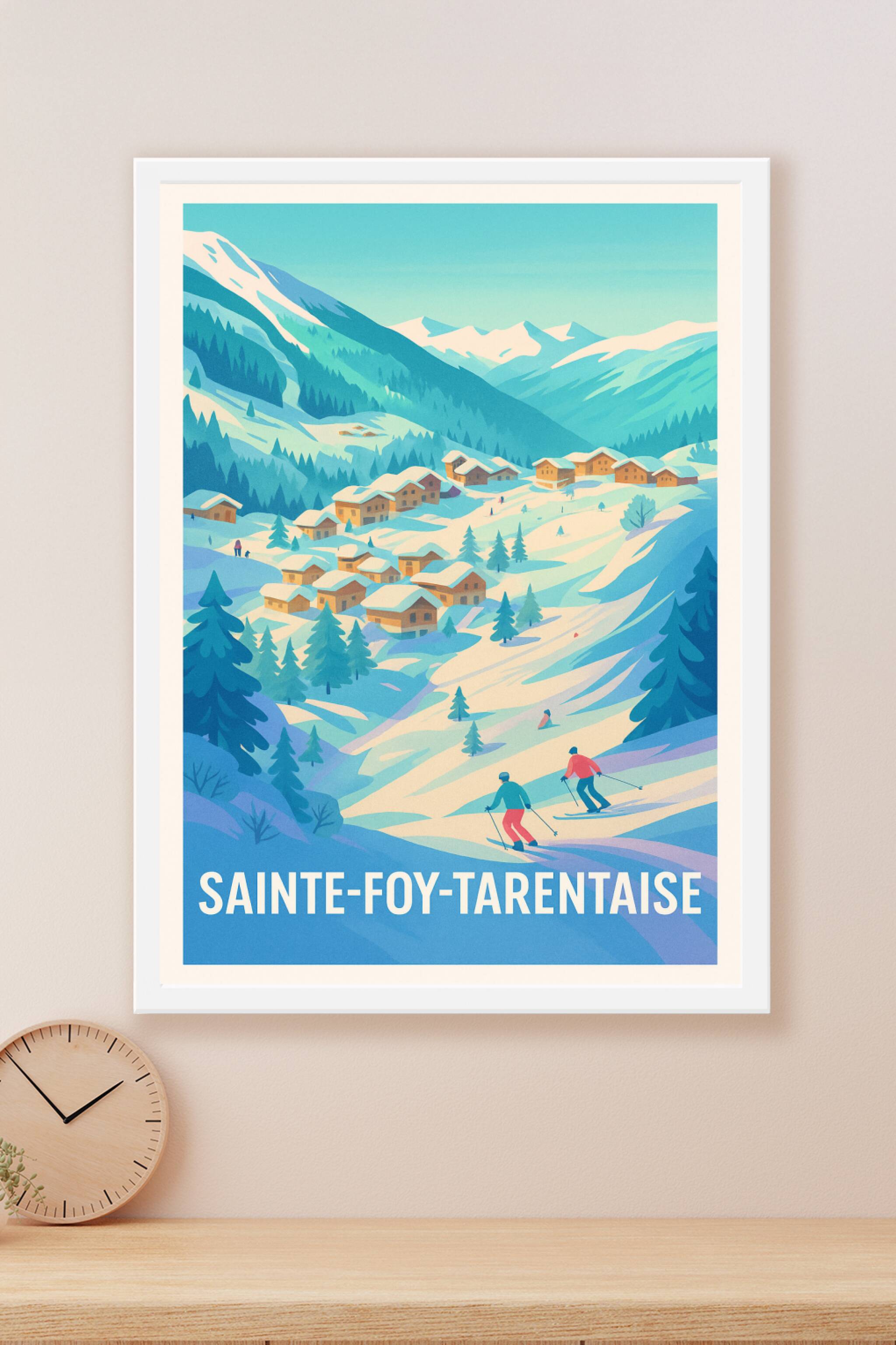 Découvrez l'atmosphère paisible et enneigée de Sainte-Foy-Tarentaise avec cette affiche vintage au style graphique élégant et épuré. Représentant l...