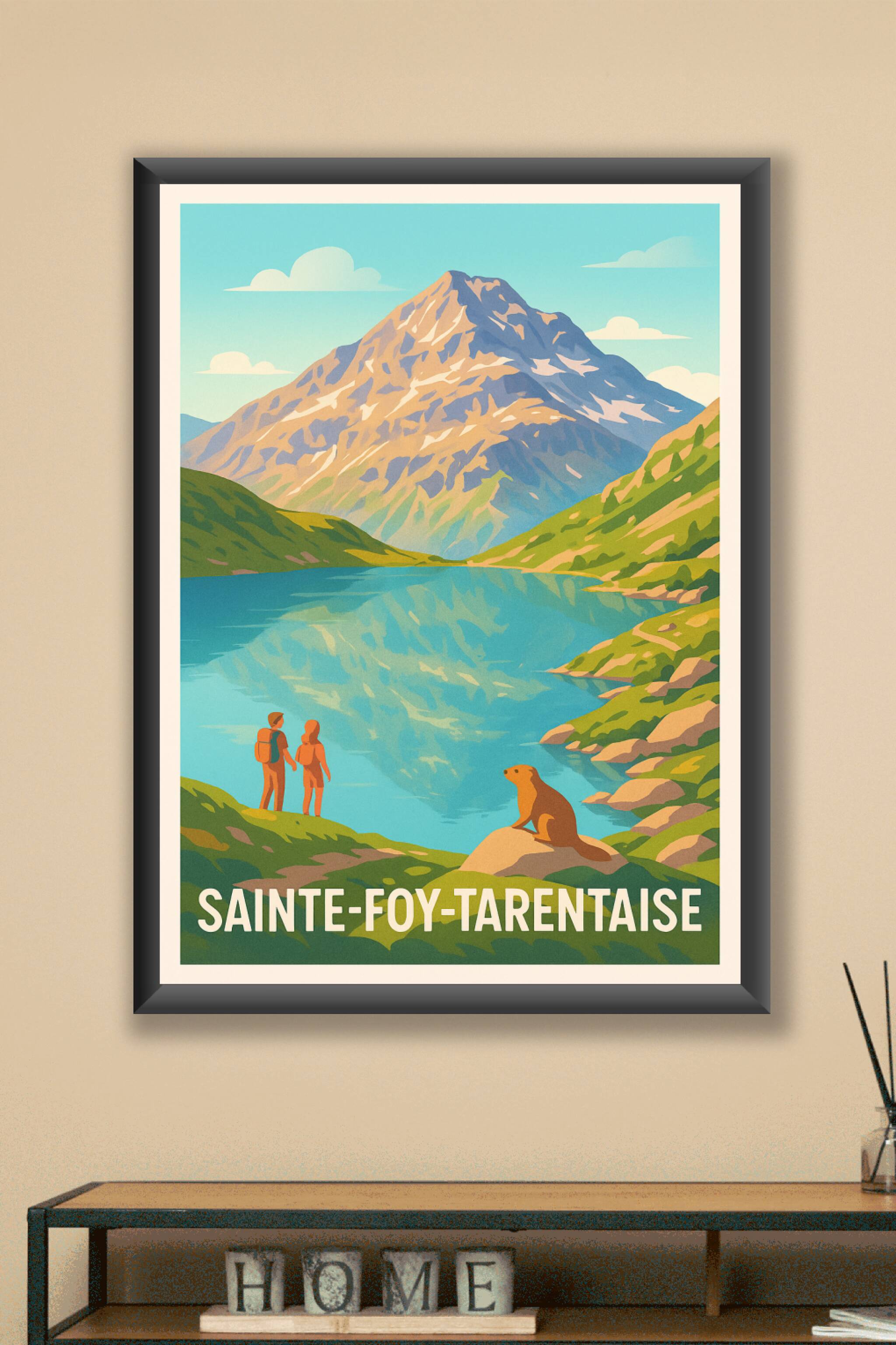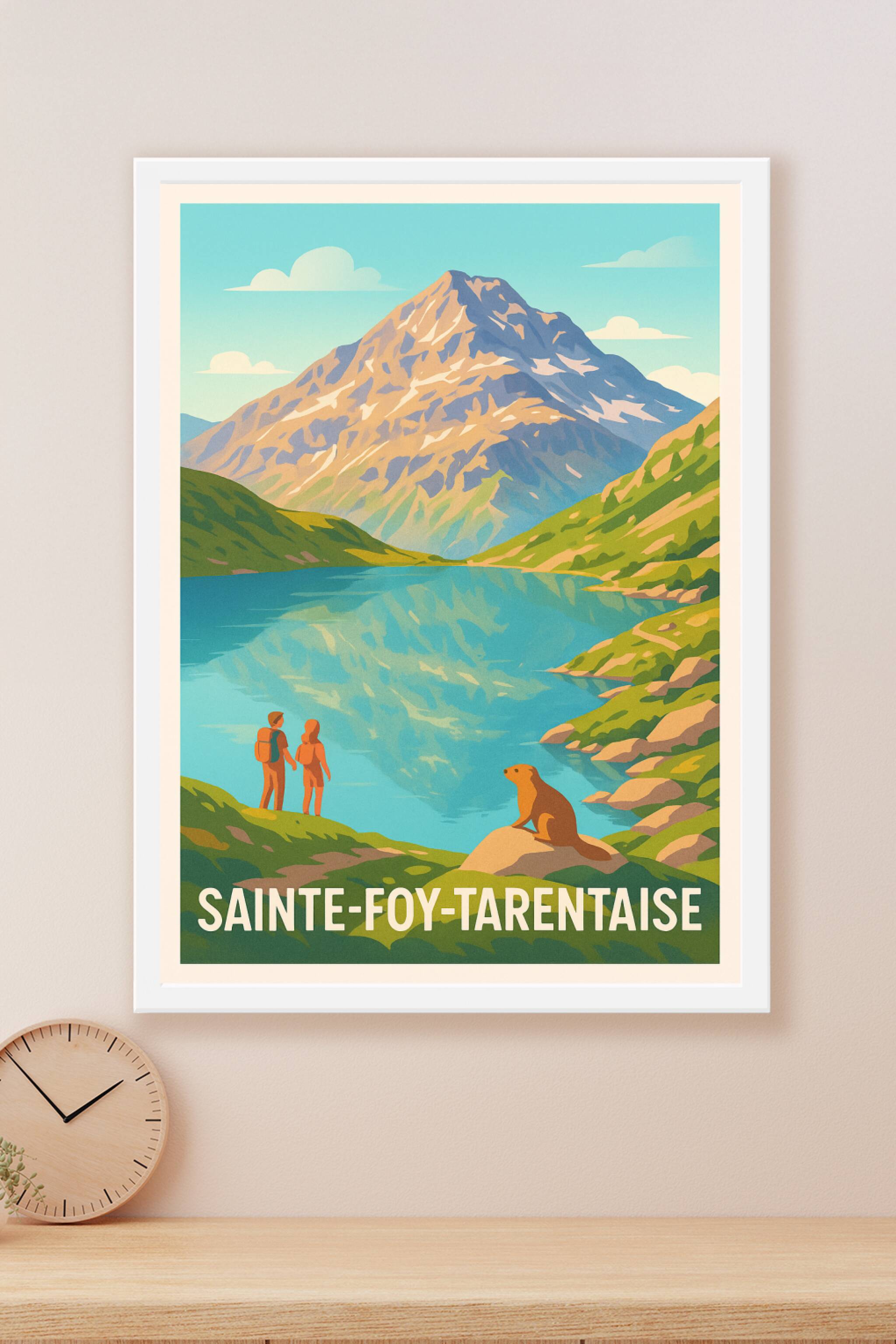 Découvrez la beauté sauvage de Sainte-Foy-Tarentaise avec cette affiche illustrée représentant un paysage alpin idyllique où montagnes majestueuses et lacs cristallins se mêlent à une atmosphère paisible. Ce poster met en scène deux randonneurs admirant la vue et une marmotte qui symbolise la faune locale, parfait pour les passionnés de nature et d'aventure. Imprimée en tirage "Fine Art" sur un papier coton 305g de haute qualité, cette affiche garantit des couleurs éclatantes et une longue tenue dans le temps. Disponible en formats A1 à A4, avec ou sans cadre, elle s’intègre facilement dans tous les styles de décoration intérieure. Offrez-vous une escapade visuelle authentique ou un cadeau idéal grâce à cette impression premium, 100% fabriquée en France.