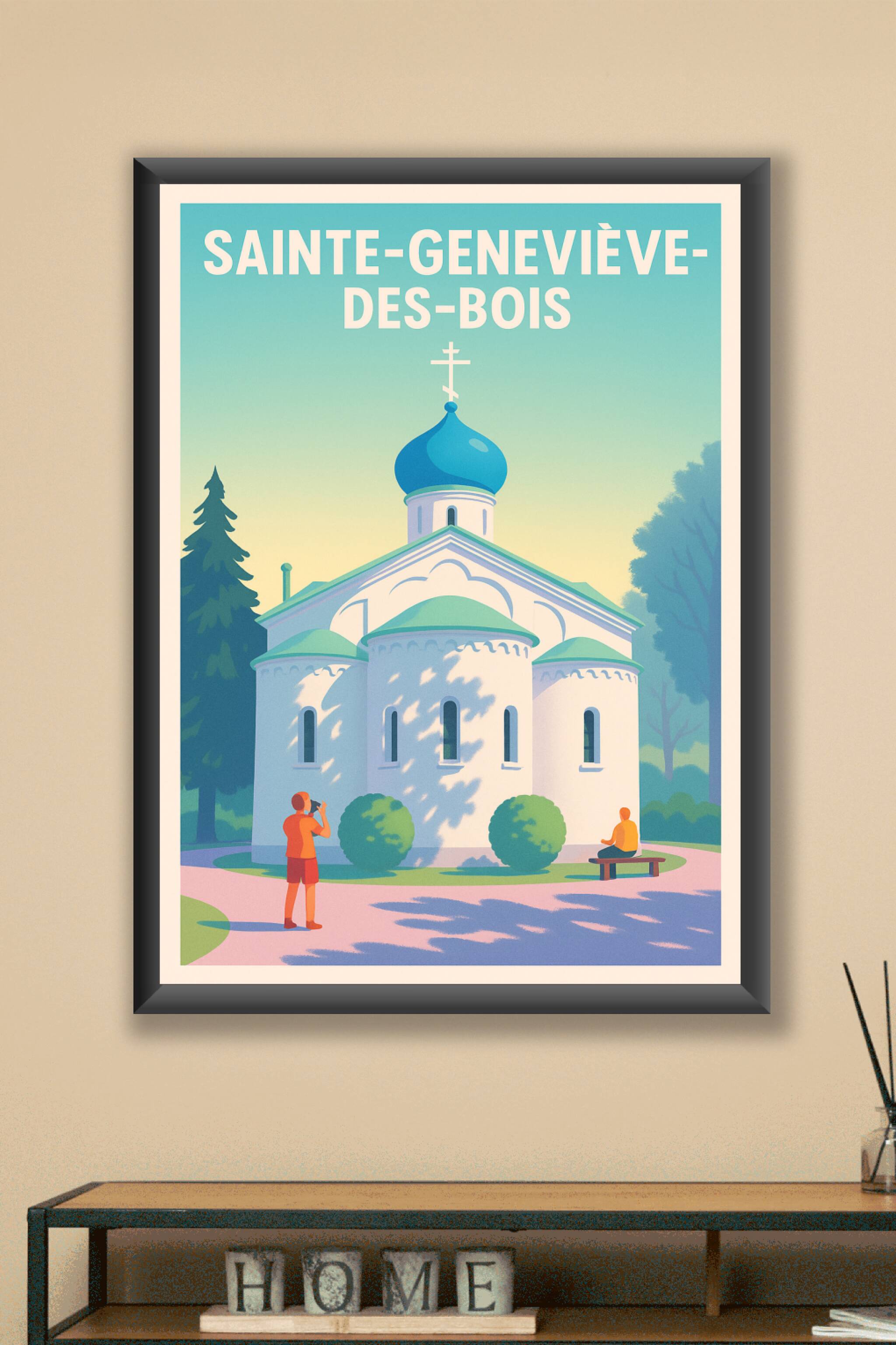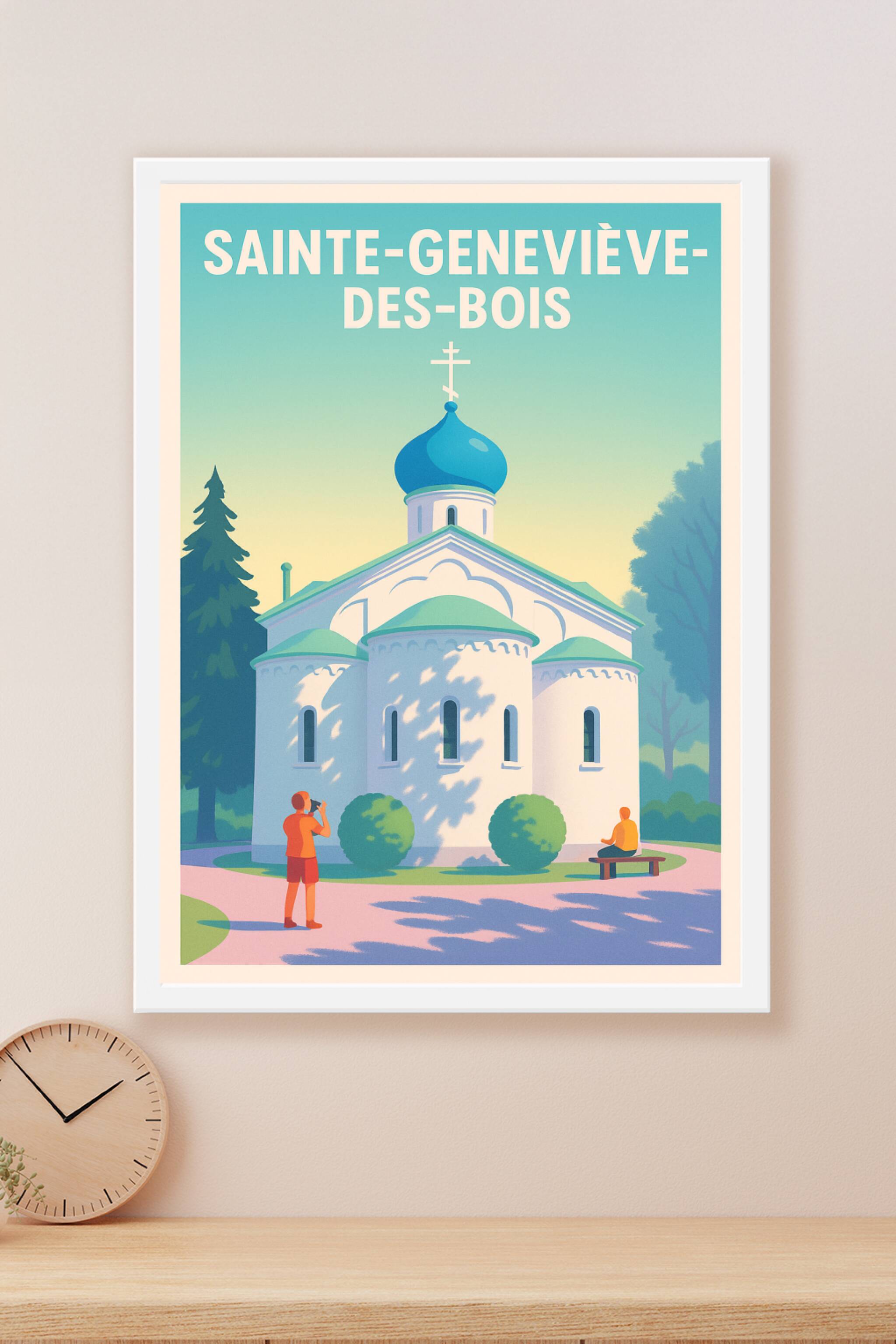 Découvrez la sérénité et l'élégance architecturale de Sainte-Geneviève-des-Bois avec cette affiche illustrée mettant en lumière son église orthodox...