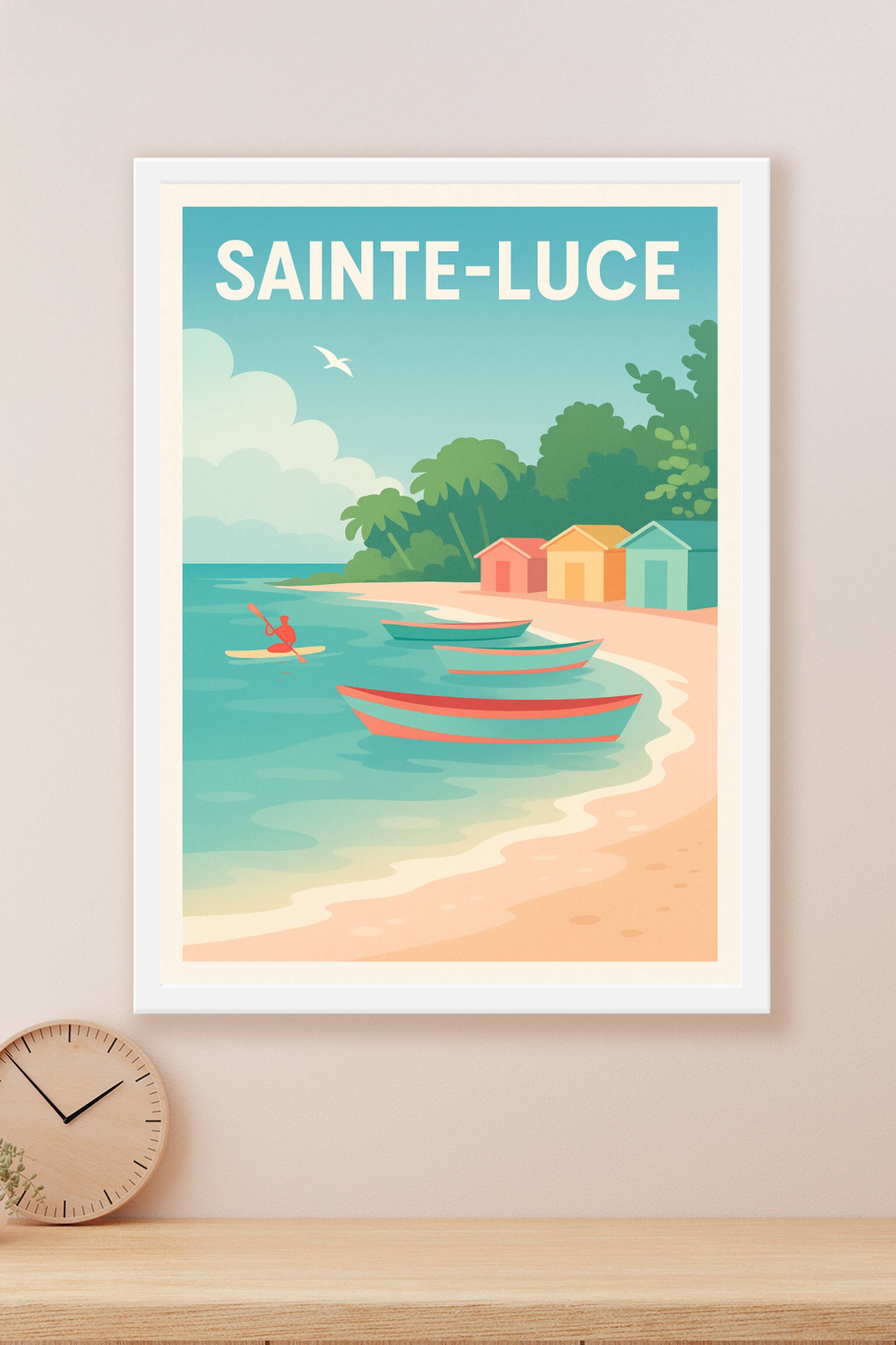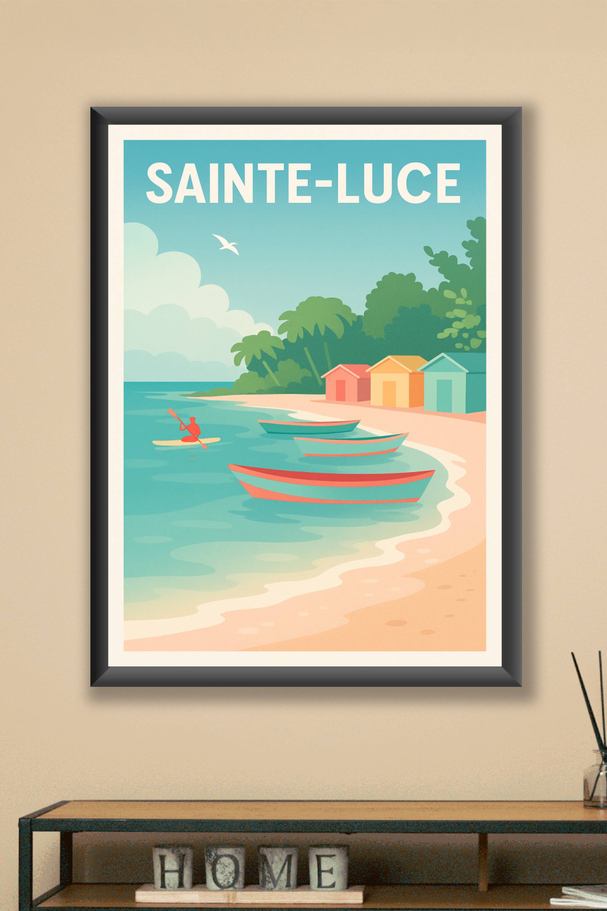 Découvrez la sérénité des plages colorées de Sainte-Luce à travers cette affiche au style vintage et épuré. Cette illustration met en scène des bar...