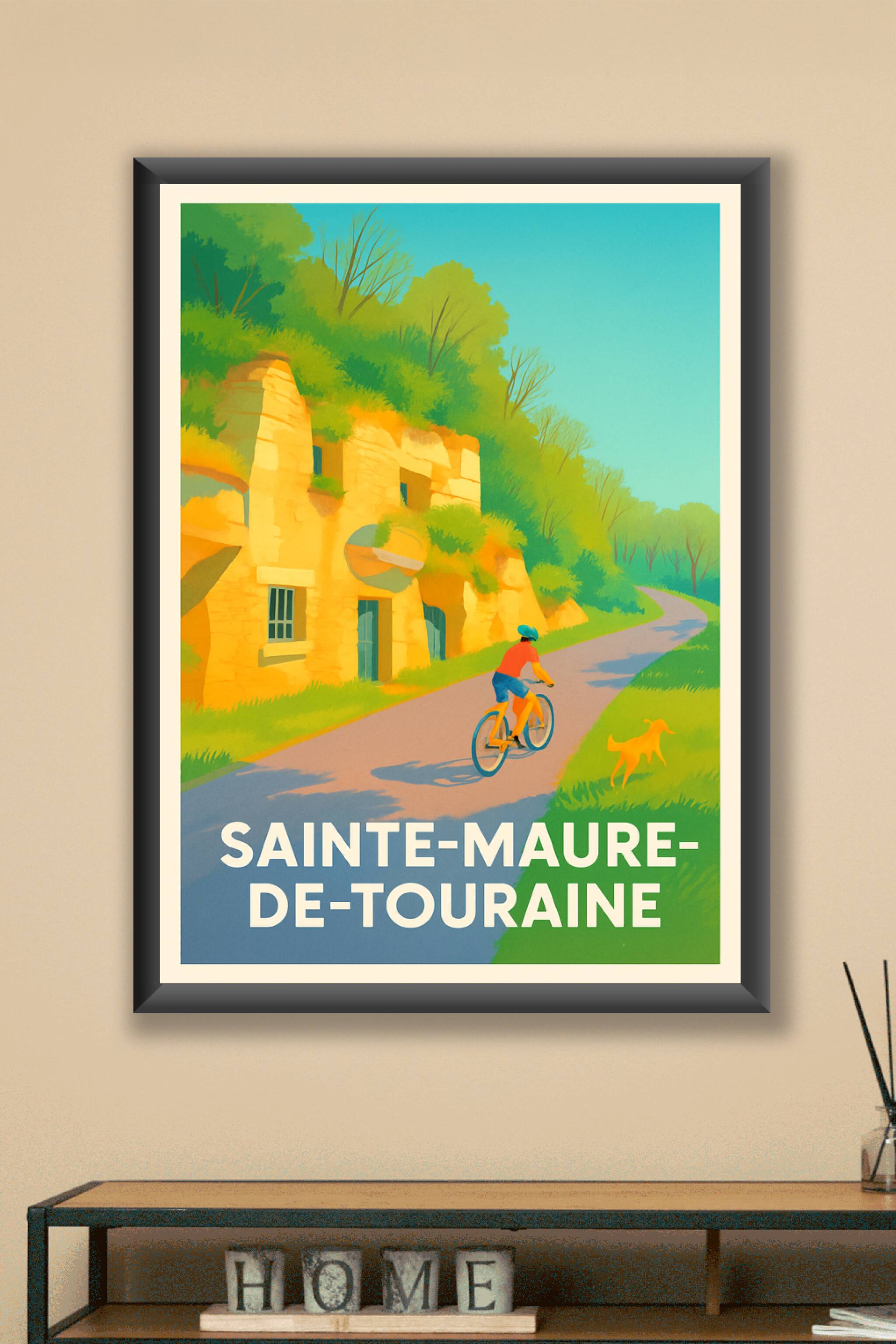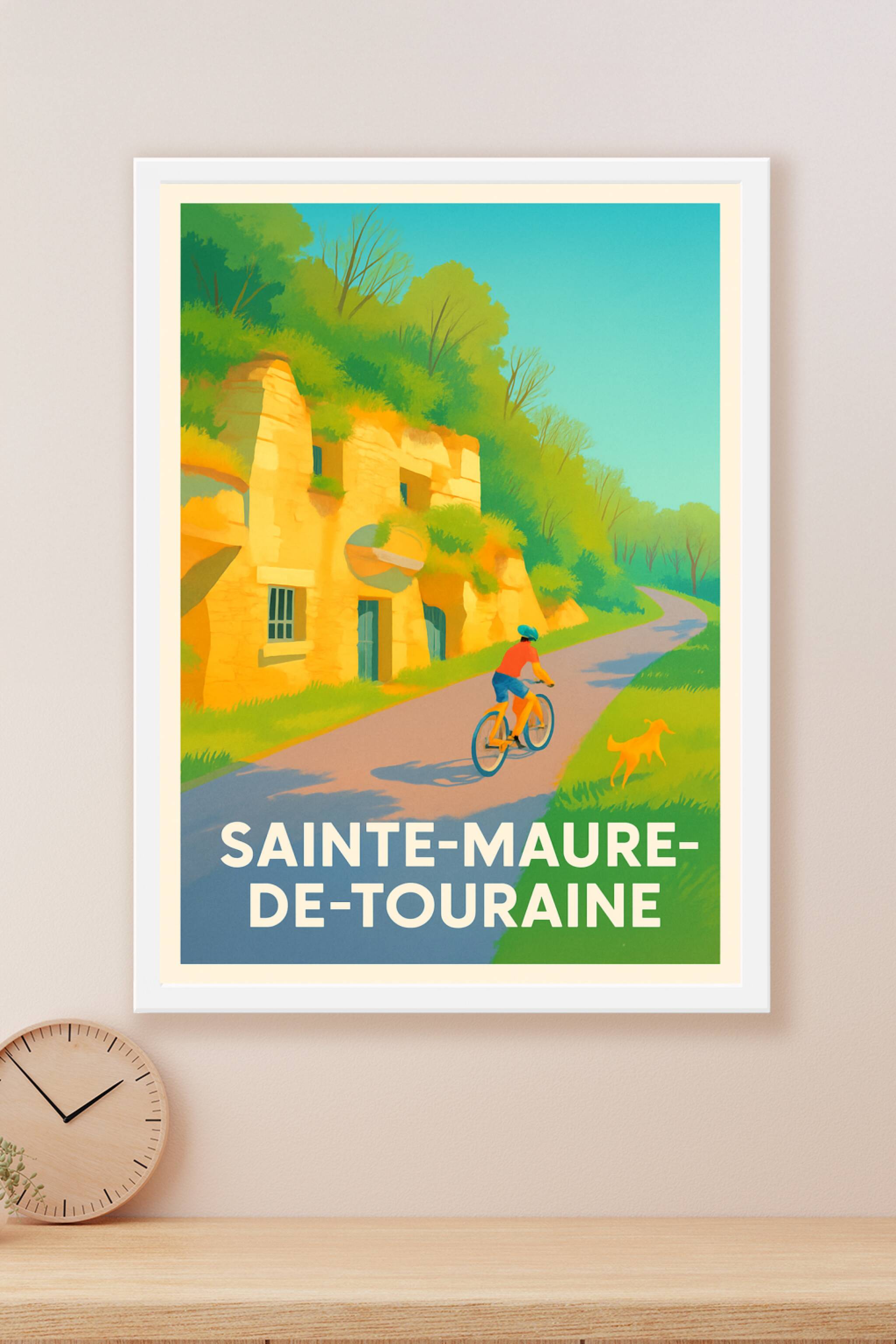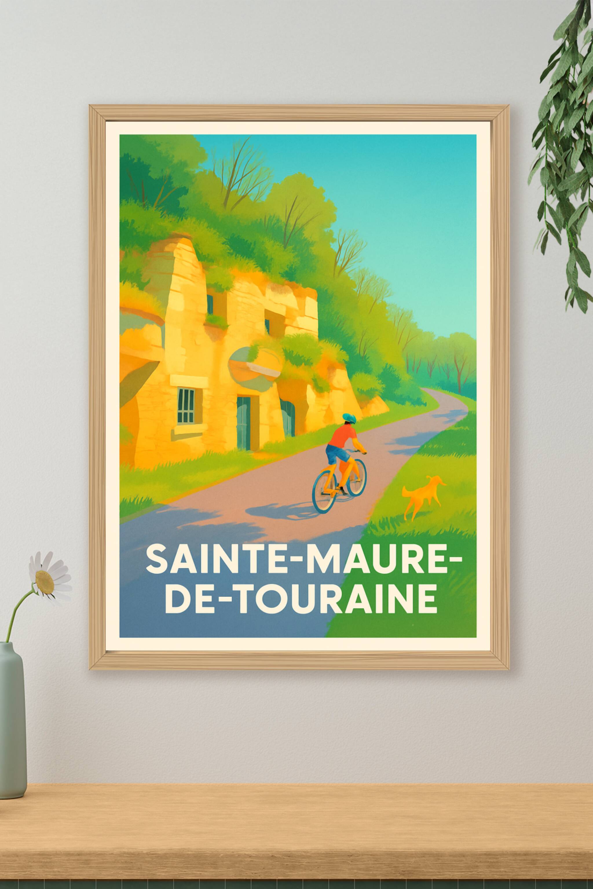 Découvrez le charme bucolique de Sainte-Maure-de-Touraine avec cette affiche illustrée qui capture une balade à vélo au cœur de paysages verdoyants...