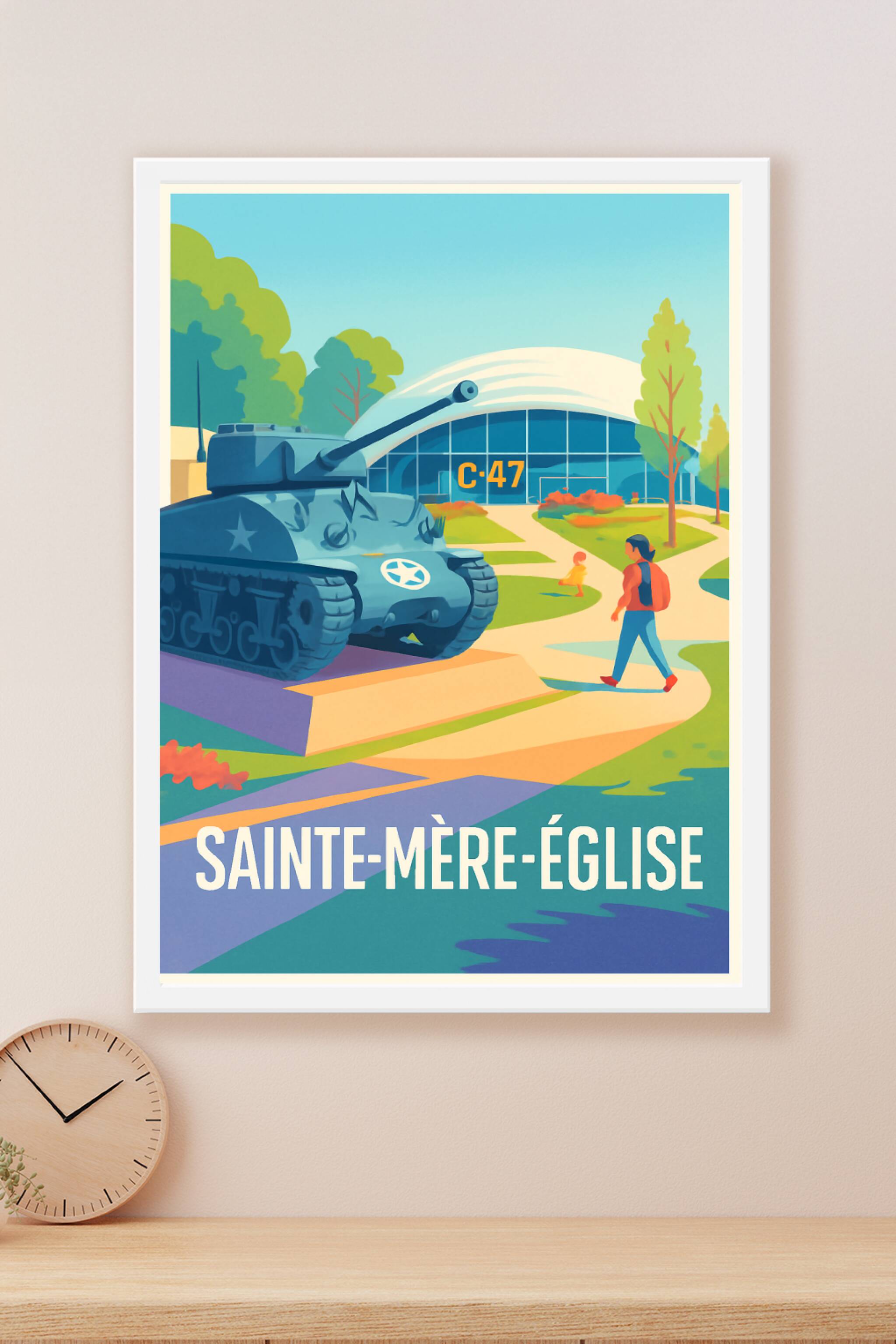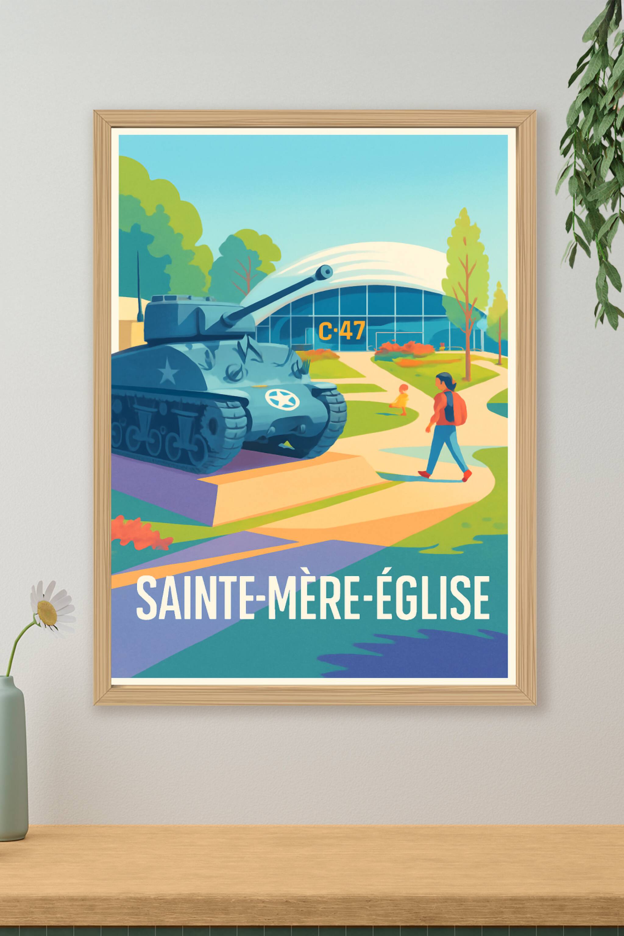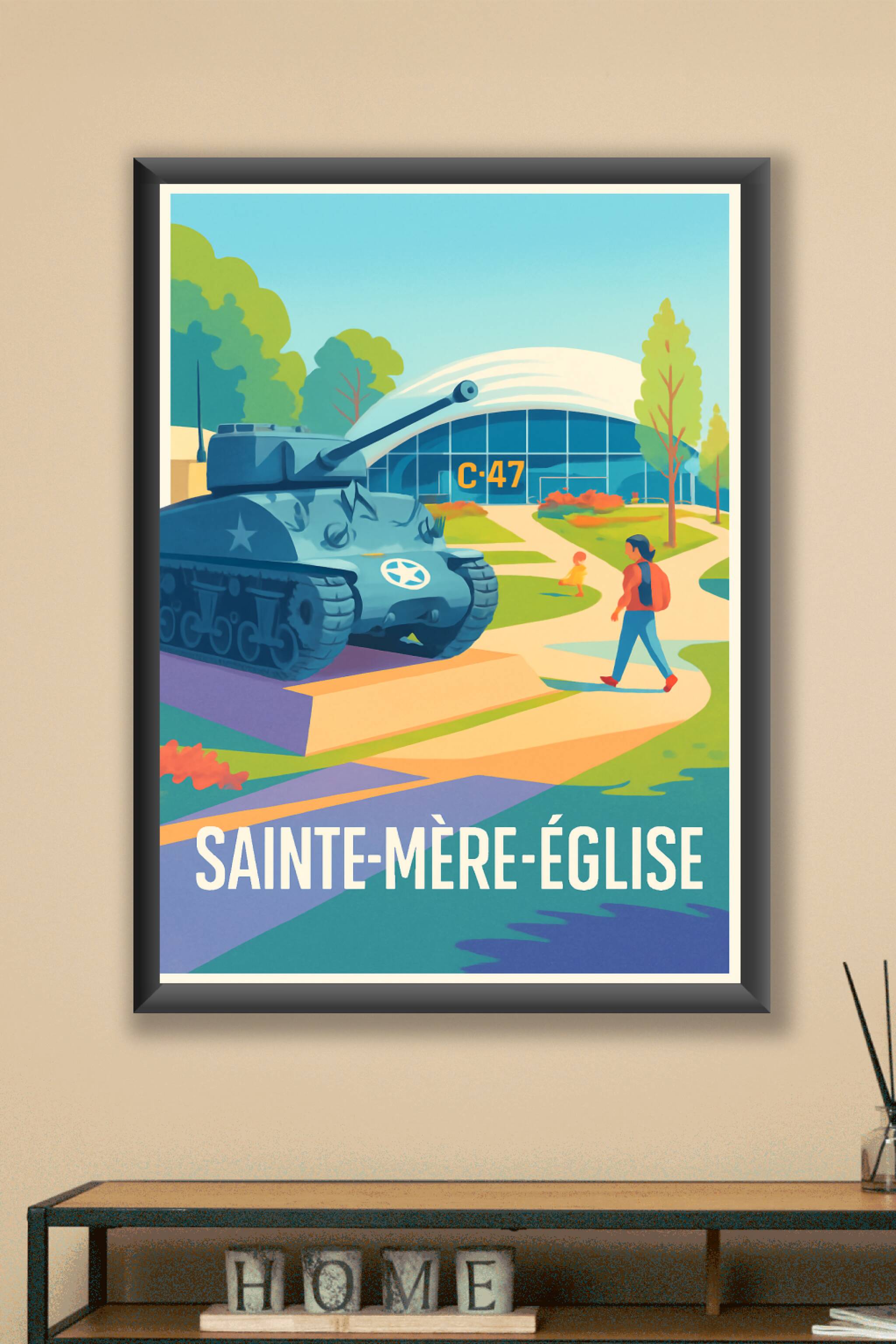 Revivez un moment fort de l'histoire avec cette affiche illustrée qui met en lumière le célèbre musée Airborne de Sainte-Mère-Église et son tank em...