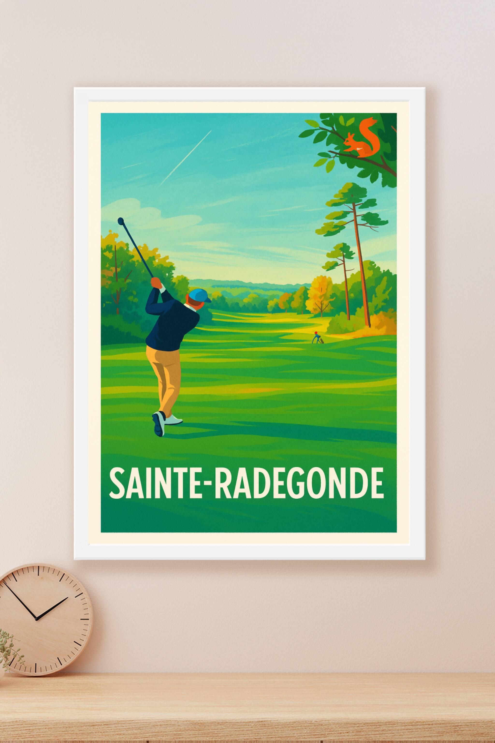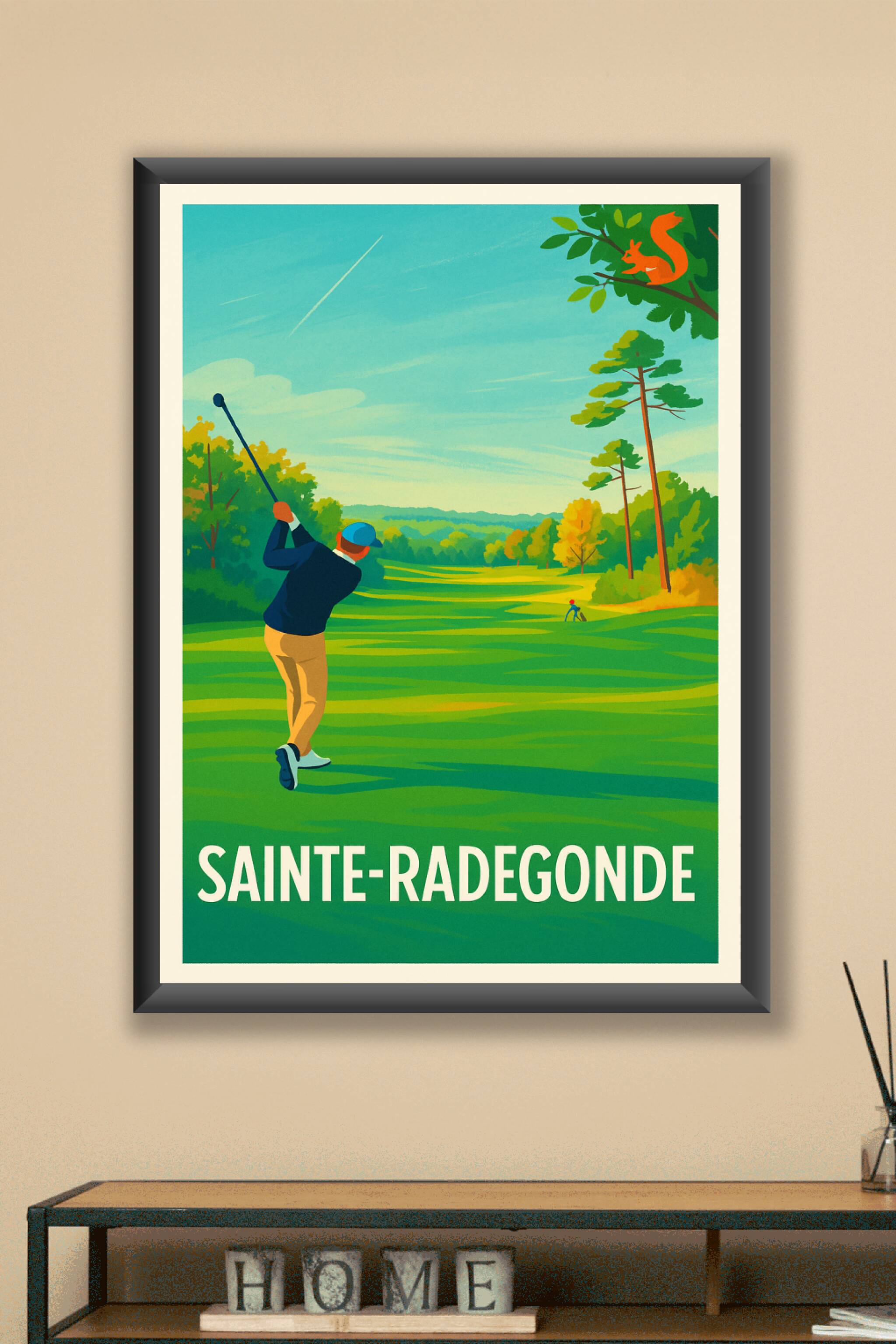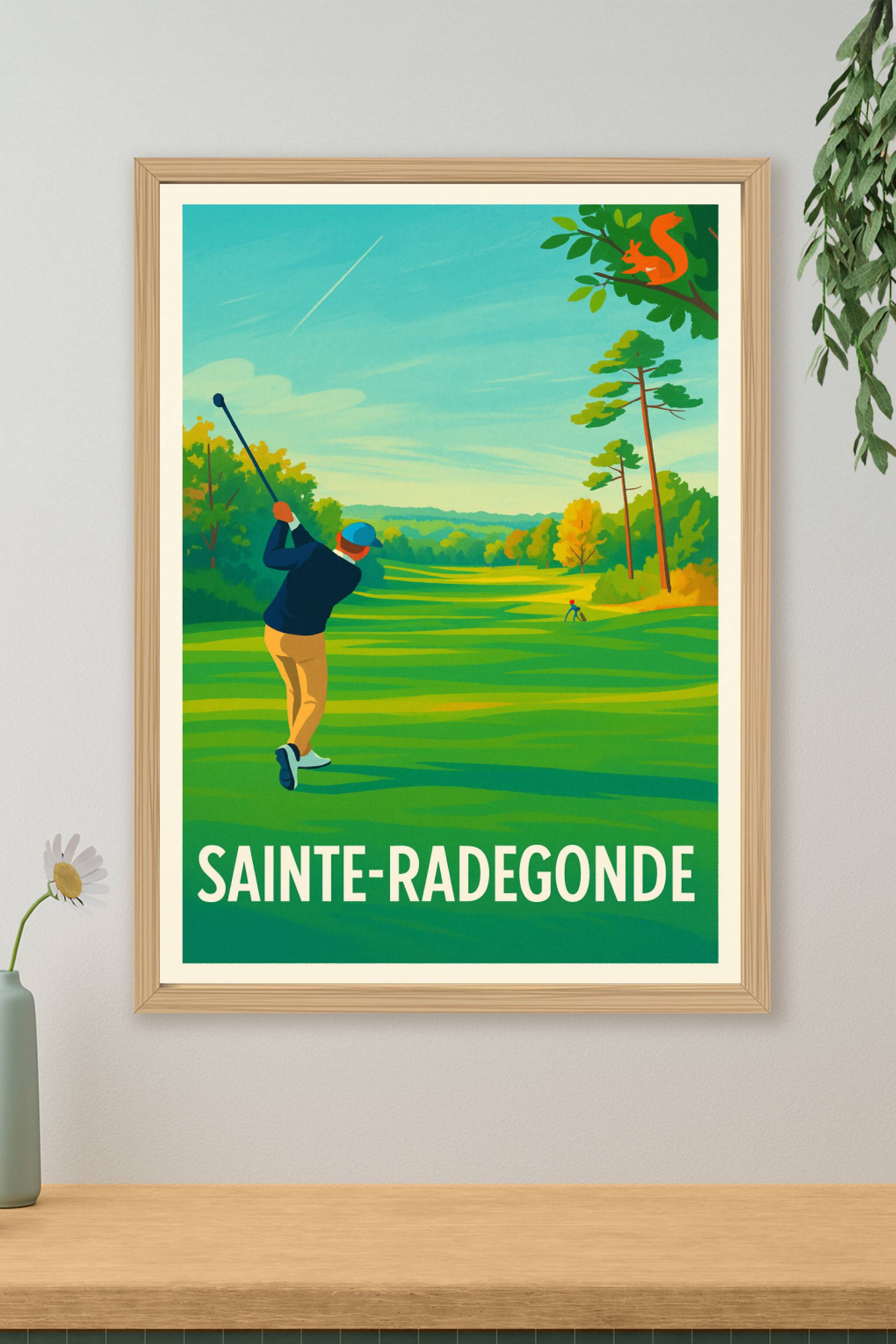 Découvrez l'élégance et la sérénité de Sainte-Radegonde à travers cette affiche qui illustre un joueur de golf en pleine partie dans un paysage ver...