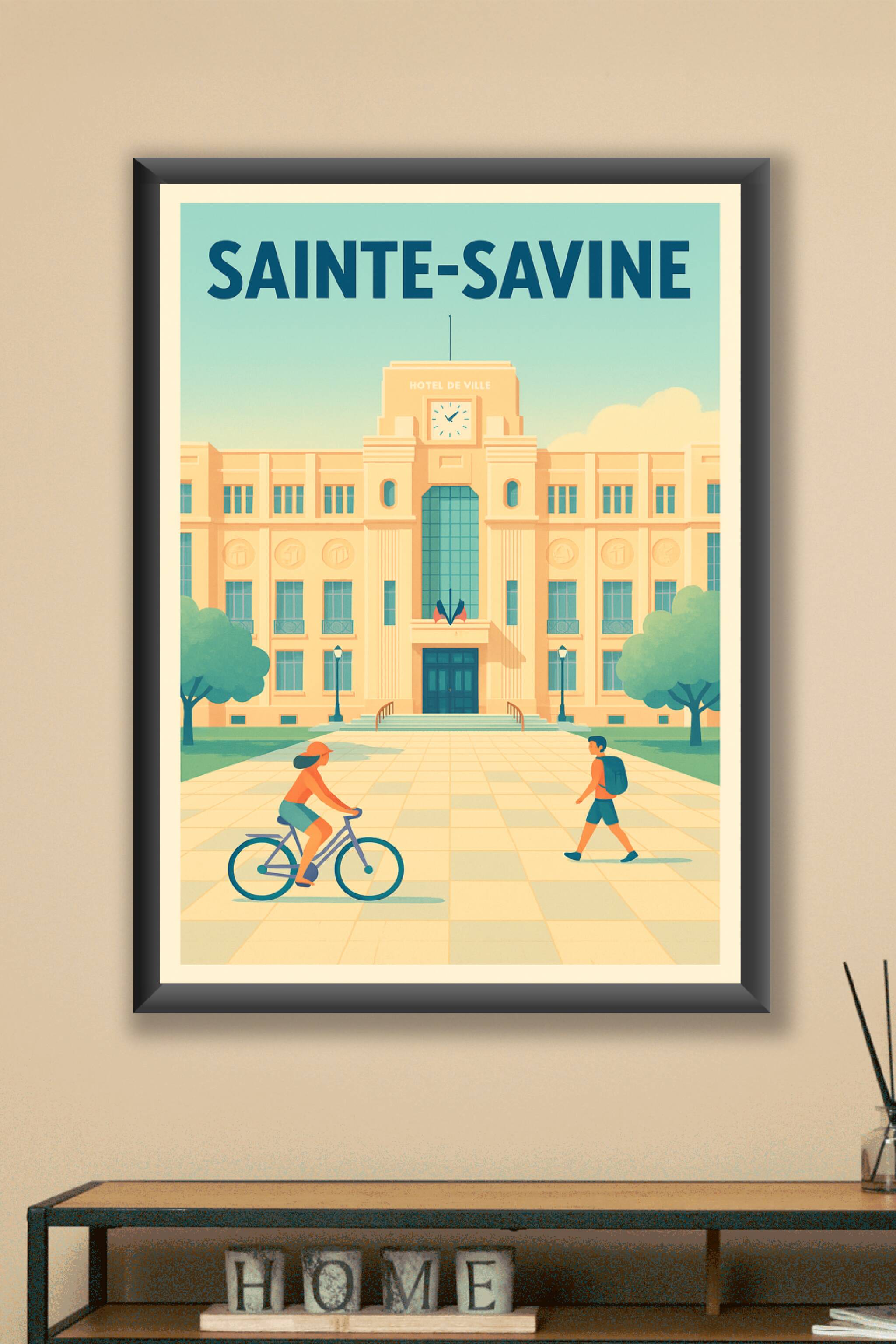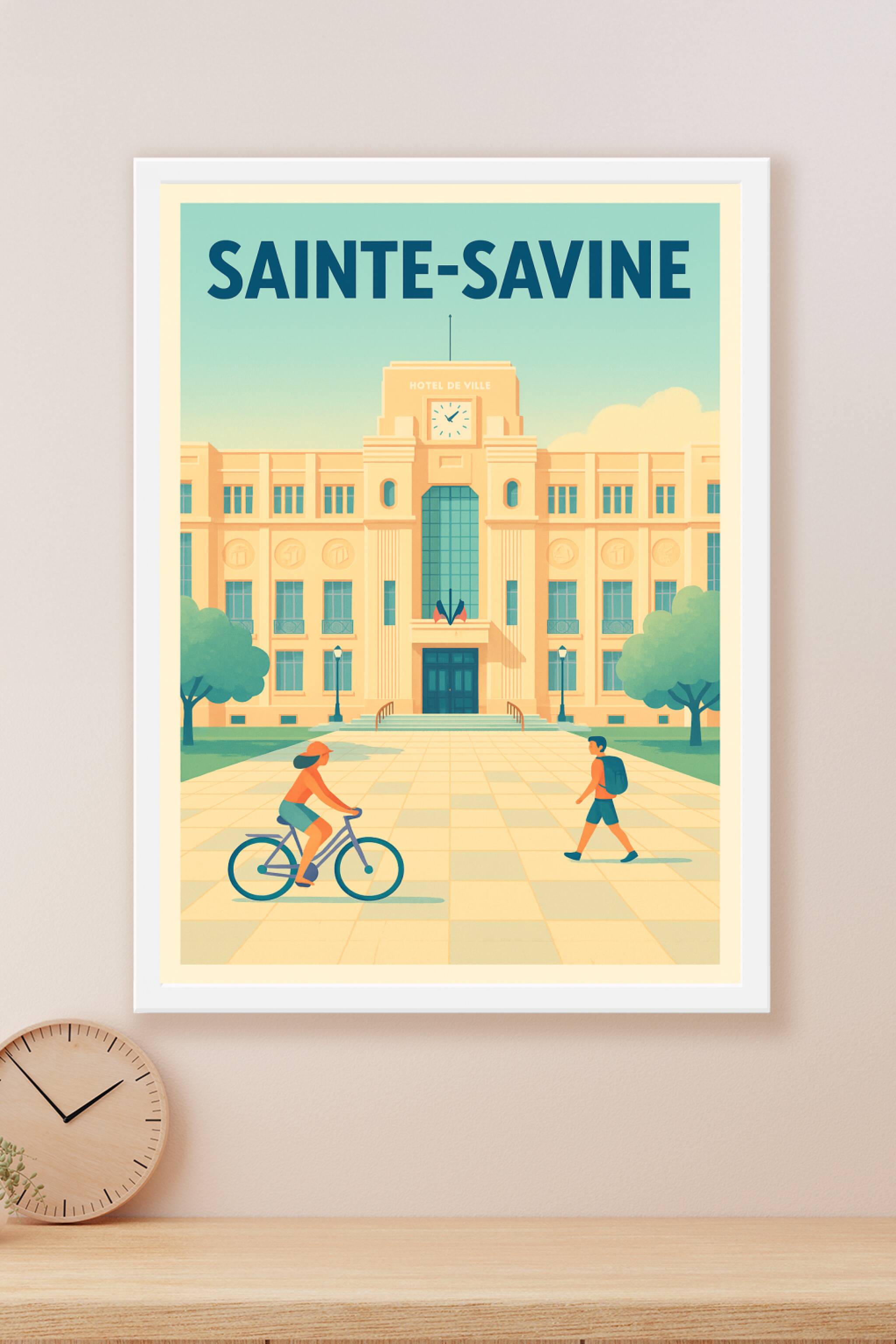 Découvrez l'élégance architecturale de Sainte-Savine avec cette affiche illustrée mettant en avant l'Hôtel de Ville dans une ambiance douce et lumi...