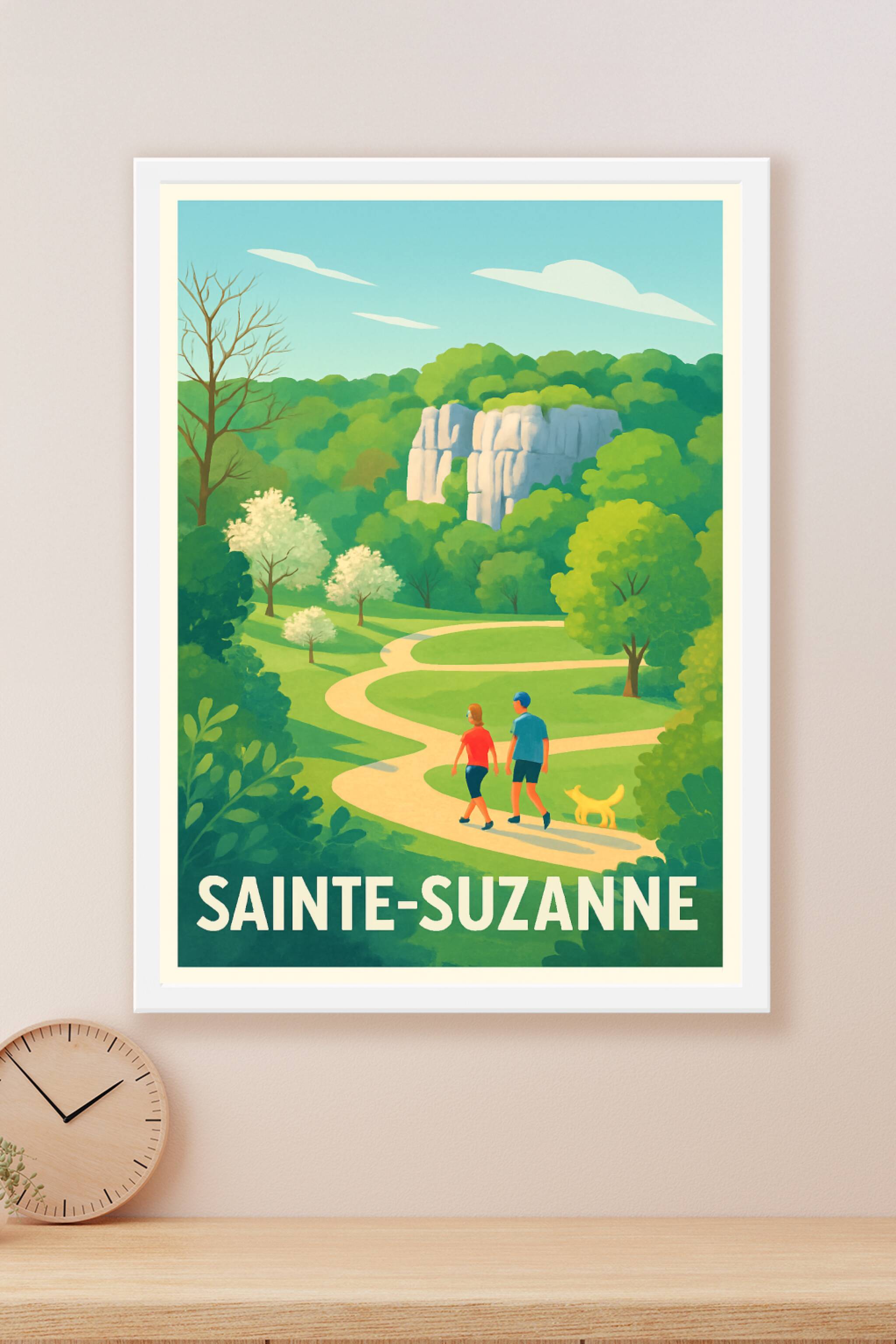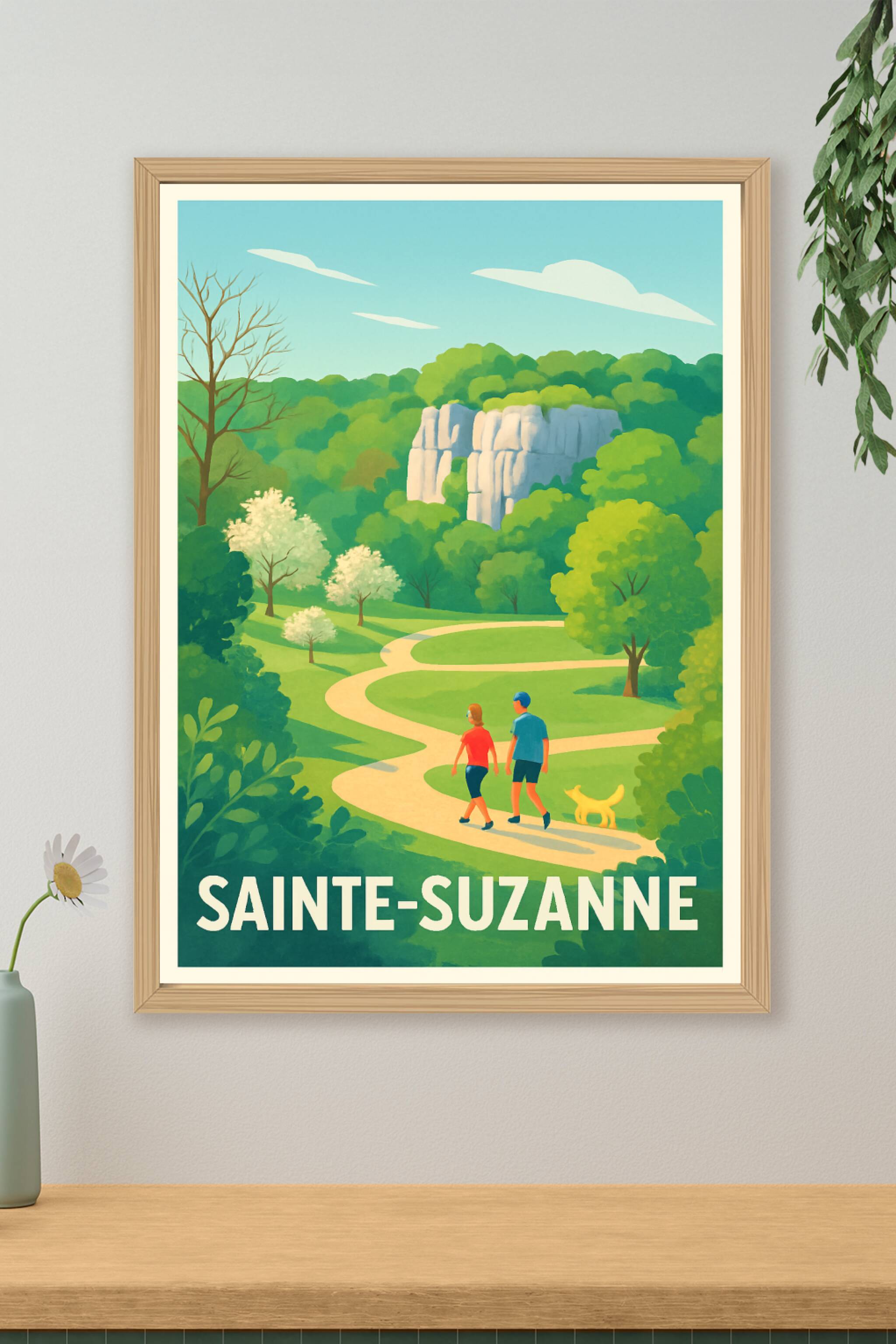 Découvrez la sérénité des paysages de Sainte-Suzanne avec cette magnifique affiche illustrée mettant en scène une promenade paisible au milieu d'un...