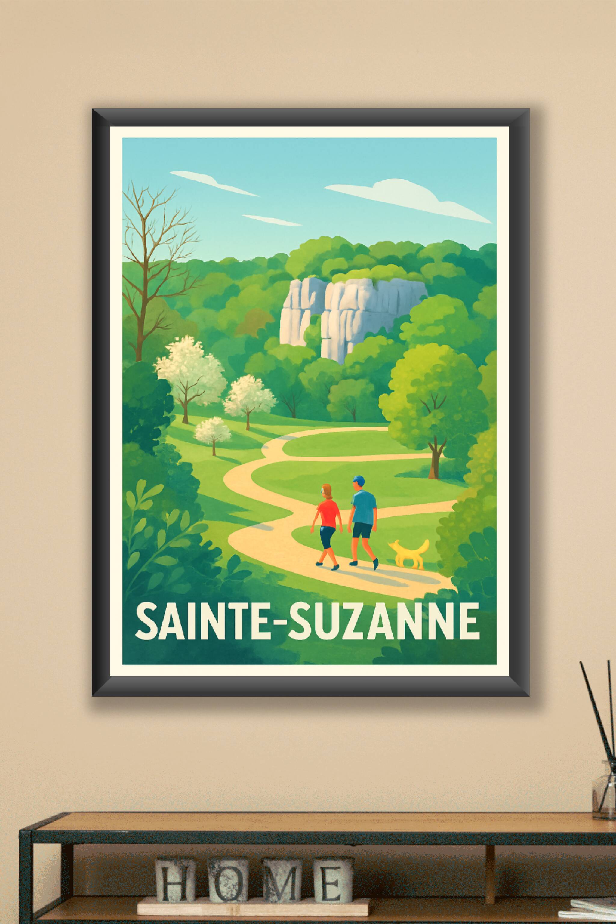 Découvrez la sérénité des paysages de Sainte-Suzanne avec cette magnifique affiche illustrée mettant en scène une promenade paisible au milieu d'une nature luxuriante et d'une formation rocheuse emblématique. Ce poster au style vintage apporte une touche de fraîcheur et d'évasion à votre intérieur. Imprimé en tirage "Fine Art" sur papier 305g coton, il garantit une qualité d'impression exceptionnelle et une longévité remarquable. Disponible en formats A1 à A4, avec ou sans cadre, cette affiche est le choix idéal pour enrichir votre décoration ou offrir un souvenir raffiné aux amoureux des paysages authentiques. Profitez d'un savoir-faire 100% français pour sublimer votre habitat avec cette création unique.