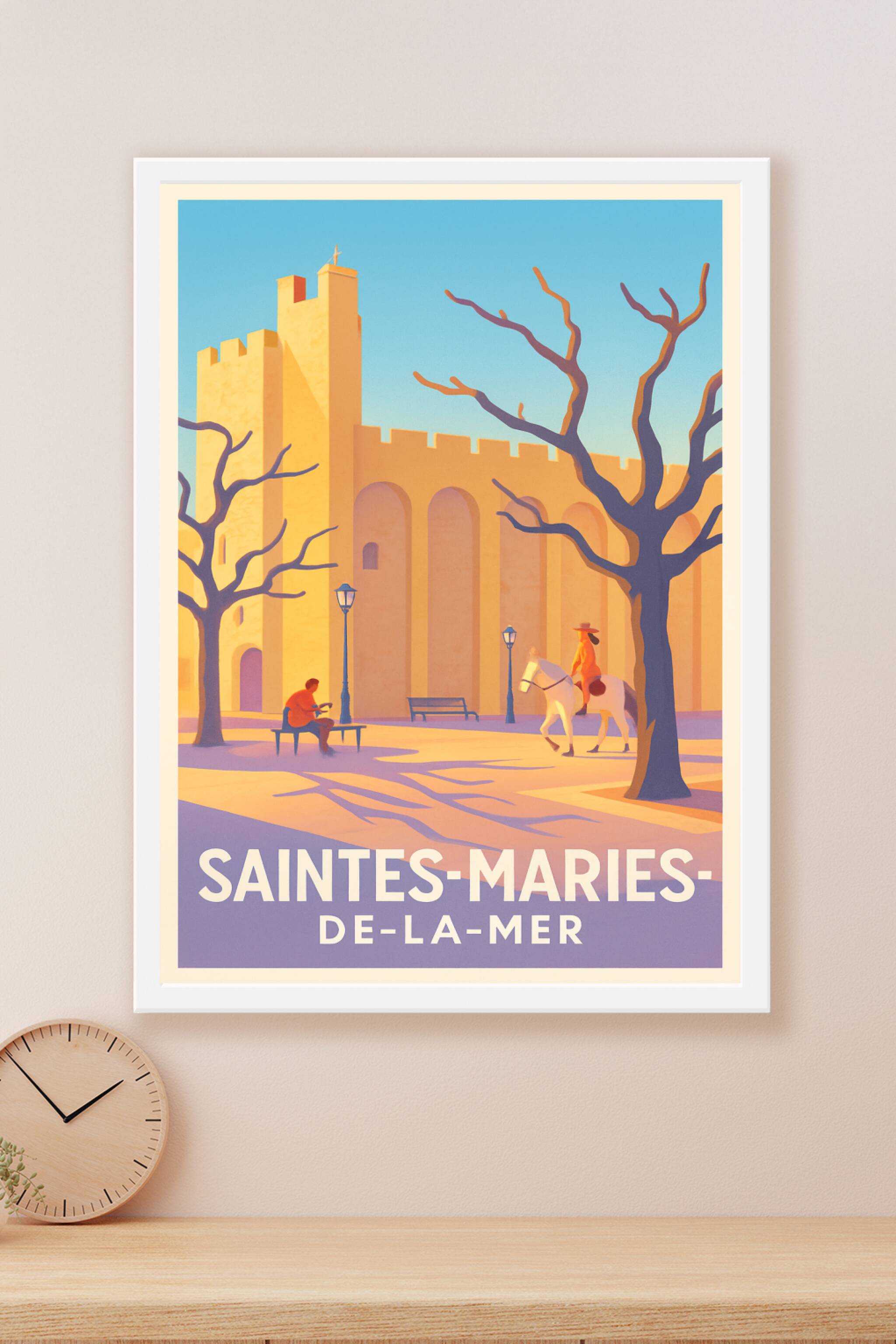 Découvrez la sérénité et la chaleur des paysages de Saintes-Maries-de-la-Mer avec cette affiche illustrée aux teintes douces et ensoleillées. Cette...