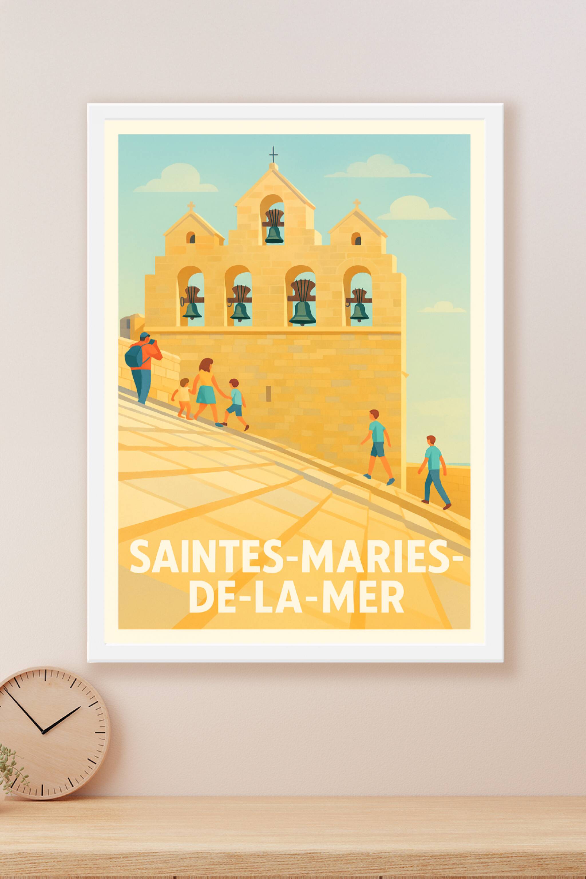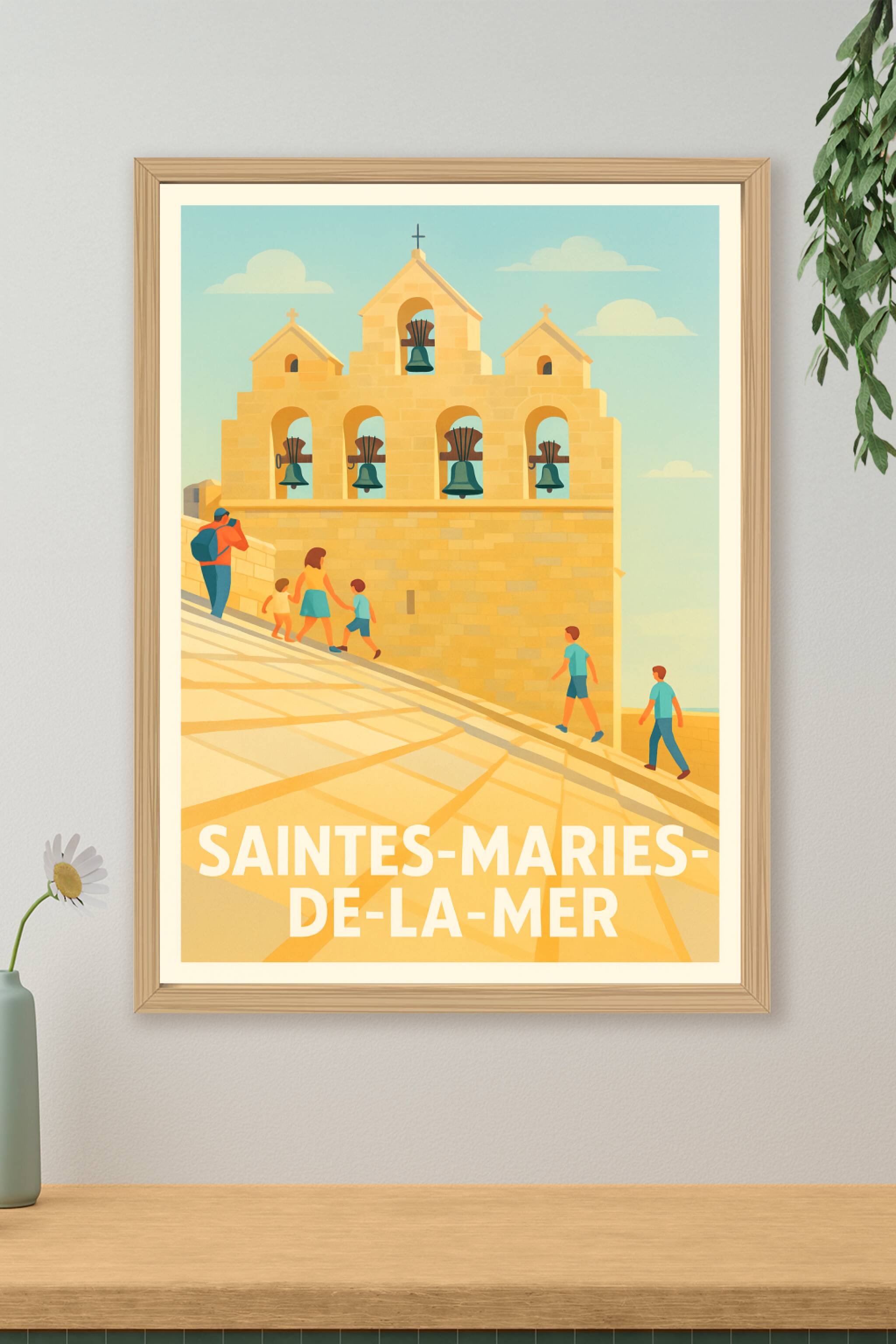 Découvrez la douceur provençale et l'architecture emblématique de Saintes-Maries-de-la-Mer avec cette affiche au design épuré et coloré. Le poster ...