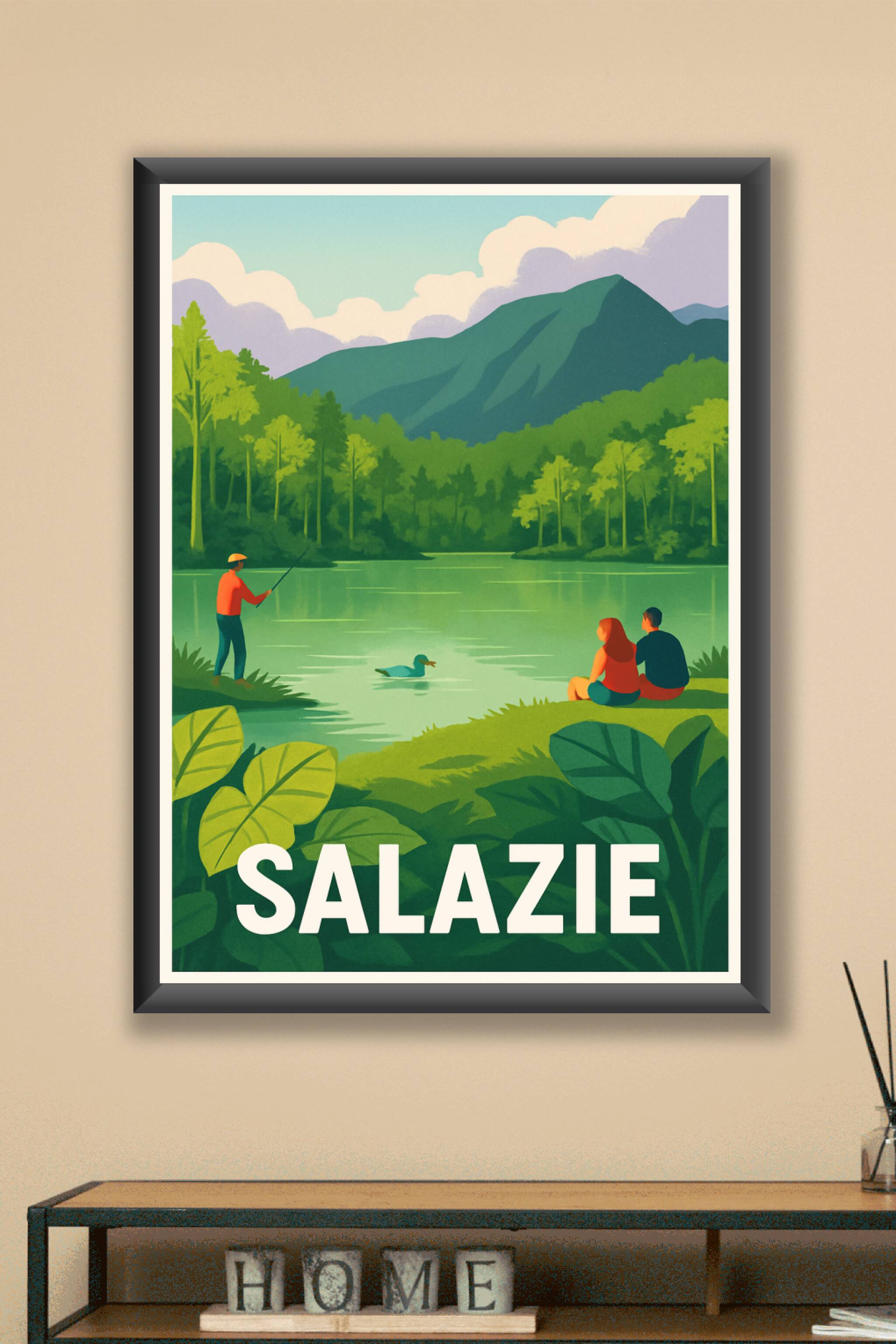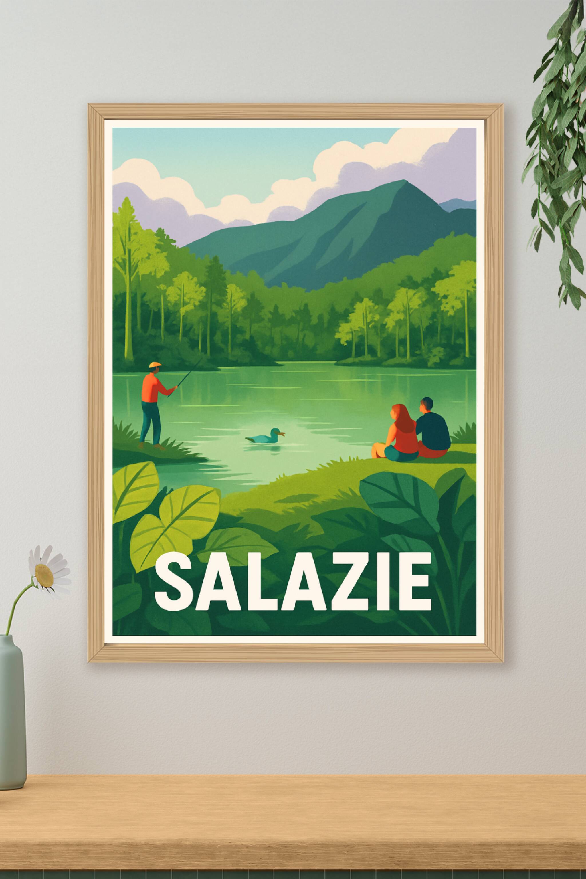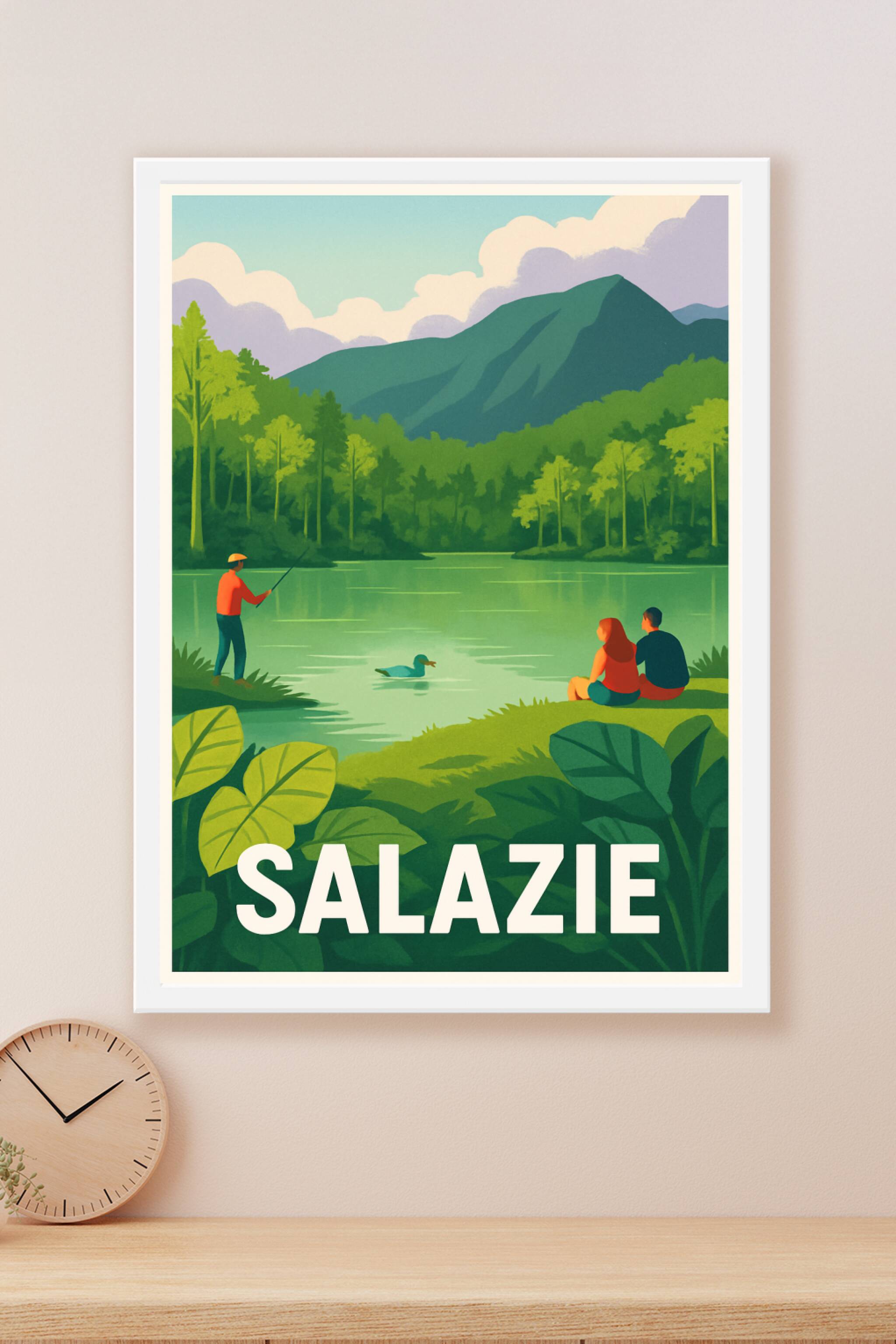 Découvrez la sérénité et la beauté luxuriante de Salazie avec cette affiche qui capture un moment paisible au bord de l'eau, entouré de montagnes e...