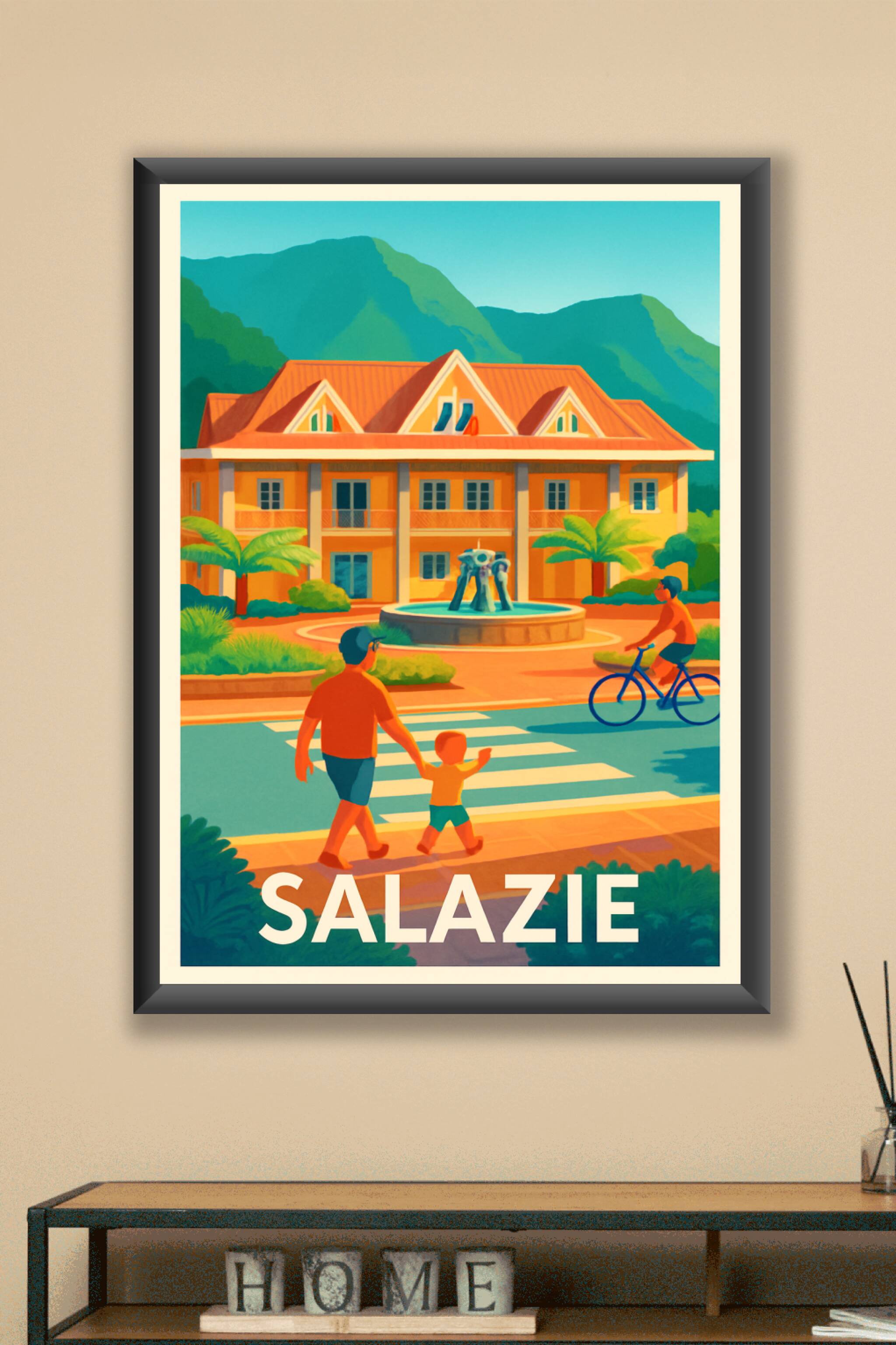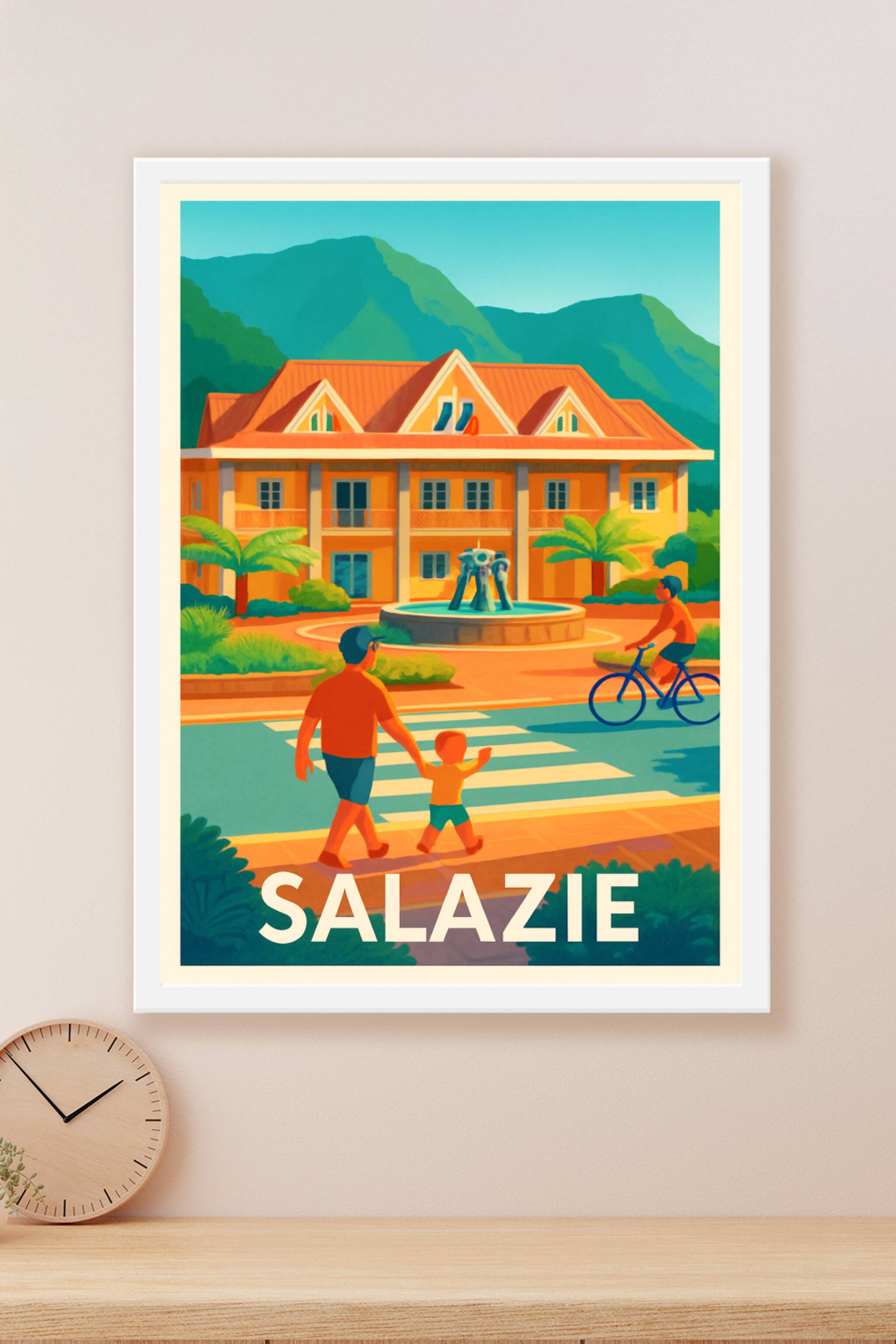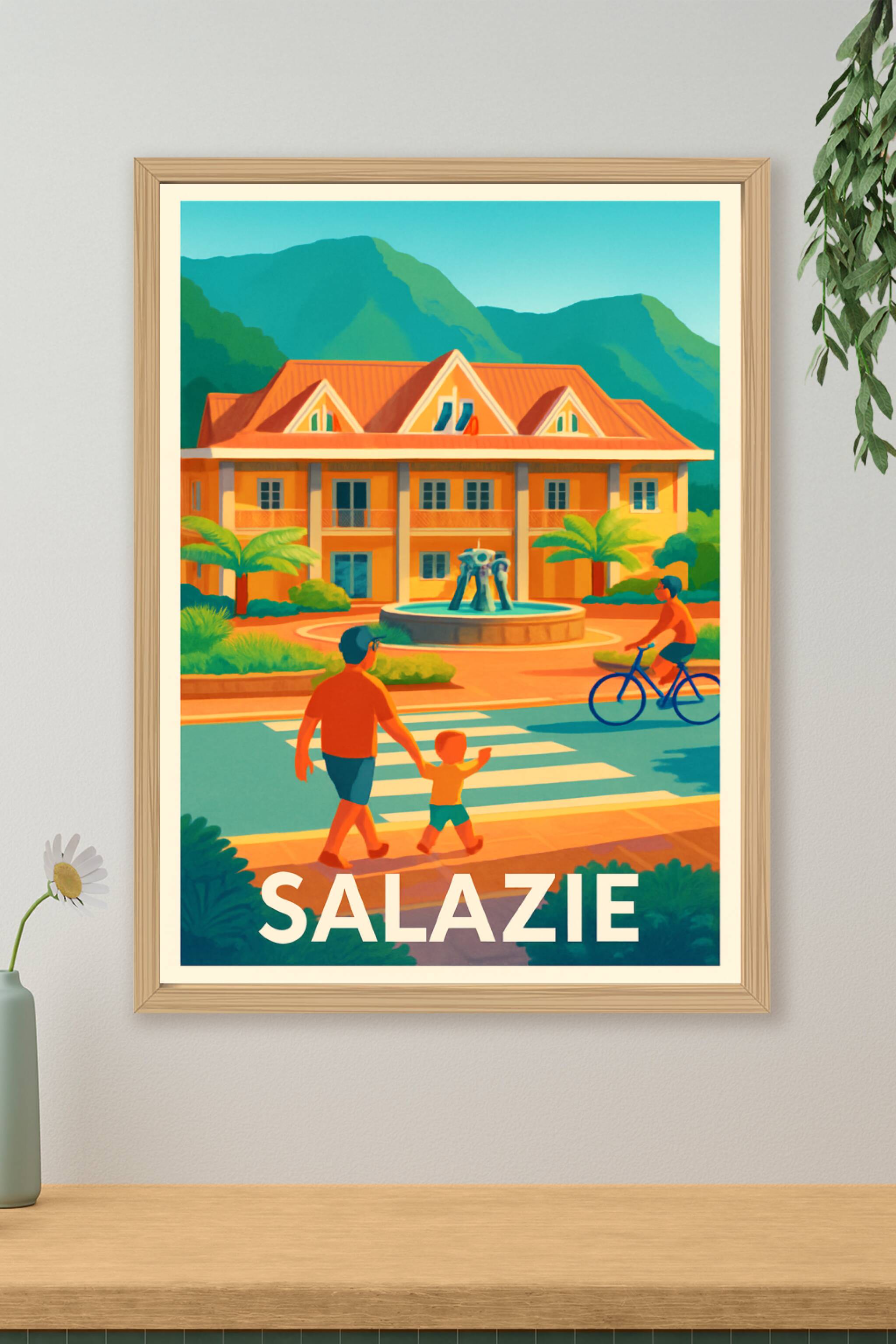Découvrez Salazie à travers cette affiche illustrée aux couleurs vives et accueillantes, qui capture l'ambiance paisible et verdoyante de ce célèbr...