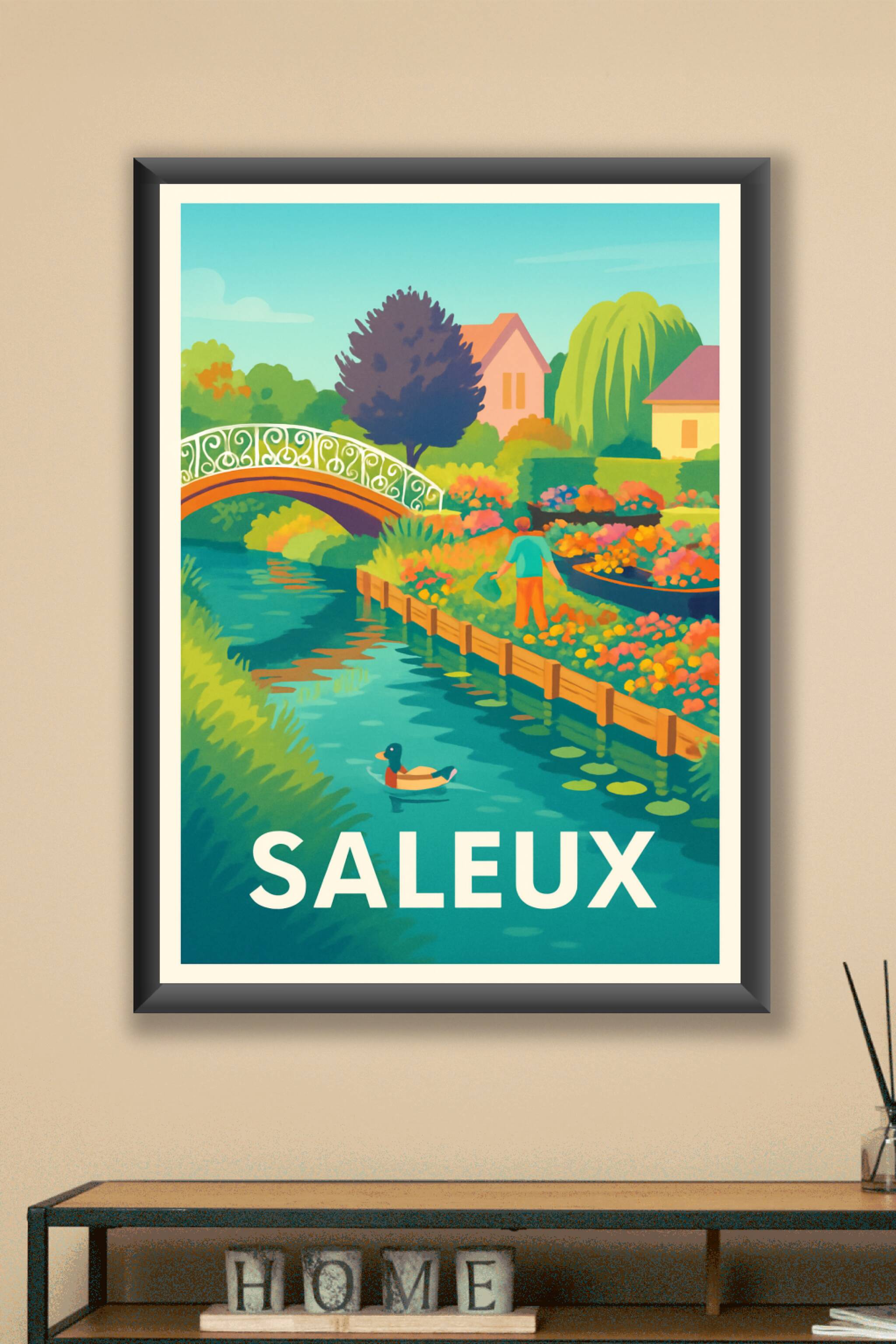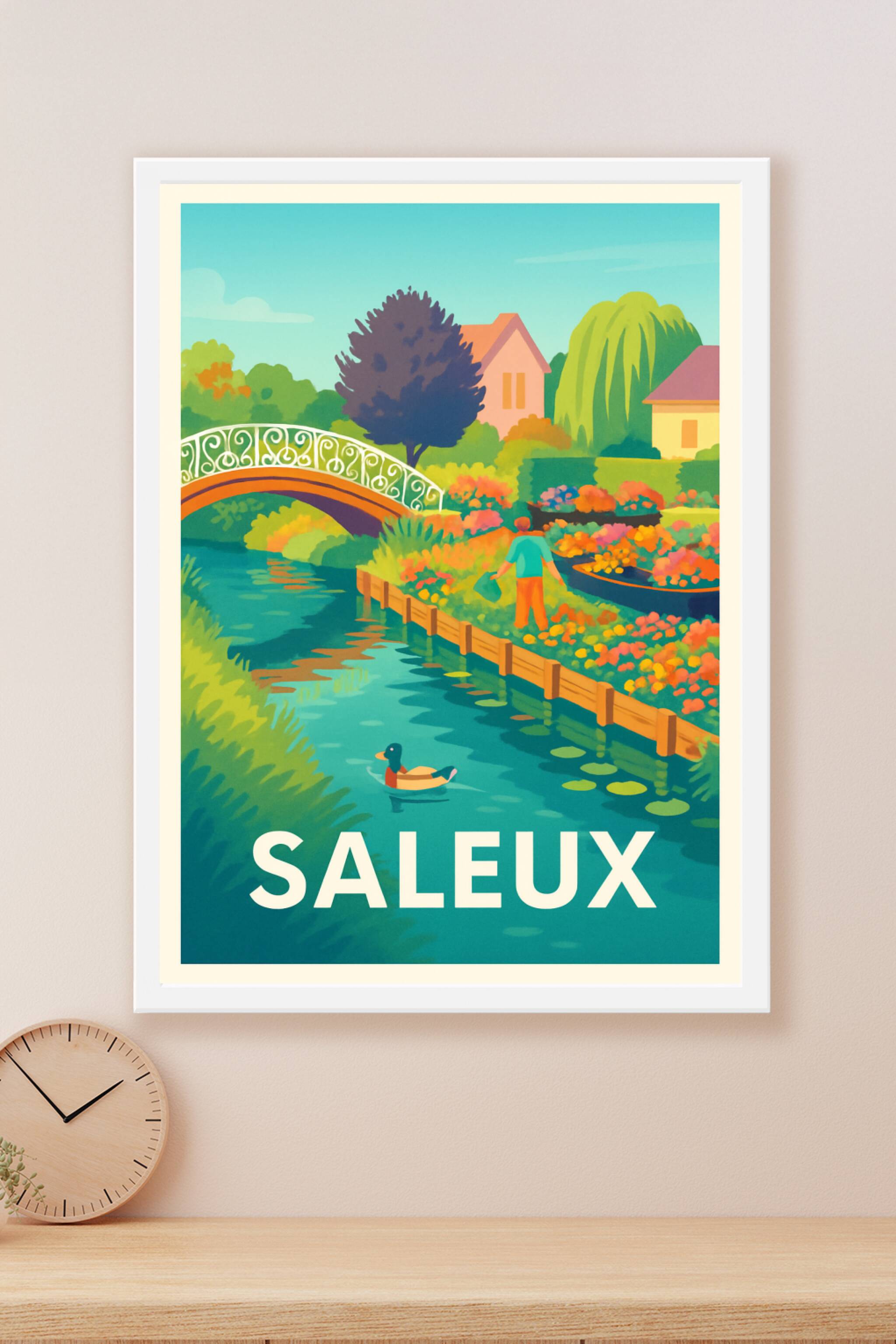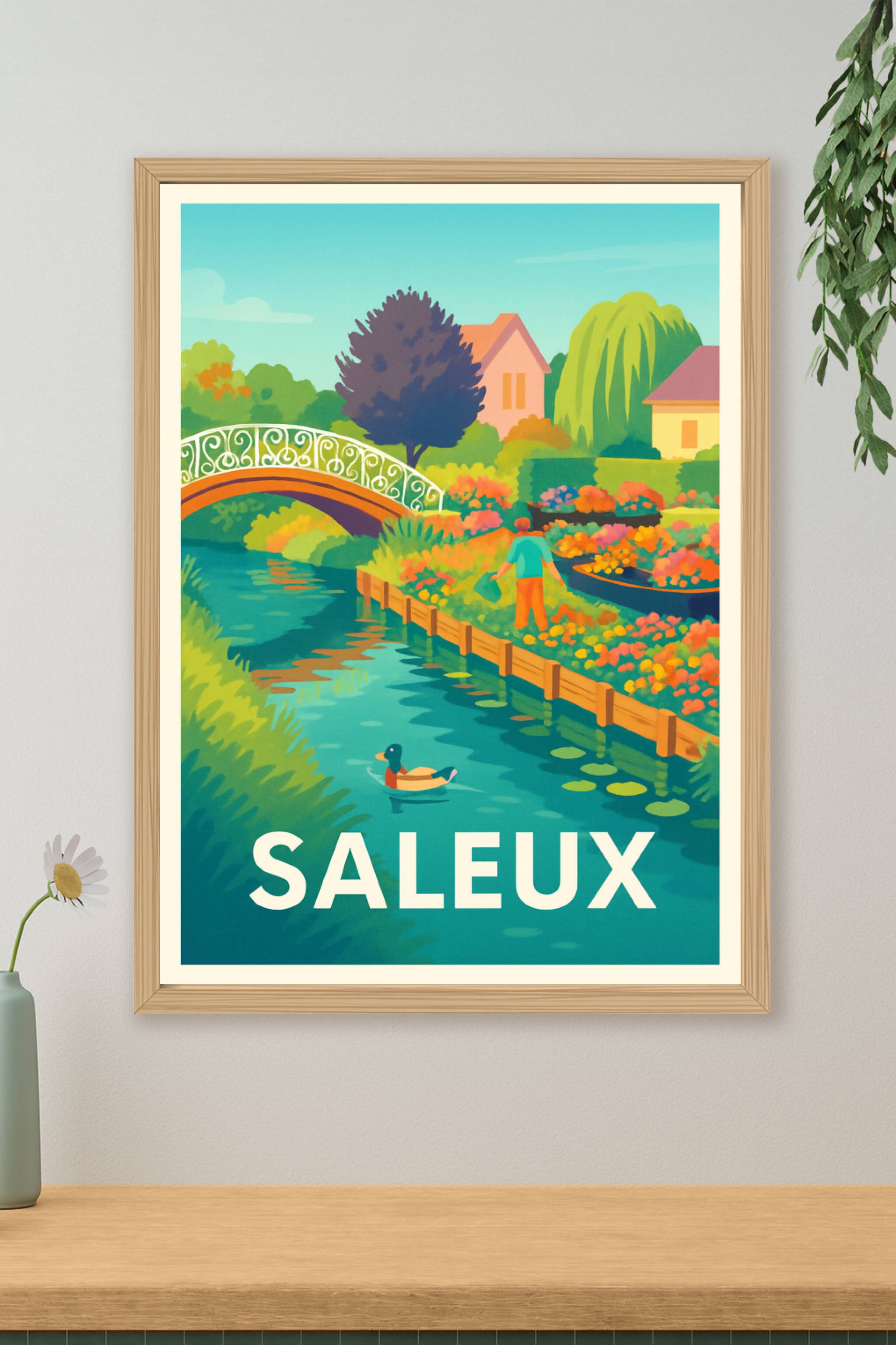 Découvrez la douceur de vivre de Saleux avec cette magnifique affiche illustrant un paysage paisible au bord de l'eau, où un jardin fleuri et un po...