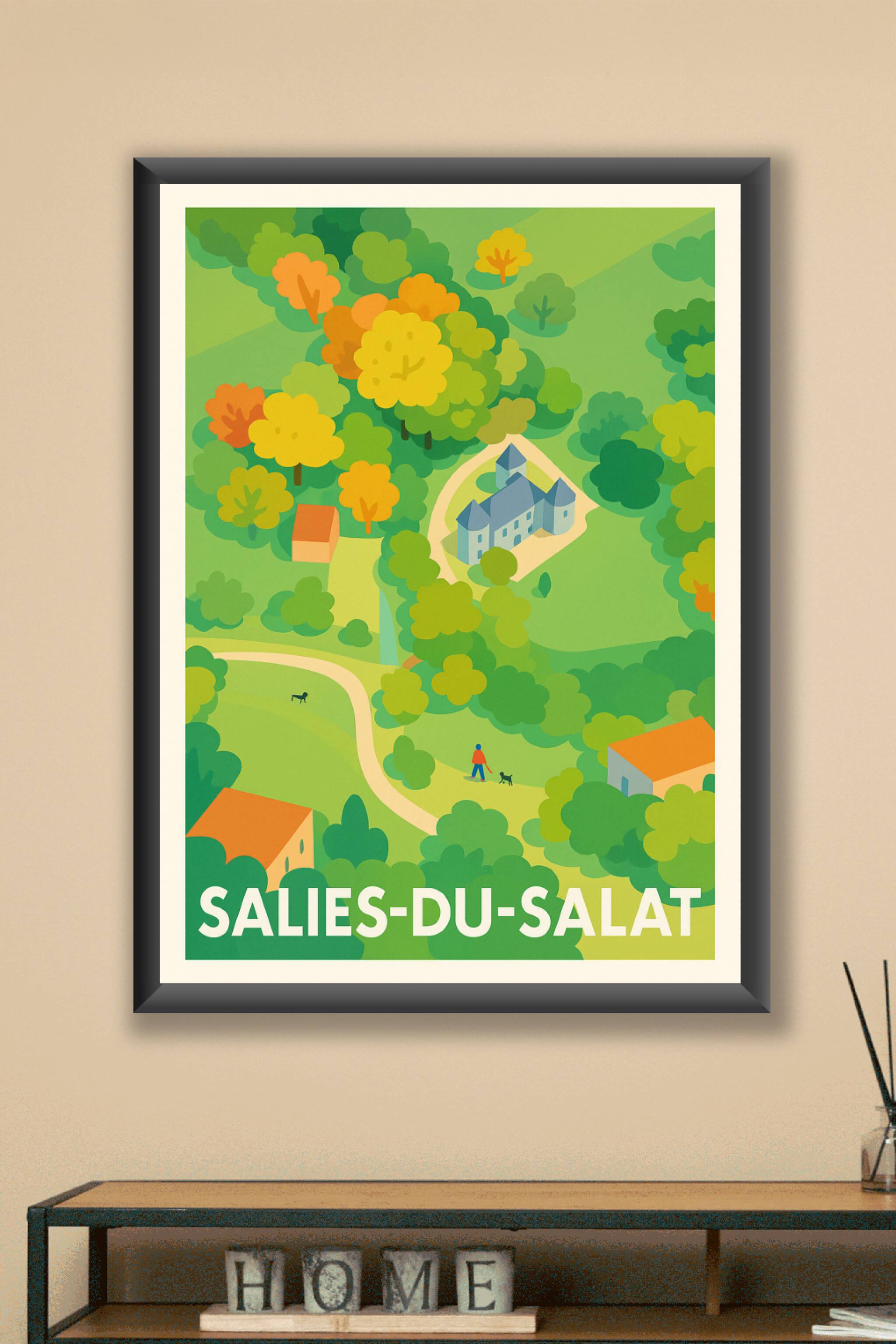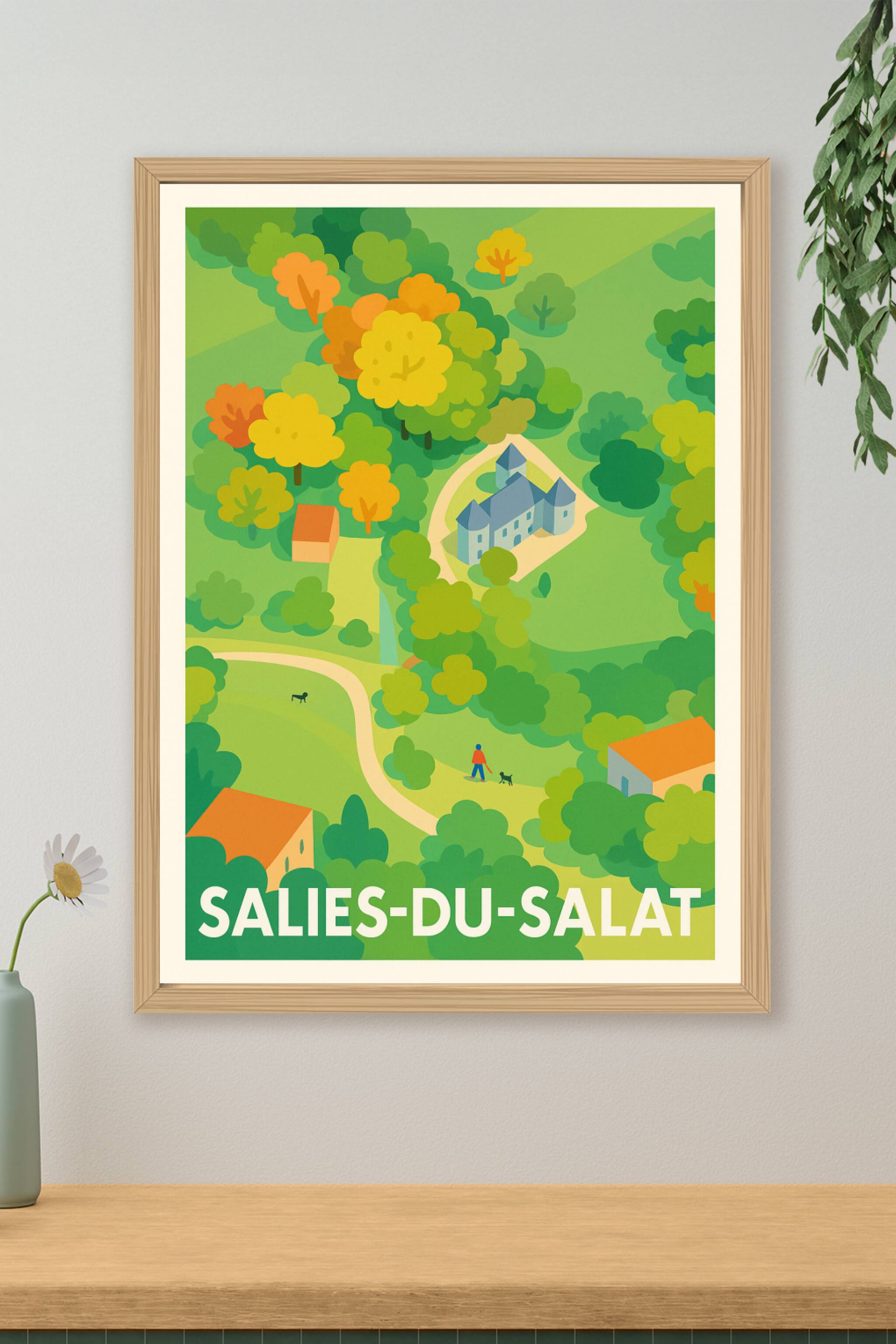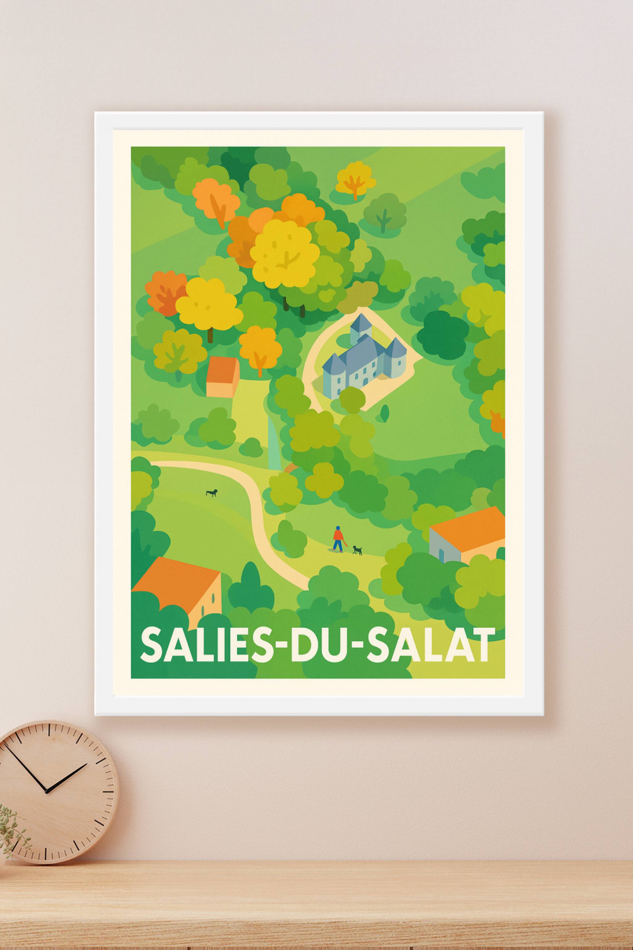 Découvrez la douceur de vivre à Salies-du-Salat avec cette affiche au graphisme épuré et coloré, qui met en lumière la beauté naturelle et le charm...