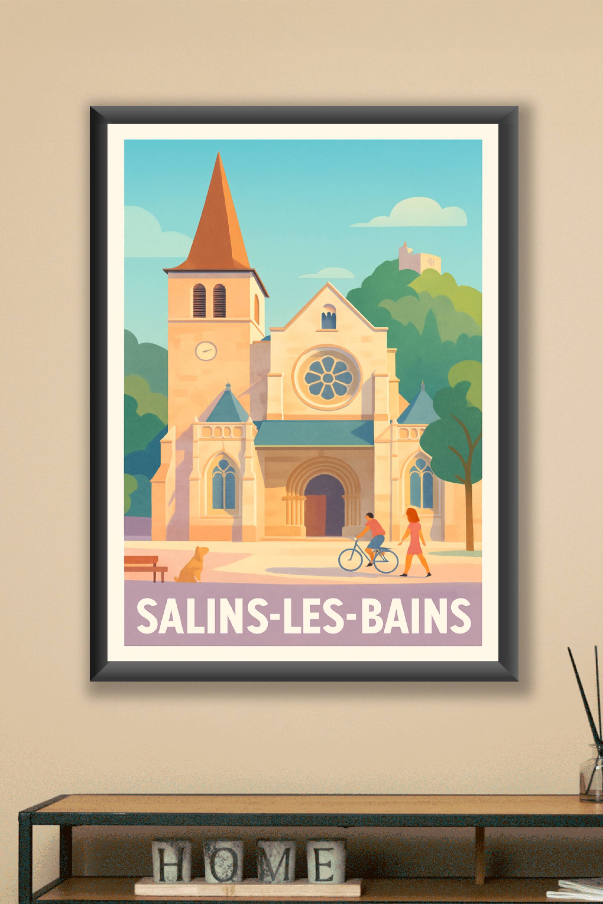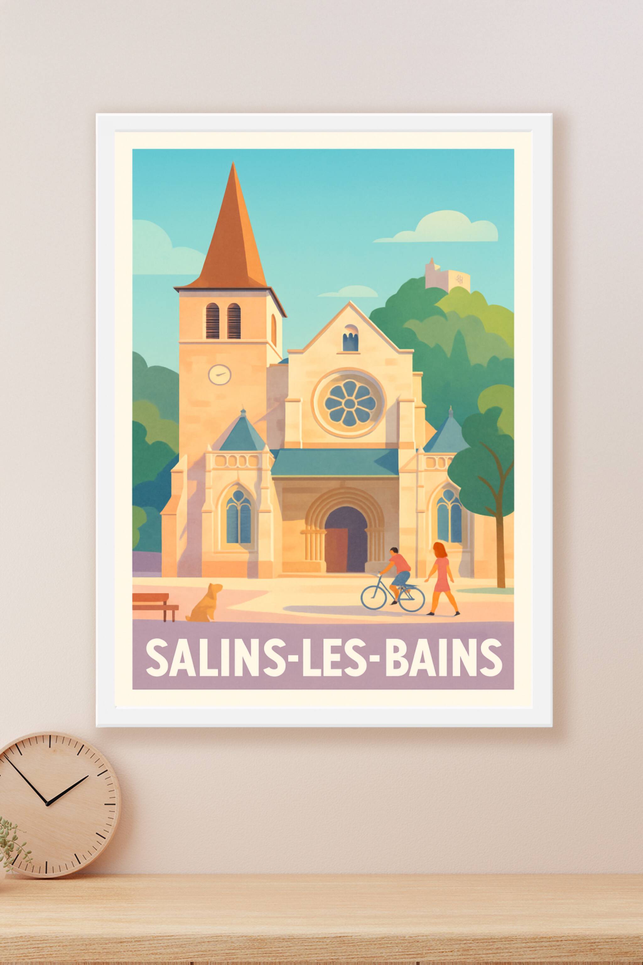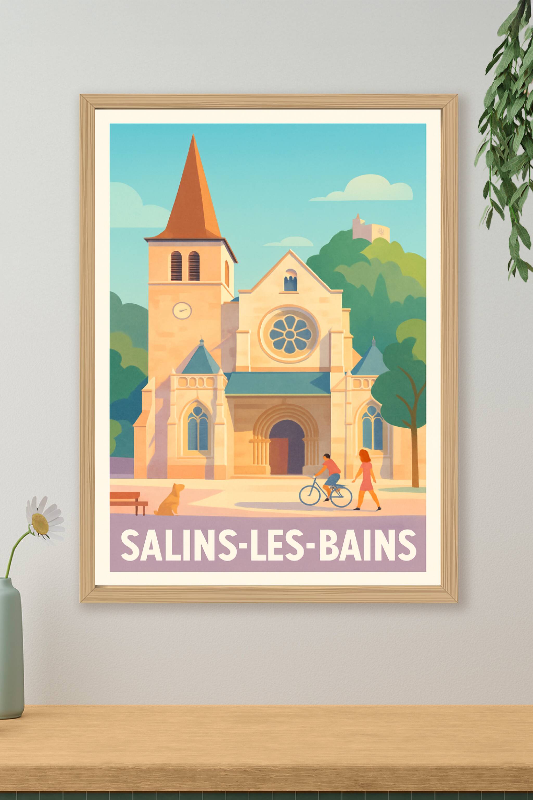 Découvrez ce poster illustré qui capture l'âme paisible et le patrimoine architectural de Salins-les-Bains, célèbre pour ses thermes et son histoir...