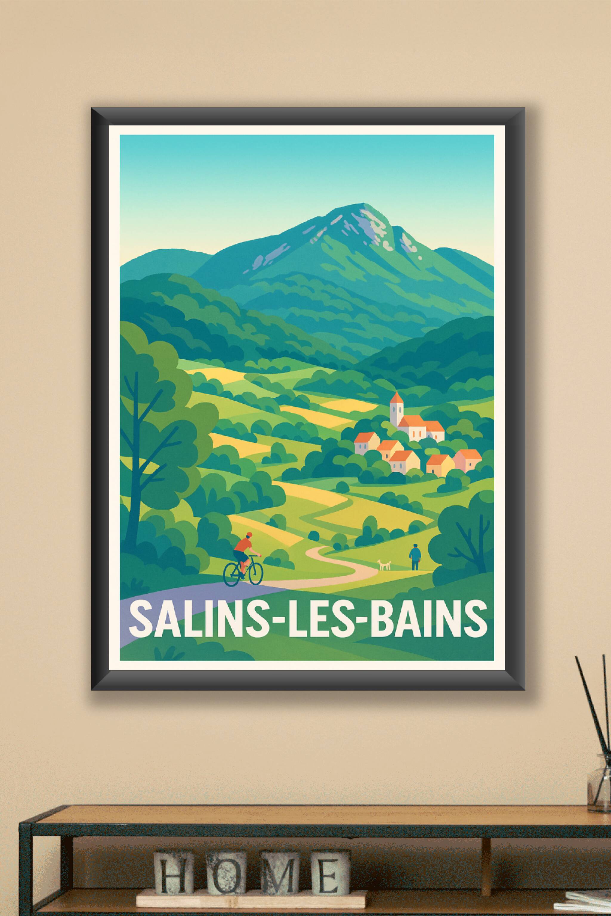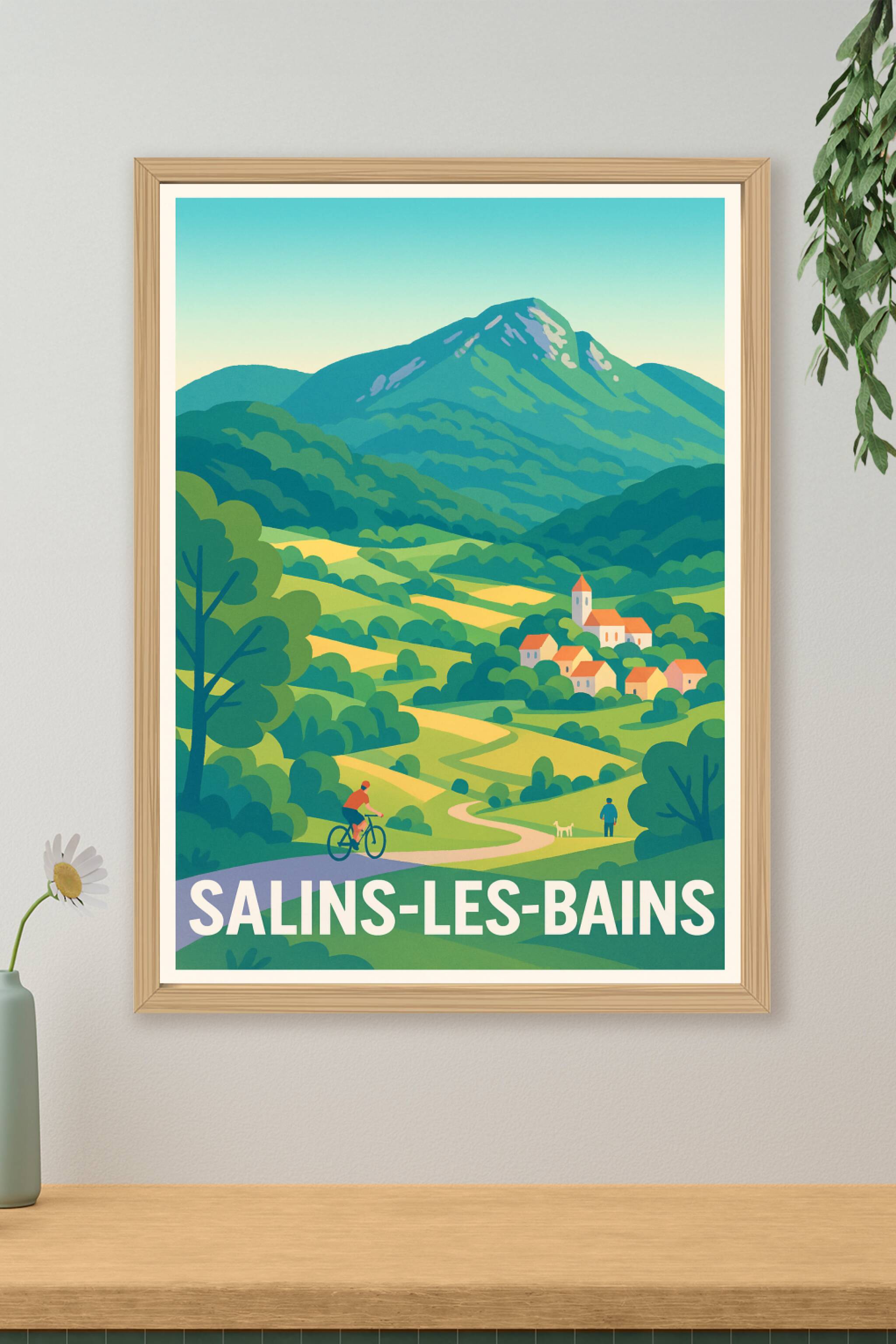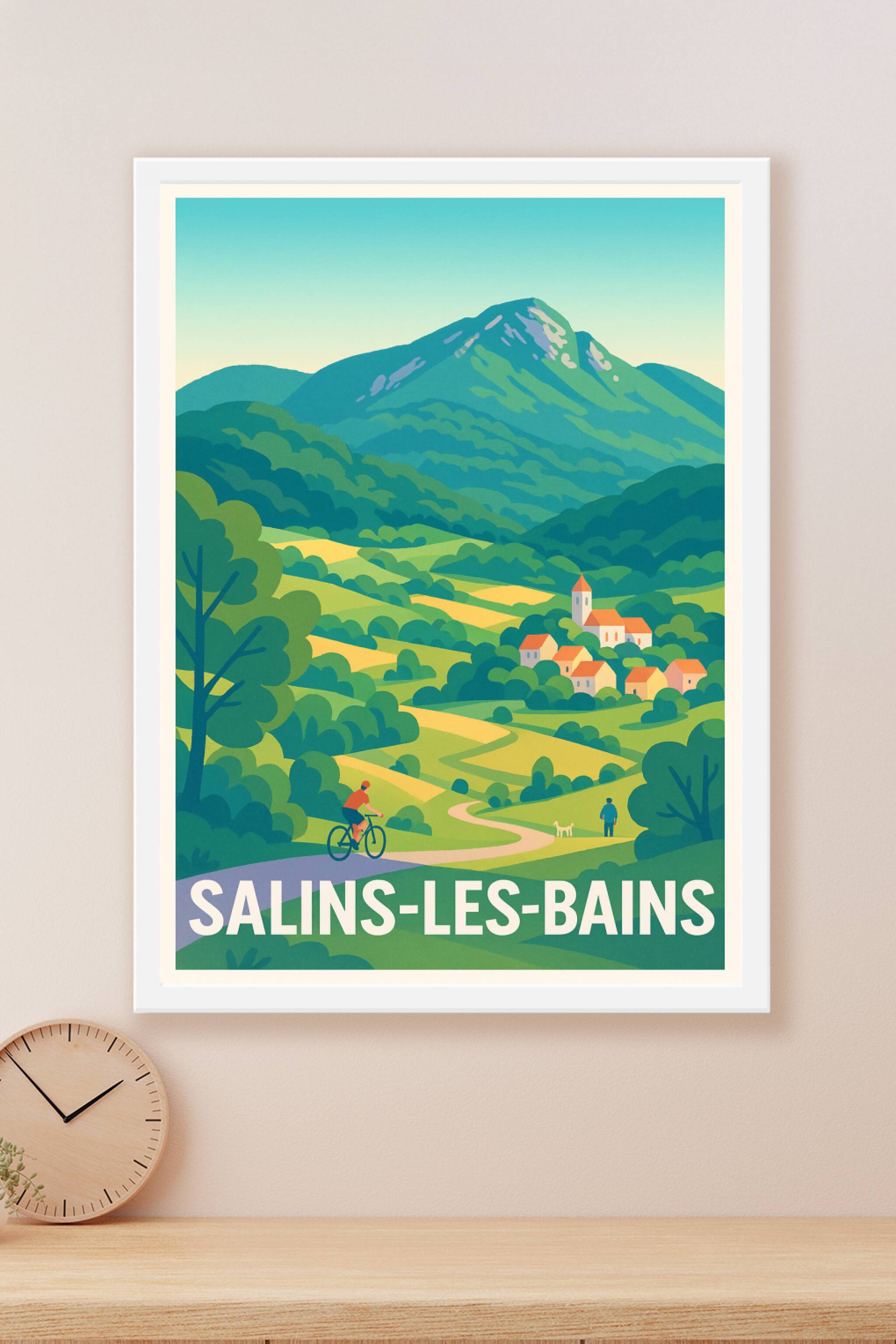 Découvrez la beauté paisible de Salins-les-Bains avec cette affiche au style rétro, illustrant les chemins verdoyants et les paysages vallonnés du Jura. Ce poster met en avant la quiétude de la campagne, idéal pour les amoureux de la nature et les passionnés de randonnées ou de balades à vélo. Imprimée en tirage "Fine Art" sur un papier 305g coton d'exception, cette affiche offre une qualité d'impression haute définition, durable et respectueuse de l'environnement. Disponible en formats A1 à A4, avec ou sans cadre, ce poster apportera une touche authentique et apaisante à votre décoration intérieure. Faites entrer un souffle de nature et d'aventure dans votre maison grâce à ce tirage premium 100% fabriqué en France.