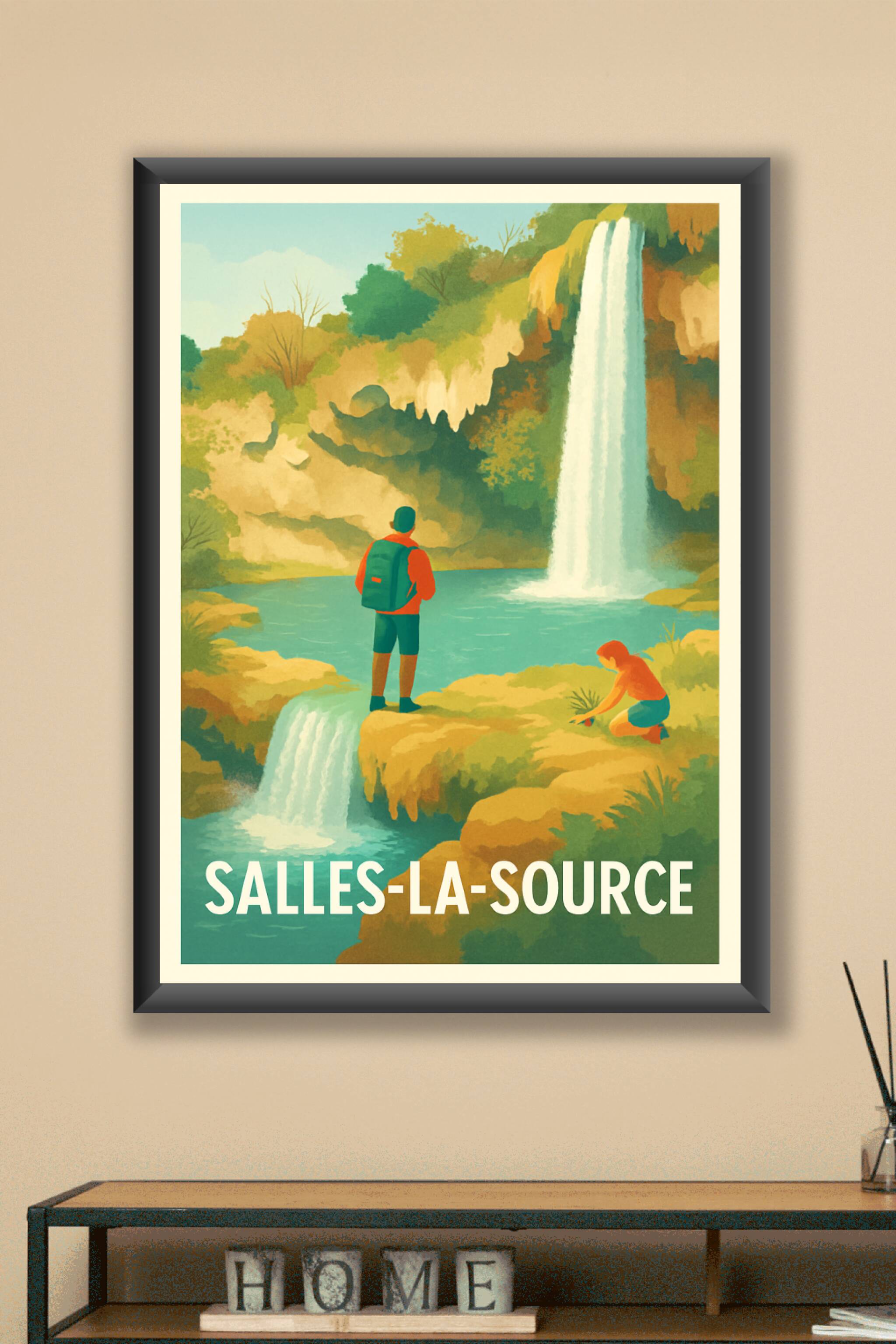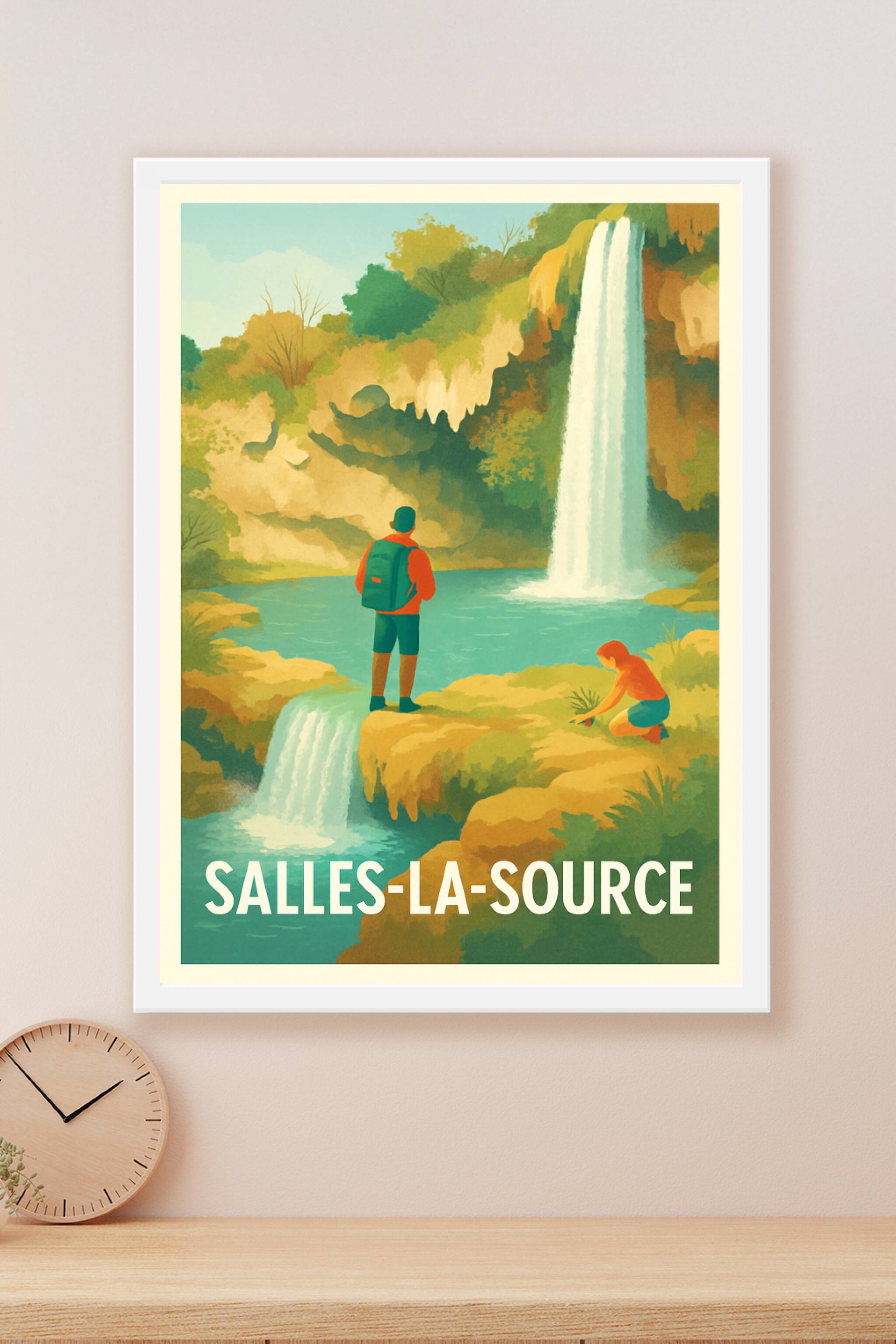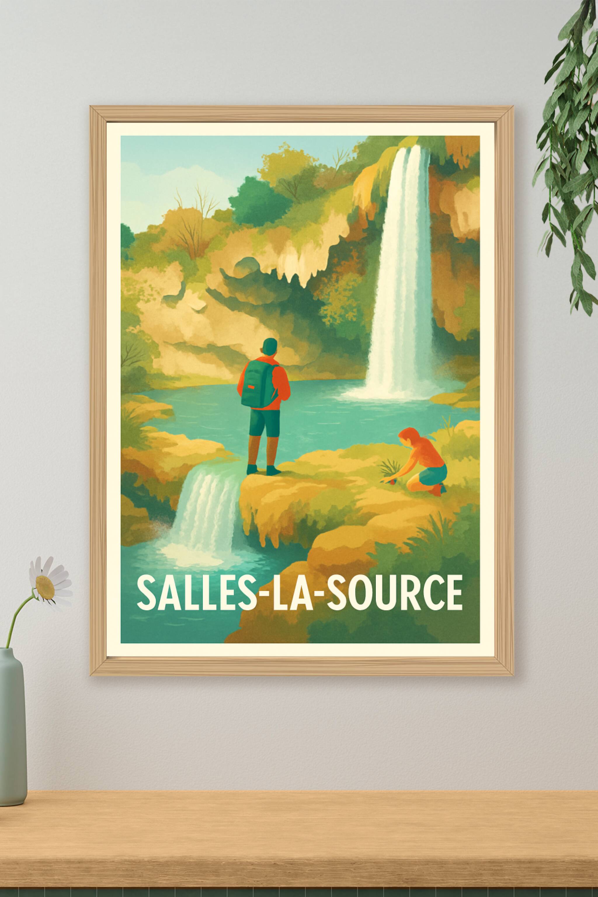 Découvrez la beauté sauvage et apaisante de Salles-la-Source à travers cette affiche illustrée où une cascade majestueuse se déverse dans un bassin...