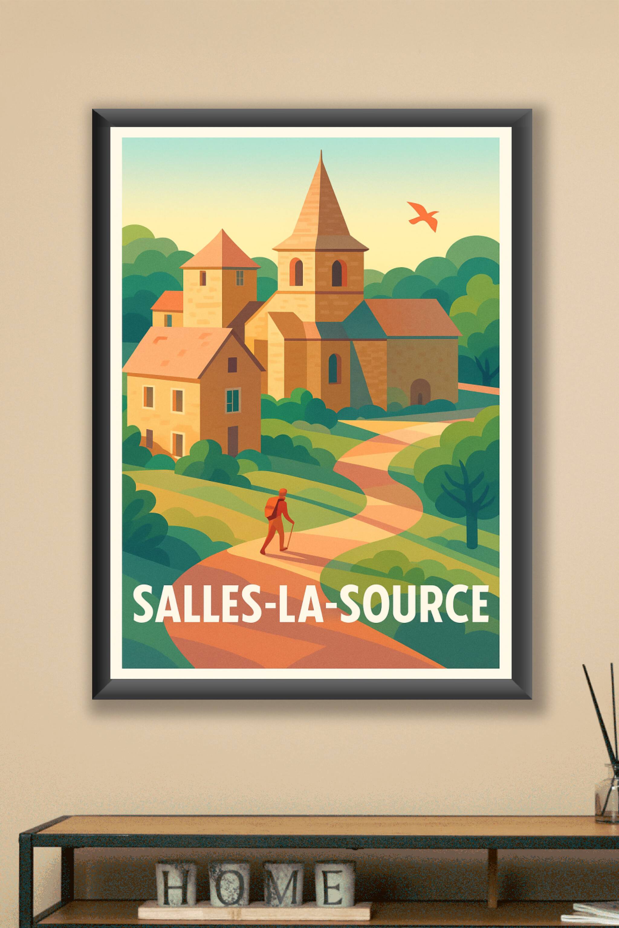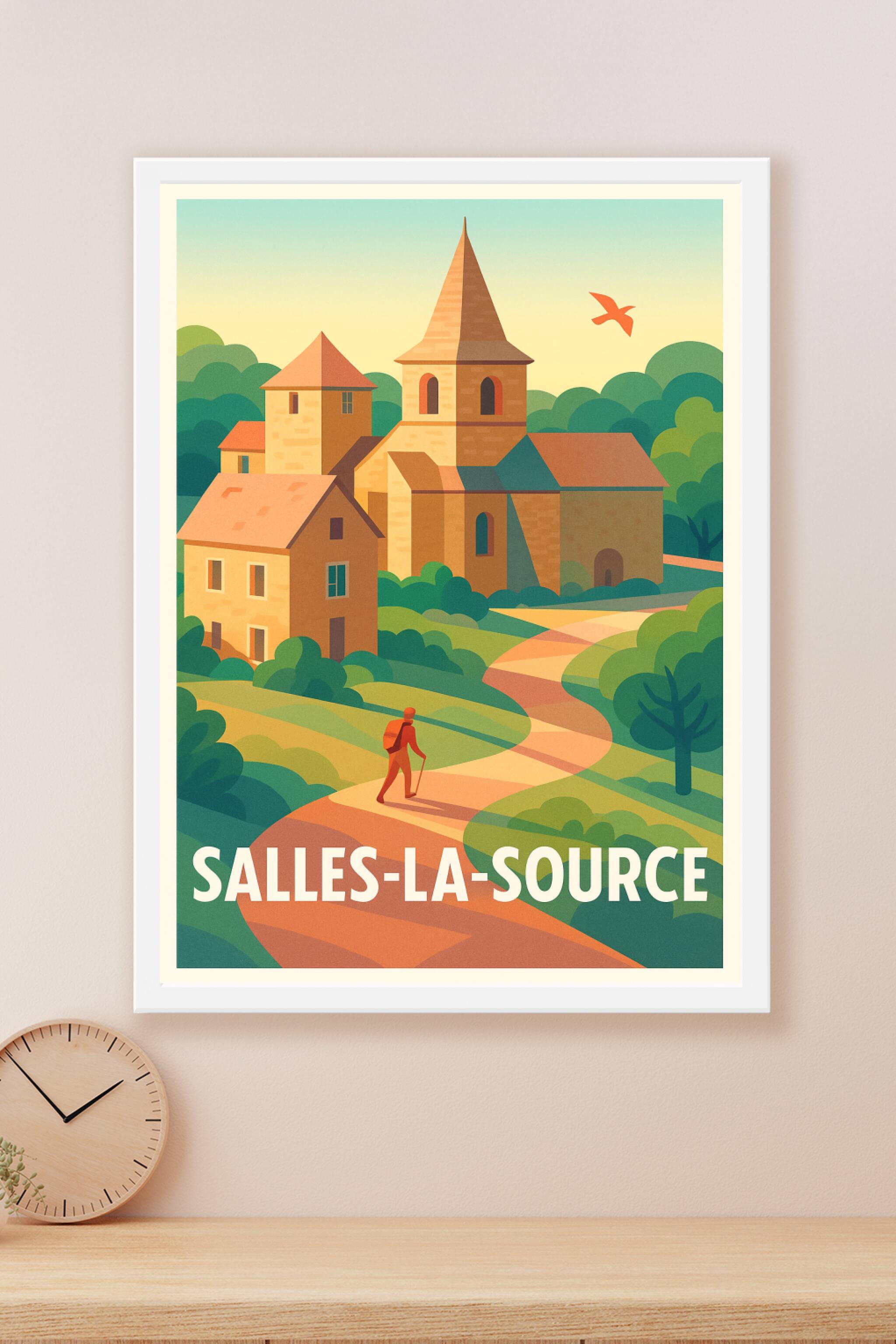 Découvrez l'atmosphère paisible de Salles-la-Source avec cette superbe affiche illustrée, mettant en scène son charme rustique et ses paysages verd...