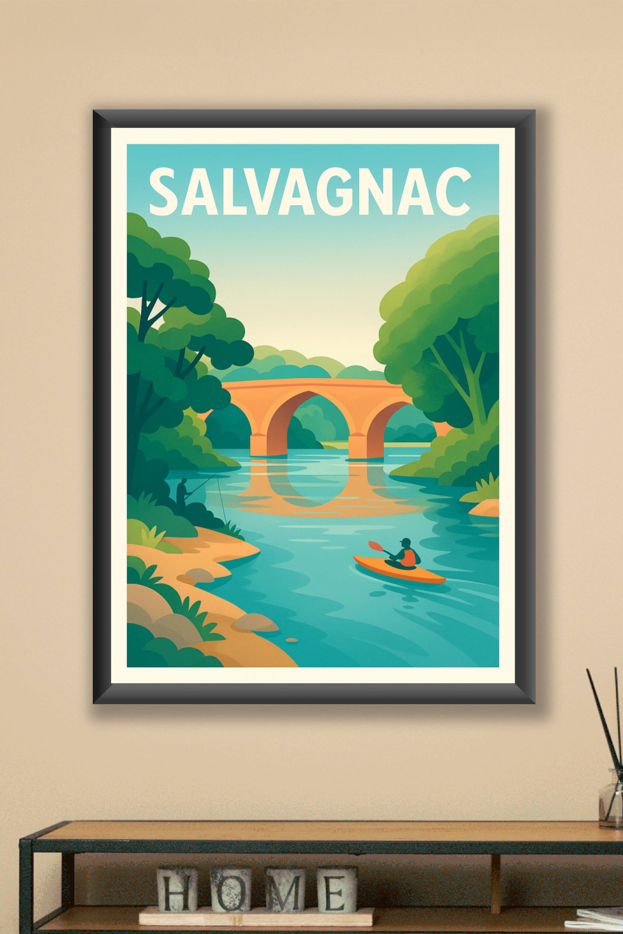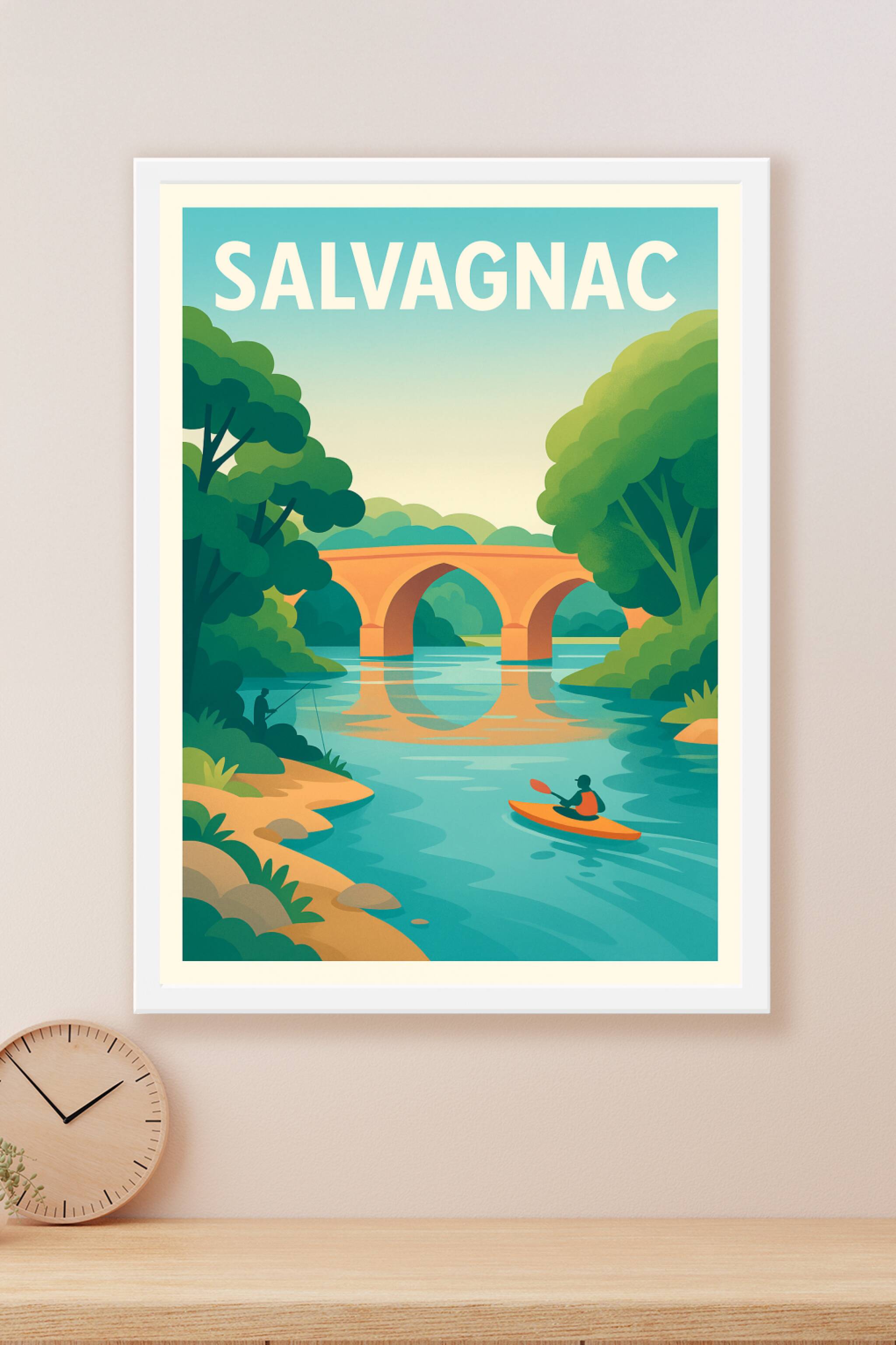 Découvrez la sérénité du paysage de Salvagnac avec cette affiche illustrée mettant en scène un paisible cours d'eau bordé de végétation luxuriante et un pont en pierre aux formes élégantes. Un kayakiste glisse calmement sur l'eau, tandis qu'un pêcheur profite des rives verdoyantes, évoquant une parfaite harmonie entre détente et nature.Ce poster est imprimé en tirage "Fine Art" sur papier 305g coton, garantissant une qualité d'impression exceptionnelle aux couleurs vibrantes et durables. Disponible en formats du A1 au A4, avec ou sans cadre, cette affiche apportera une touche d'authenticité et de fraîcheur à votre décoration intérieure. Fabriquée en France, elle convient parfaitement pour offrir ou embellir votre espace avec un souvenir unique de Salvagnac.