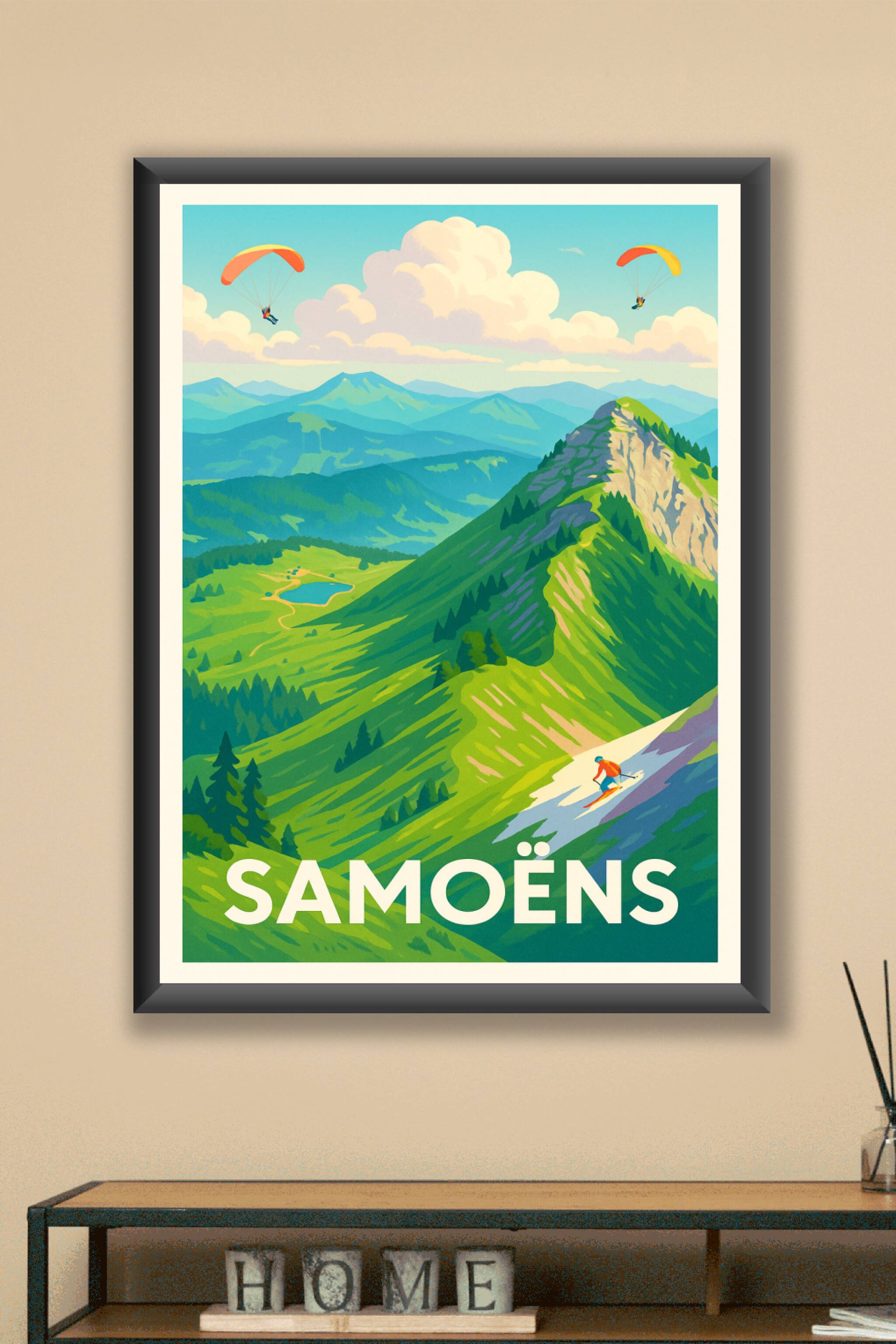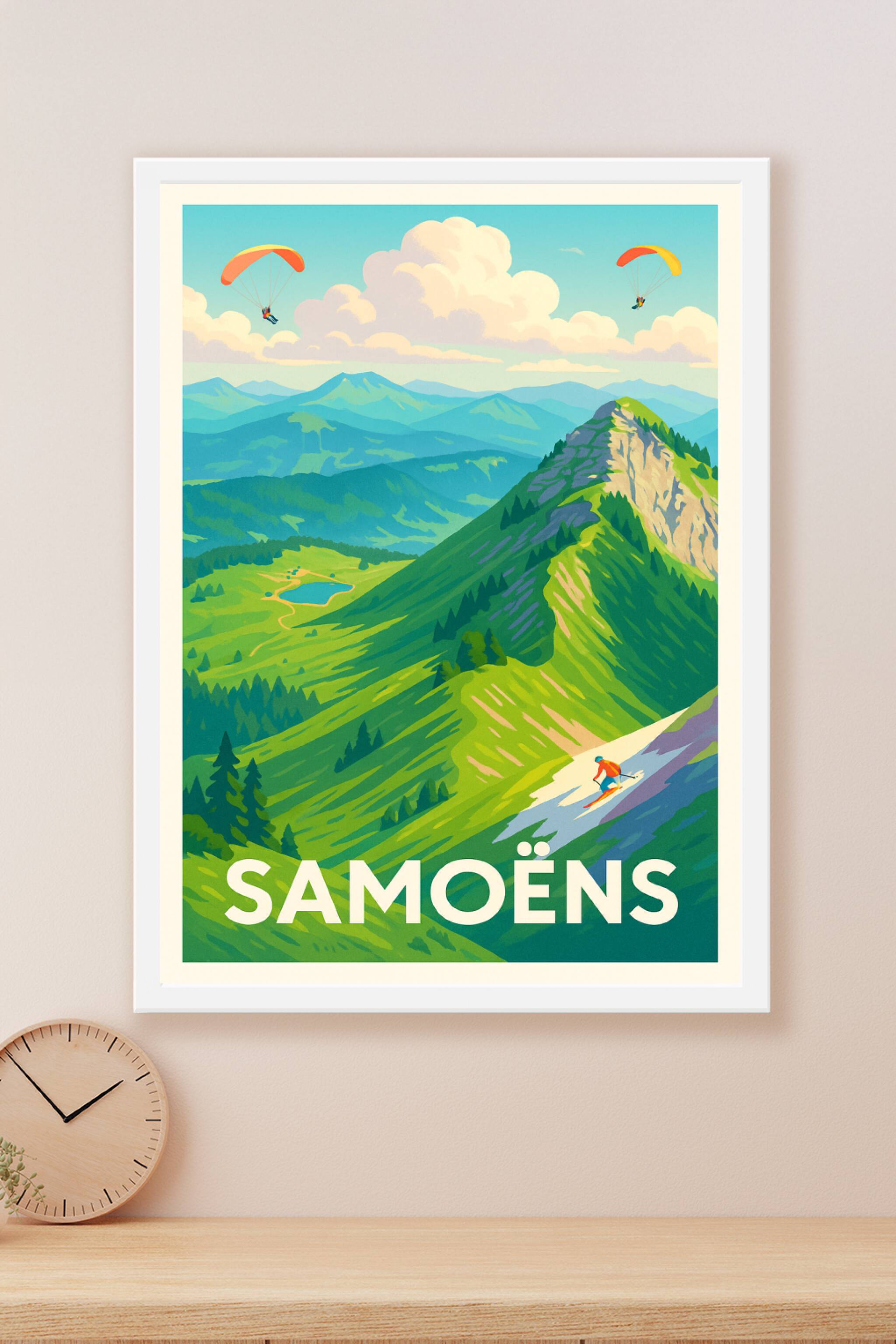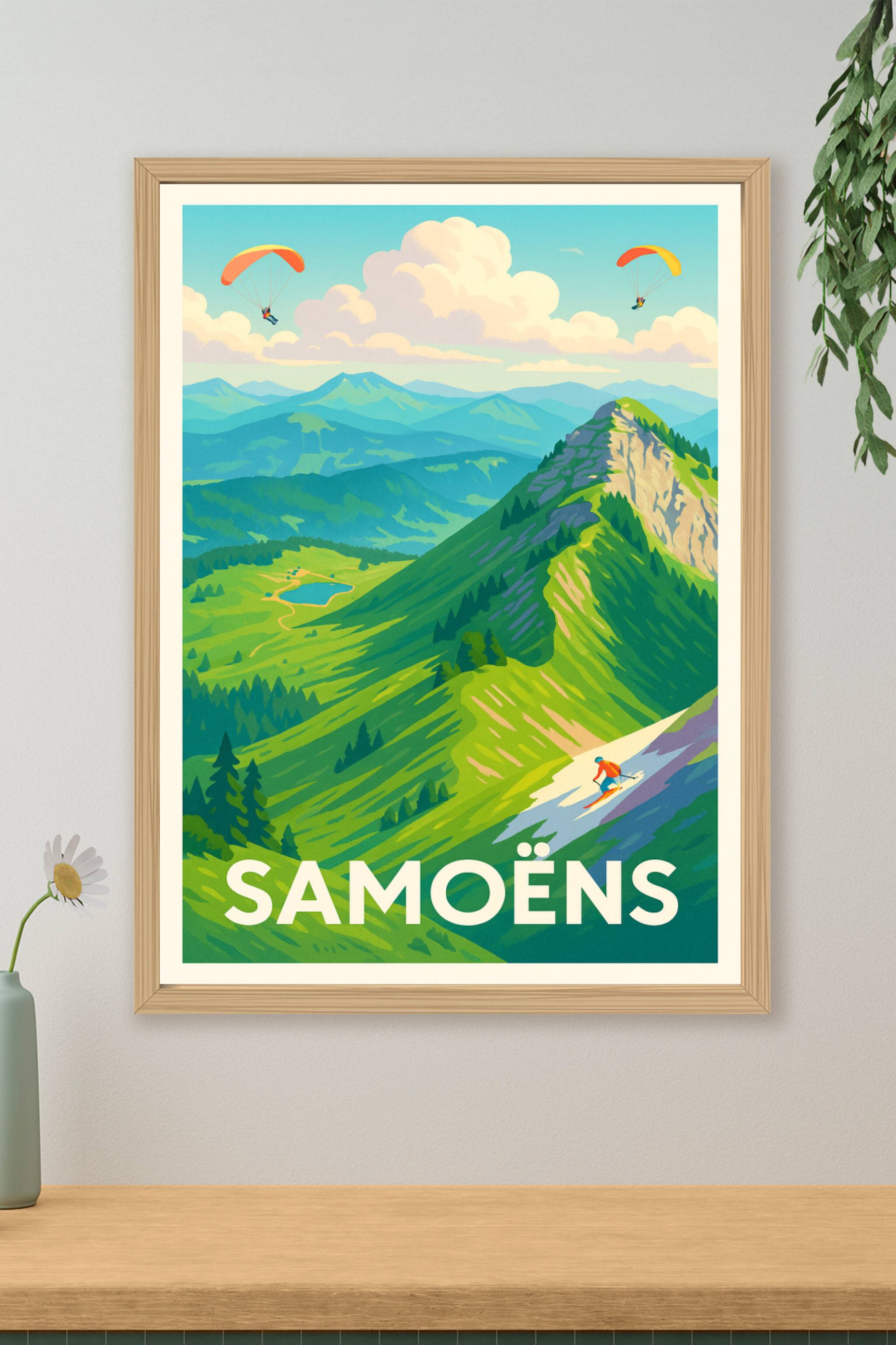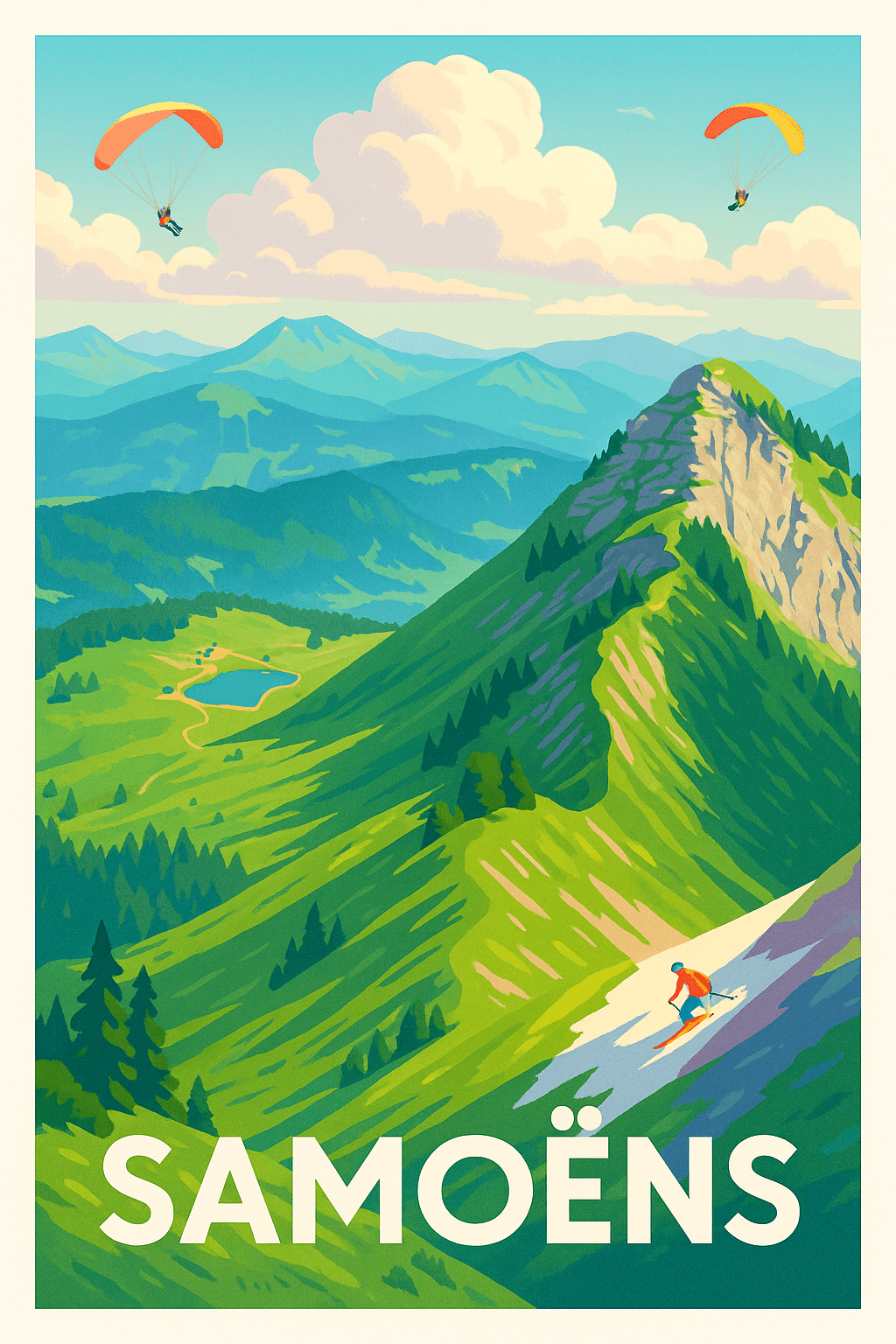 Découvrez la beauté naturelle et l'aventure que Samoëns offre avec cette affiche illustrée mettant en scène ses sommets verdoyants et ses activités...