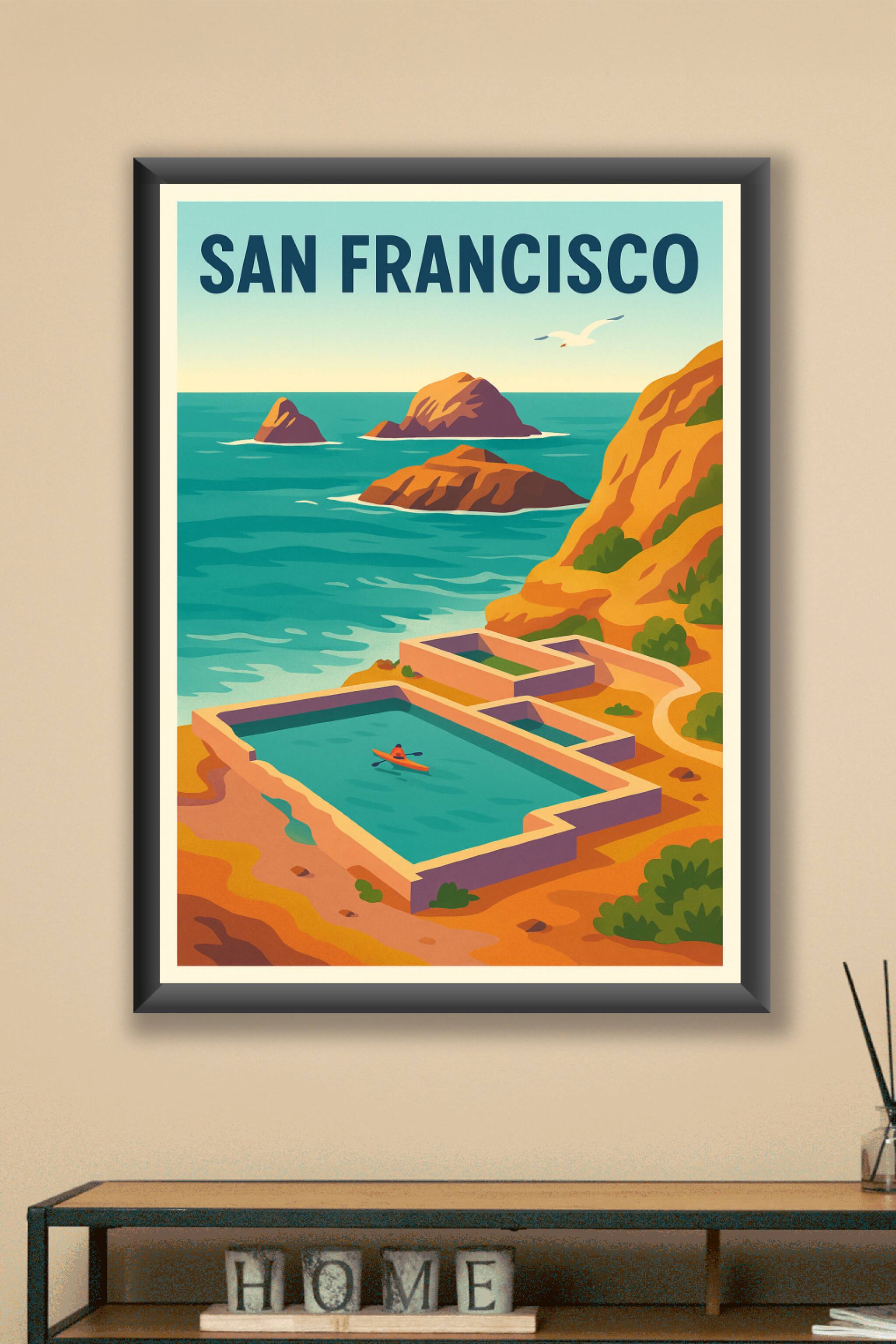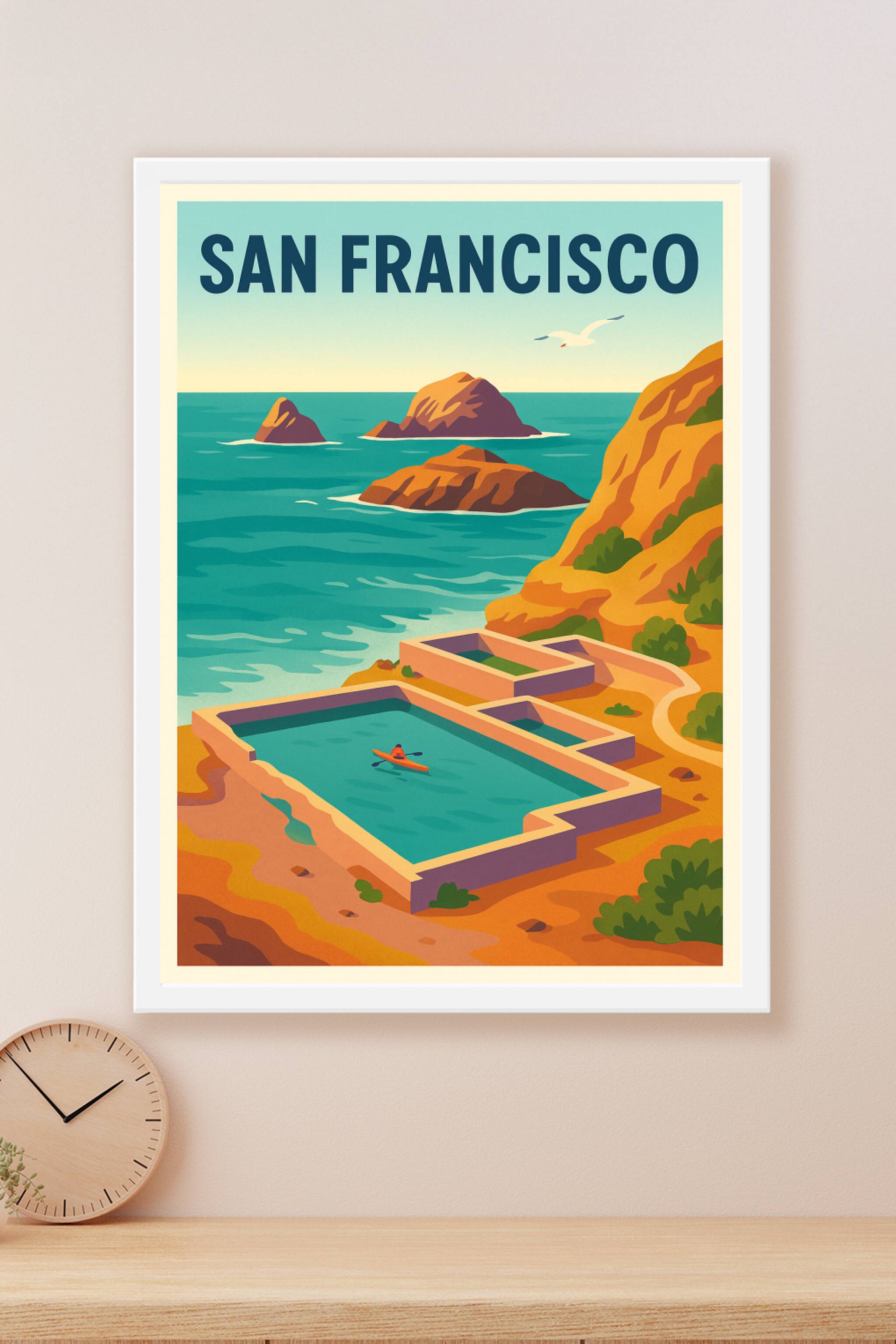 Découvrez la beauté sauvage de San Francisco à travers cette affiche stylisée qui capture une scène côtière paisible avec ses piscines naturelles t...